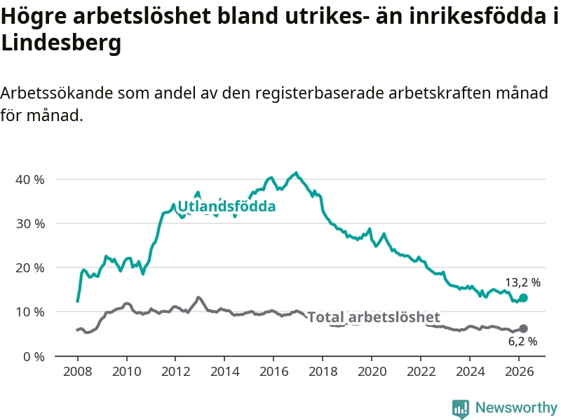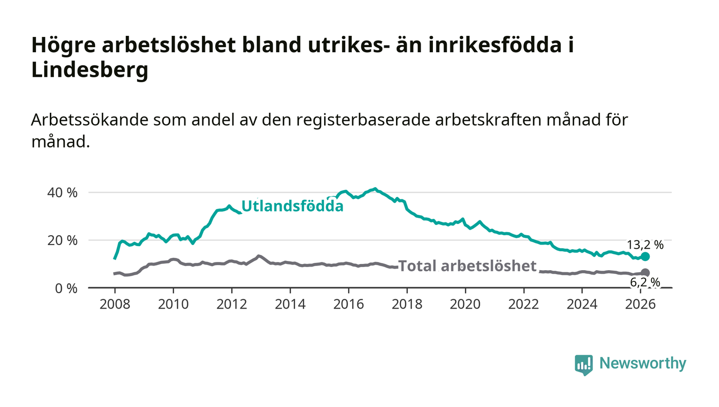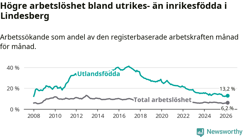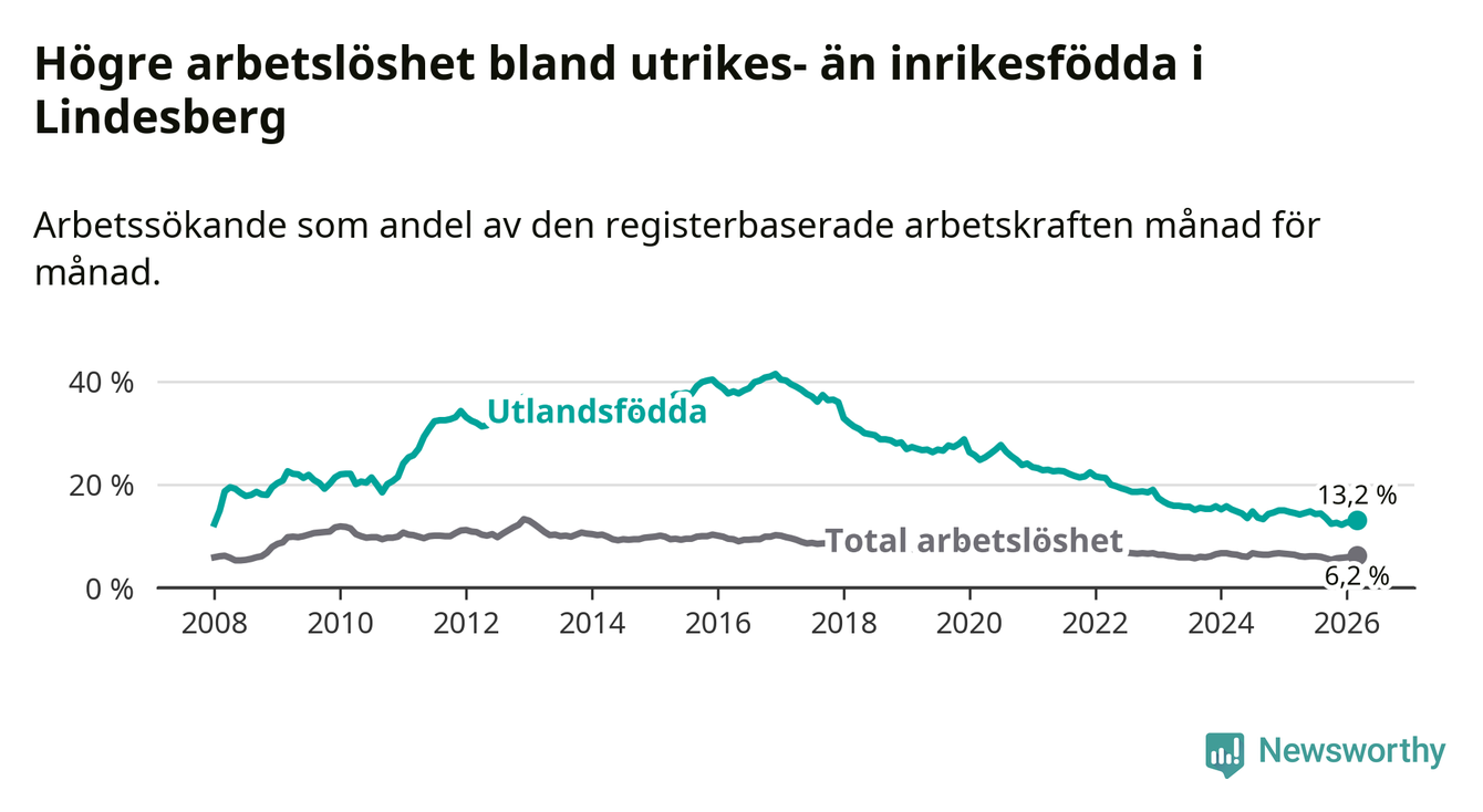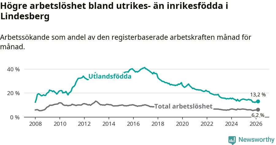 Arbetslösheten bland utlandsfödda var 13,2 procent i Lindesberg under mars månad, motsvarande 252 av 1 909 personer. Det är 1,3 procentenheter färre än vid samma tidpunkt i fjol (−26 om man räknar personer). Därmed är de utlandsföddas arbetslöshet lägre än vid samma tidpunkt i fjol för sjätte månaden i följd.