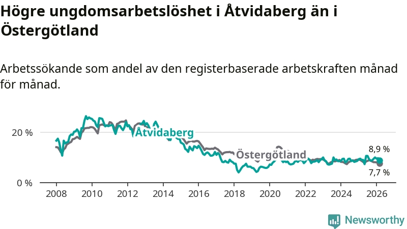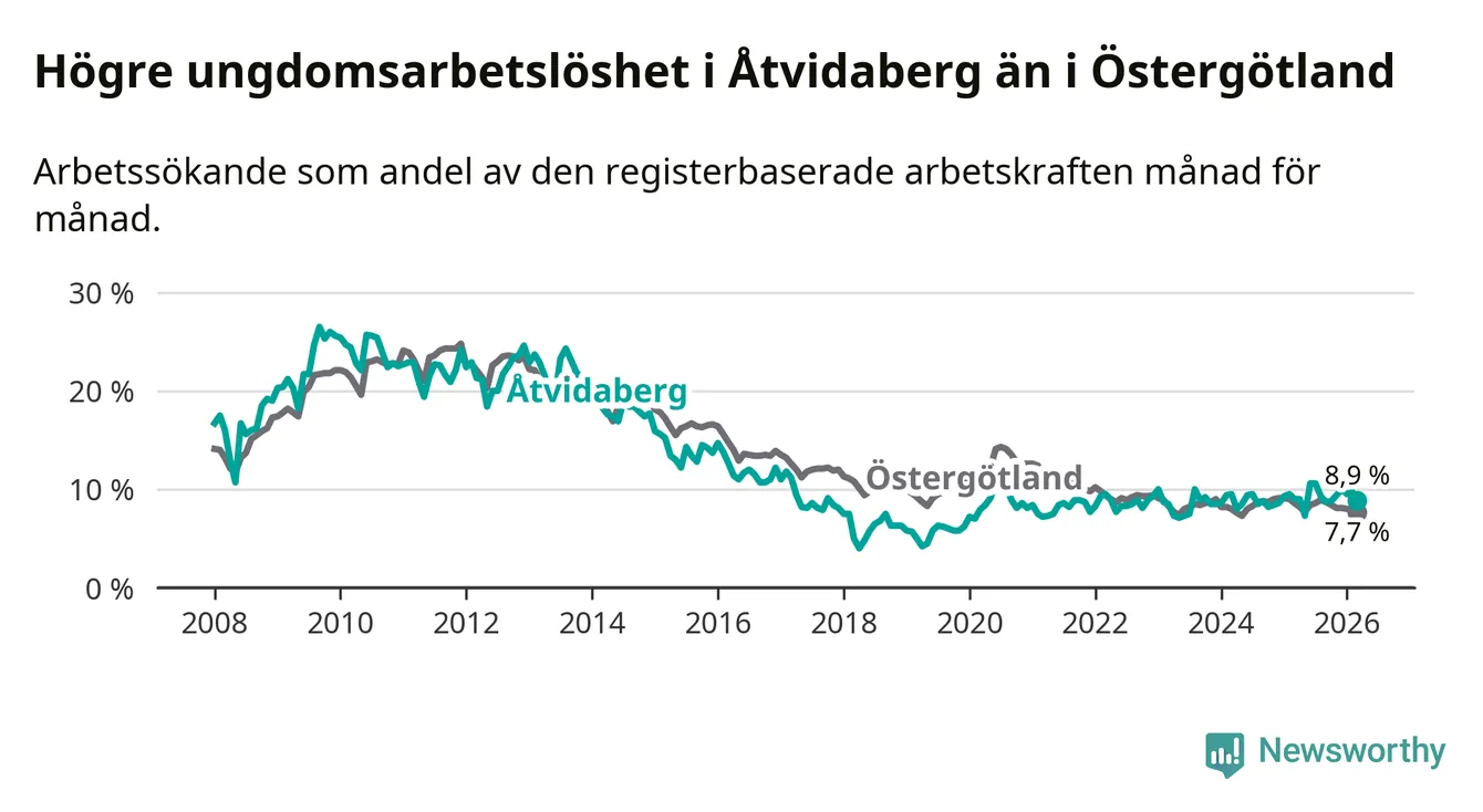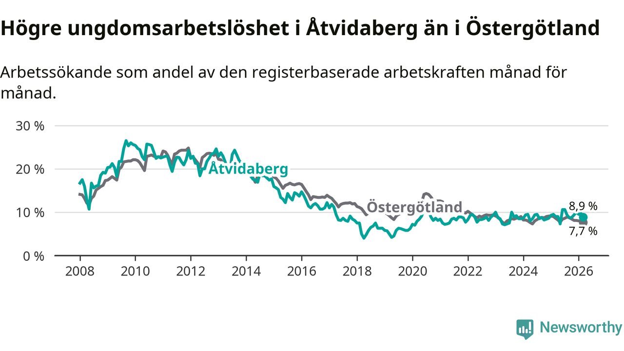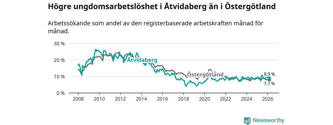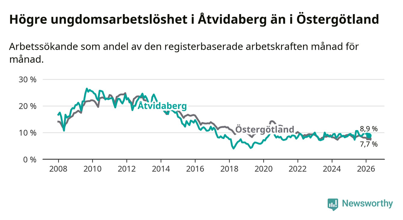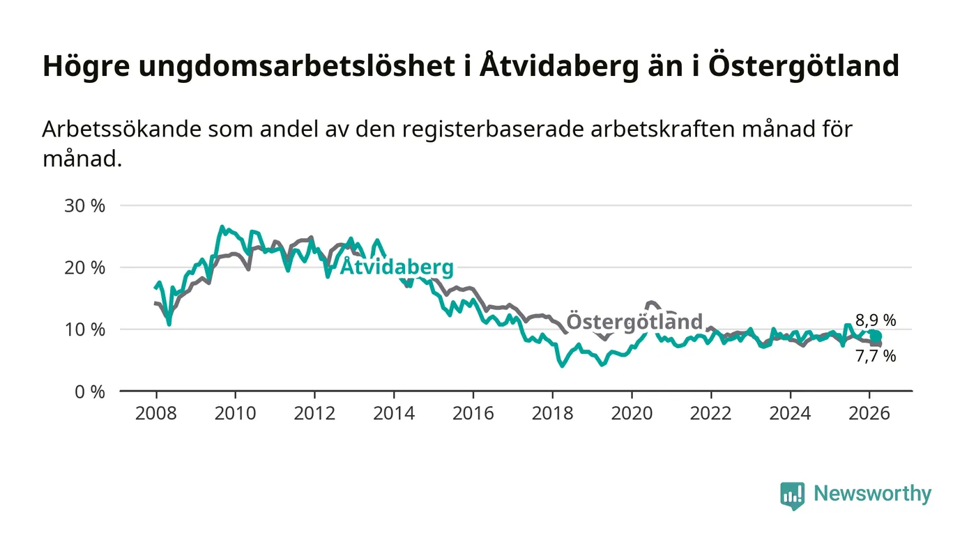 Medan Åtvidaberg har lägre total arbetslöshet än Östergötland, ligger ungdomsarbetslösheten 1,2 procentenheter högre i Åtvidaberg.