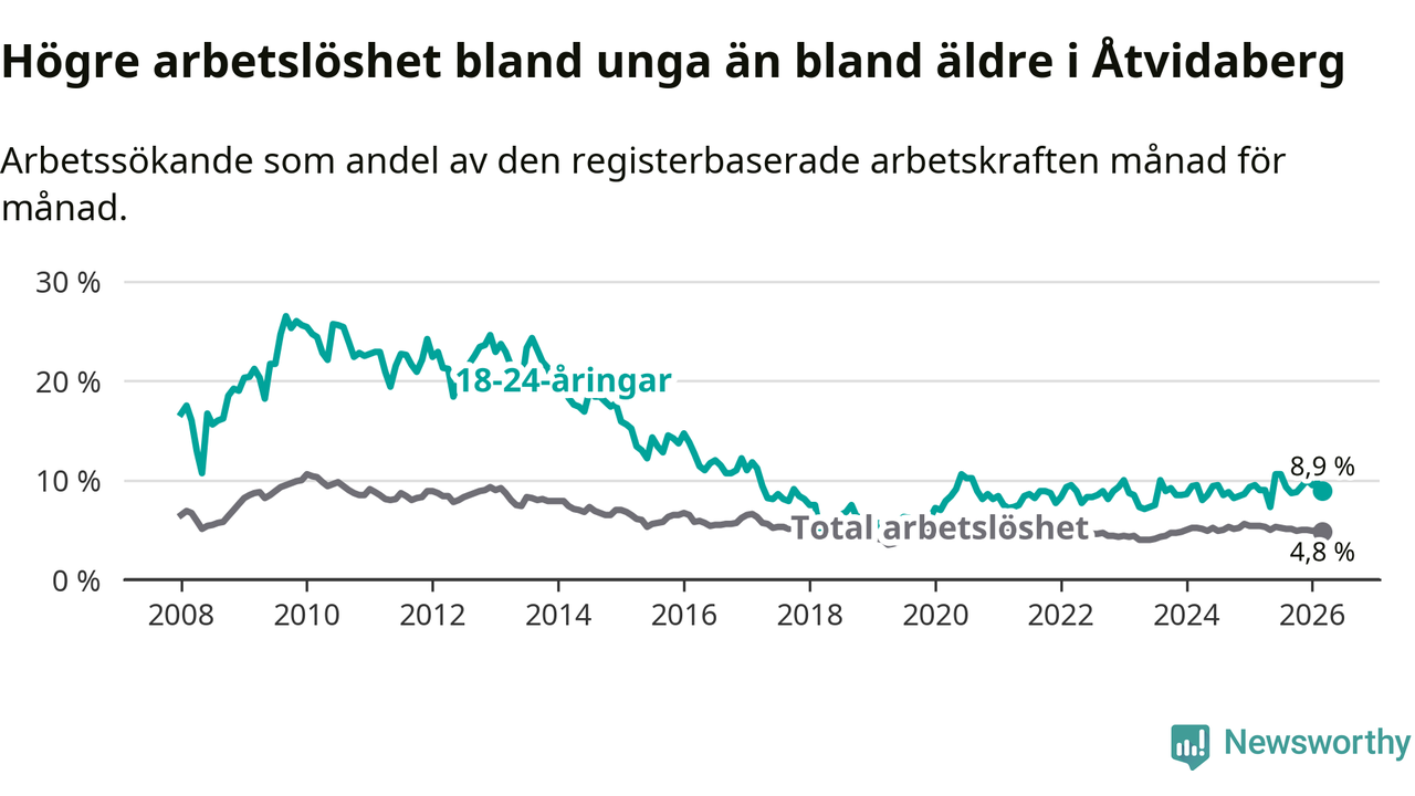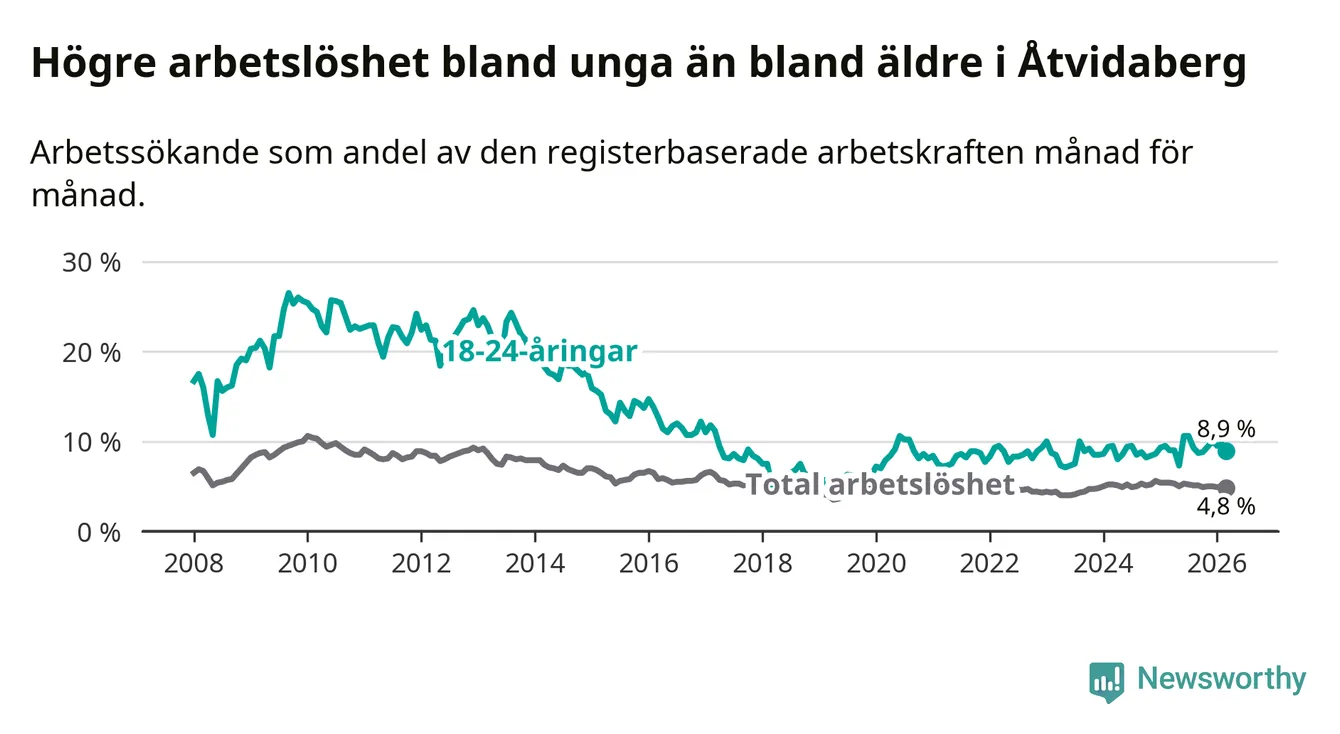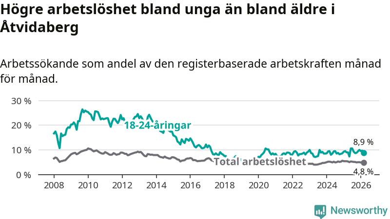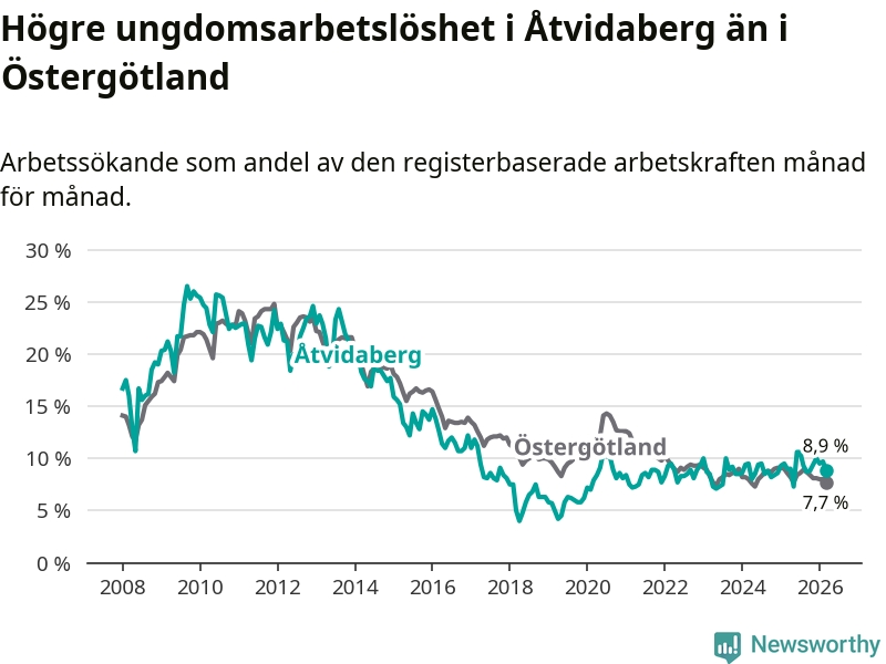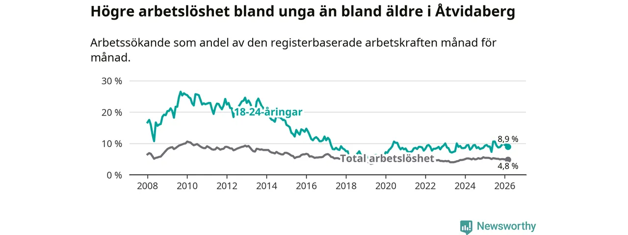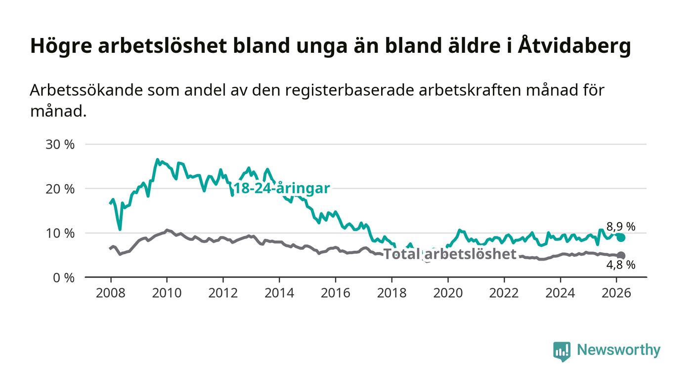 Medan Åtvidaberg har lägre total arbetslöshet än Östergötland, ligger ungdomsarbetslösheten 1,2 procentenheter högre i Åtvidaberg.