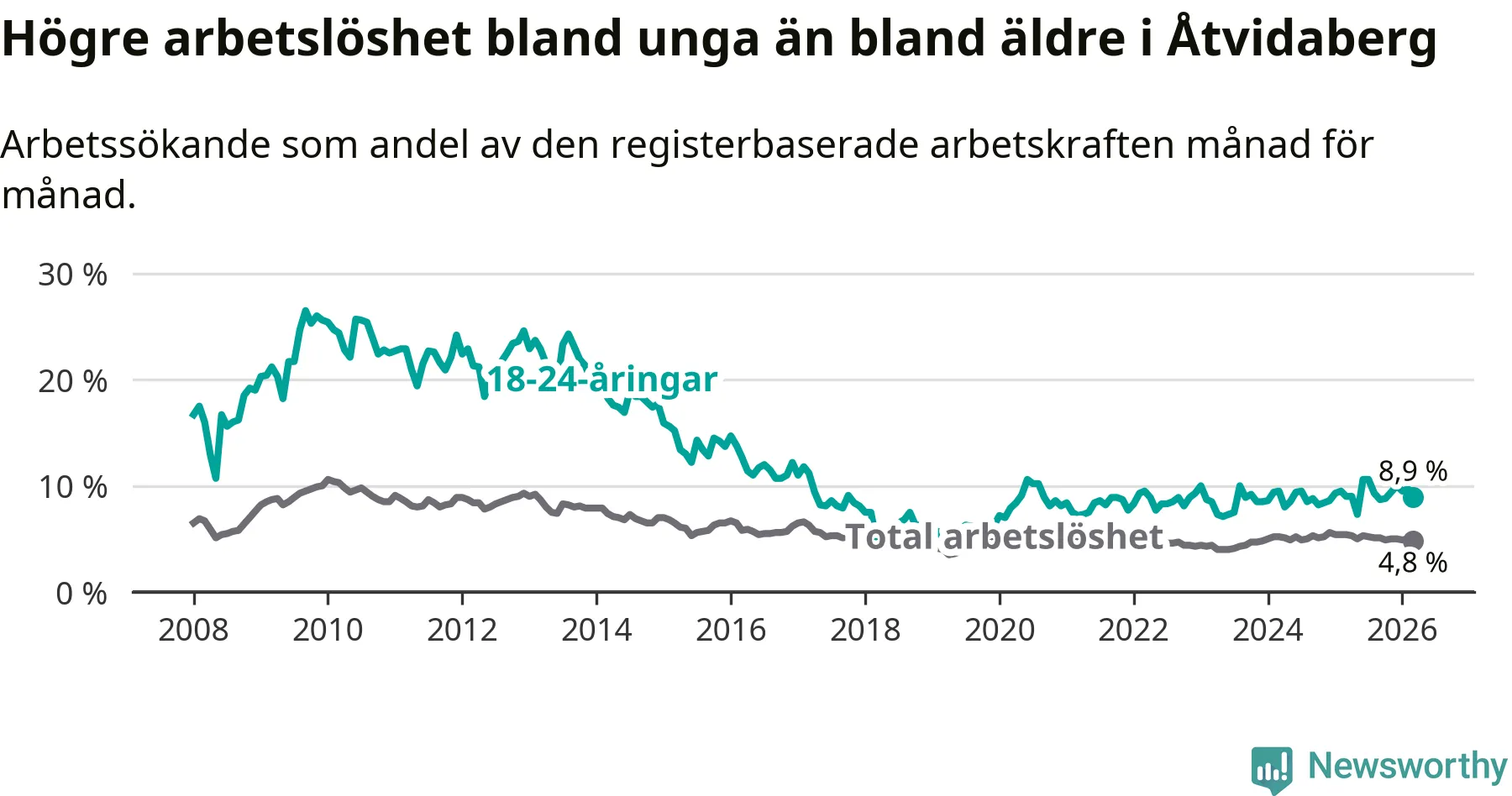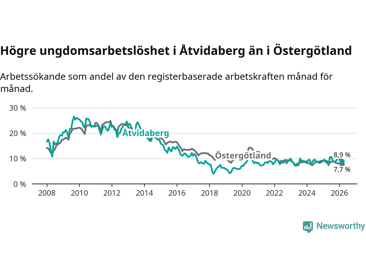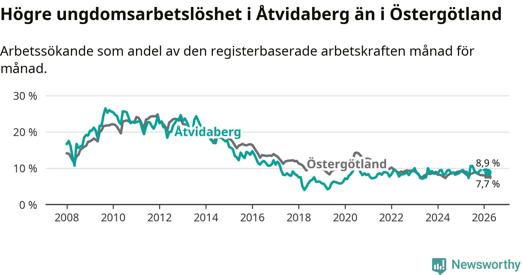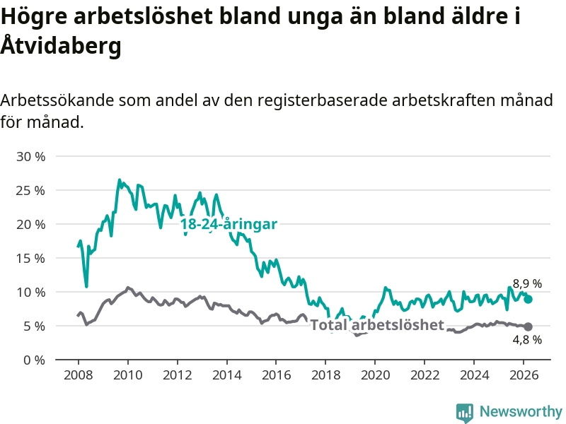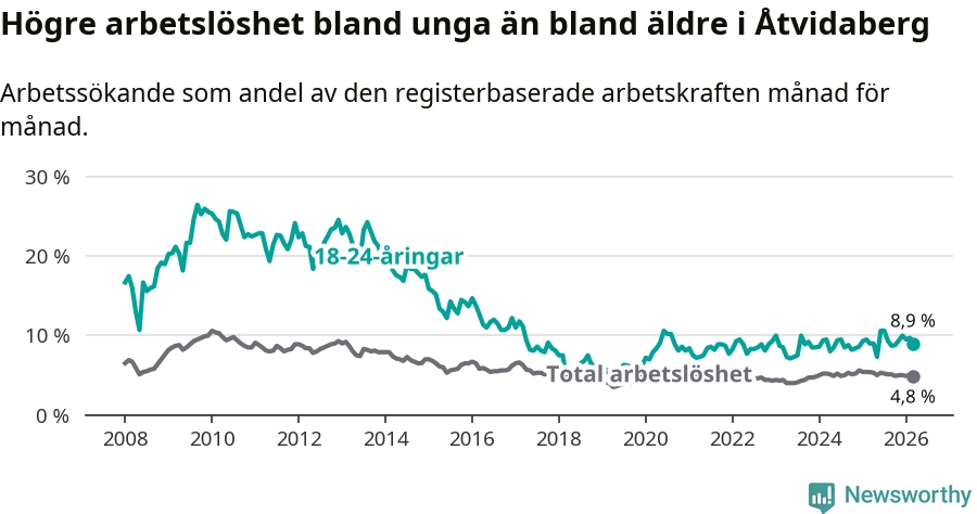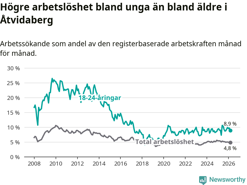 Medan Åtvidaberg har lägre total arbetslöshet än Östergötland, ligger ungdomsarbetslösheten 1,2 procentenheter högre i Åtvidaberg.