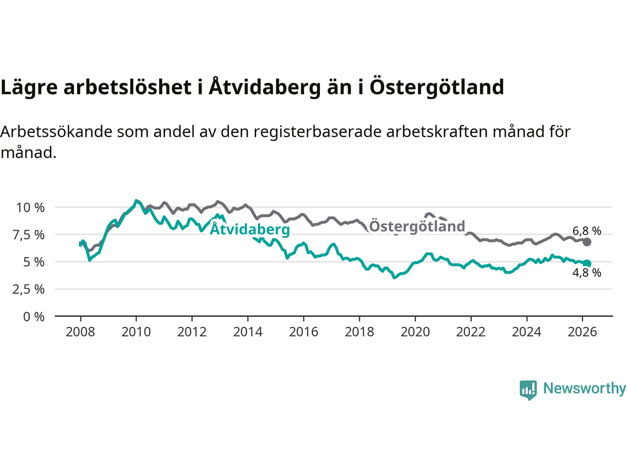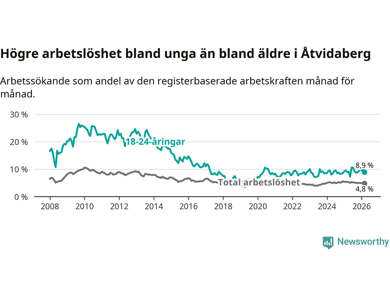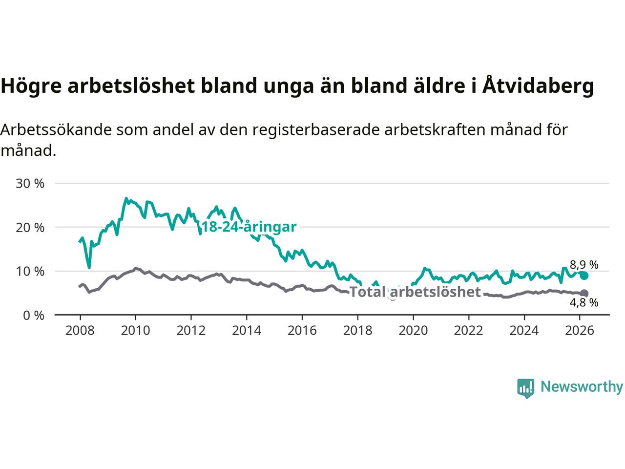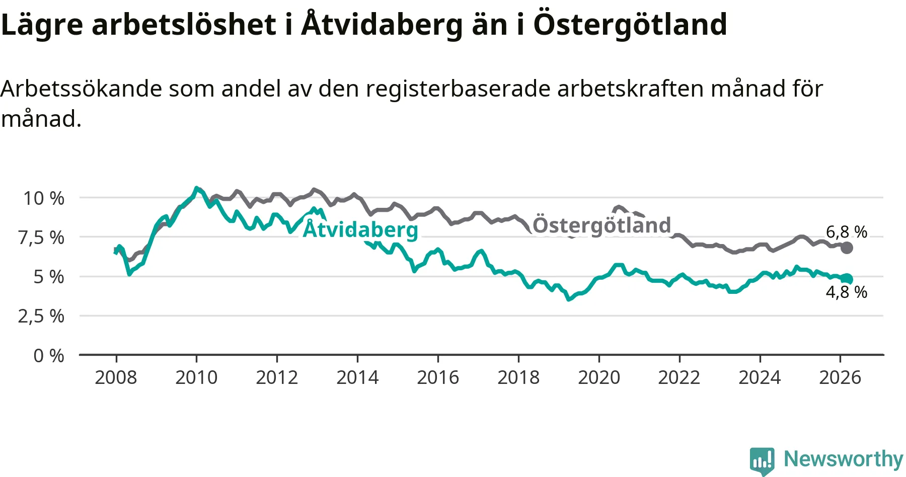 Medan Åtvidaberg har lägre total arbetslöshet än Östergötland, ligger ungdomsarbetslösheten 1,2 procentenheter högre i Åtvidaberg.