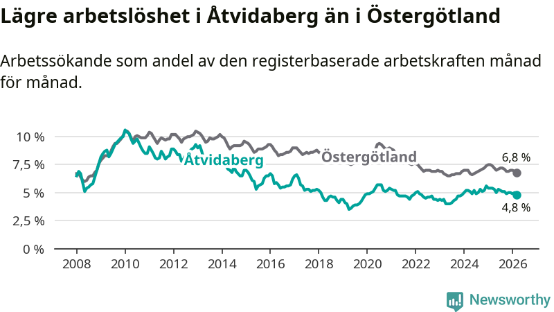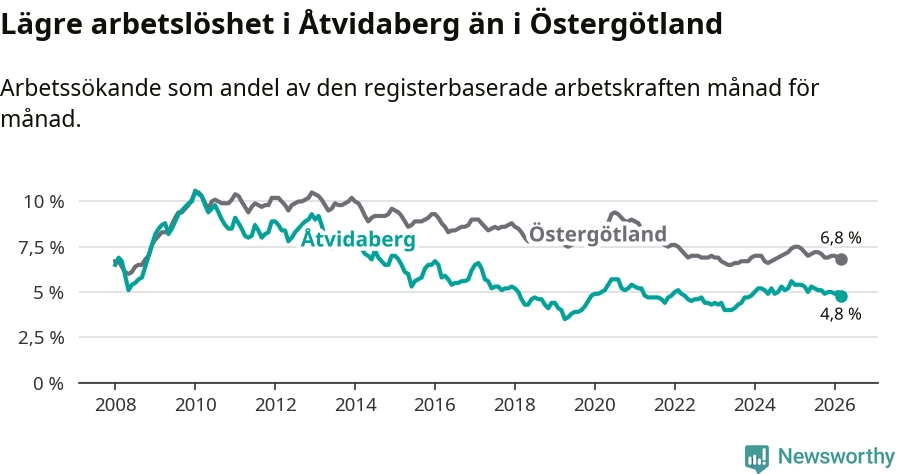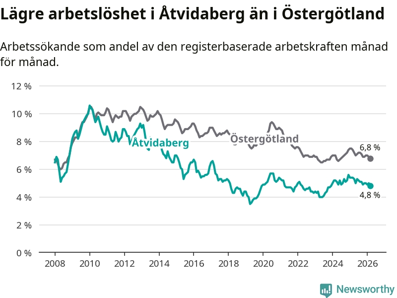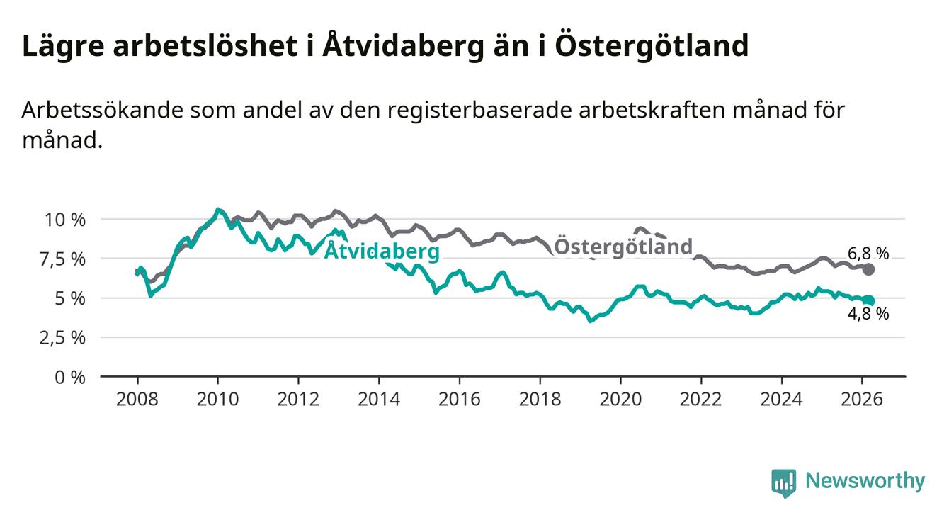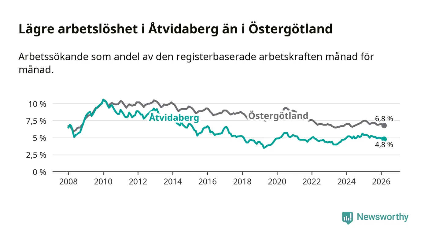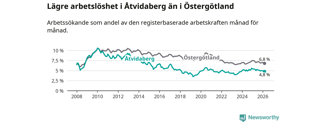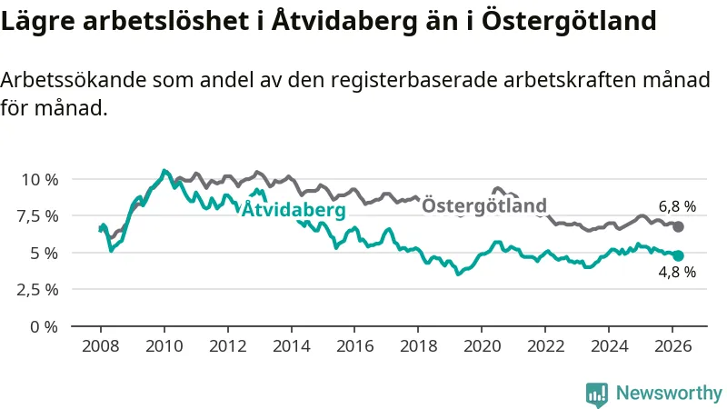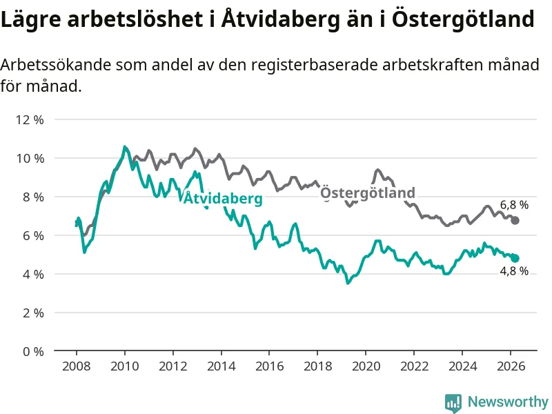 Det är sjunde månaden i följd som arbetslösheten i Åtvidaberg är lägre än den var under samma tidpunkt året innan. Den nuvarande arbetslöshetsnivån är därmed den lägsta sedan december 2023.