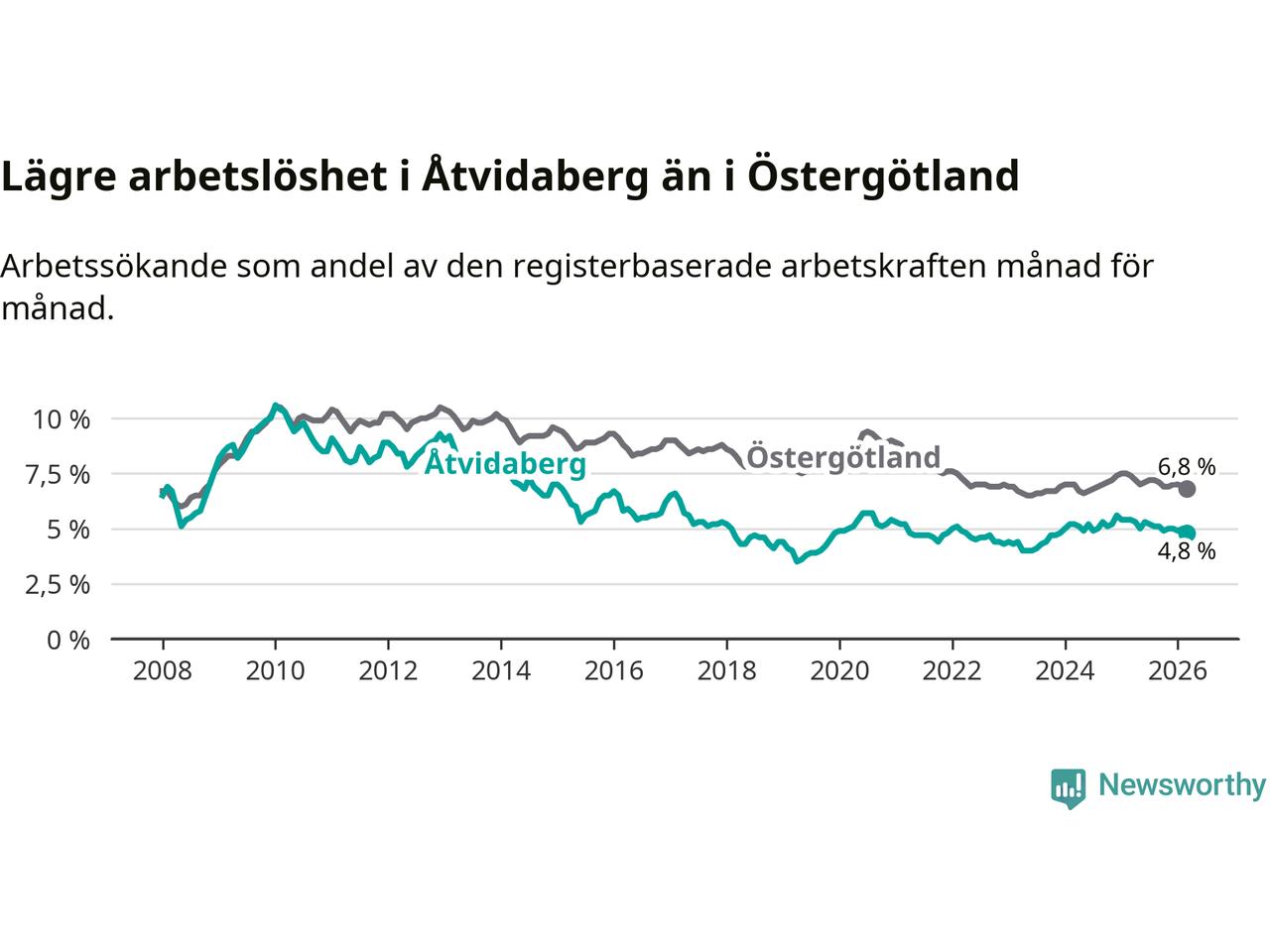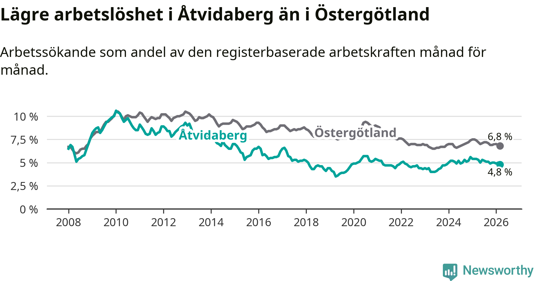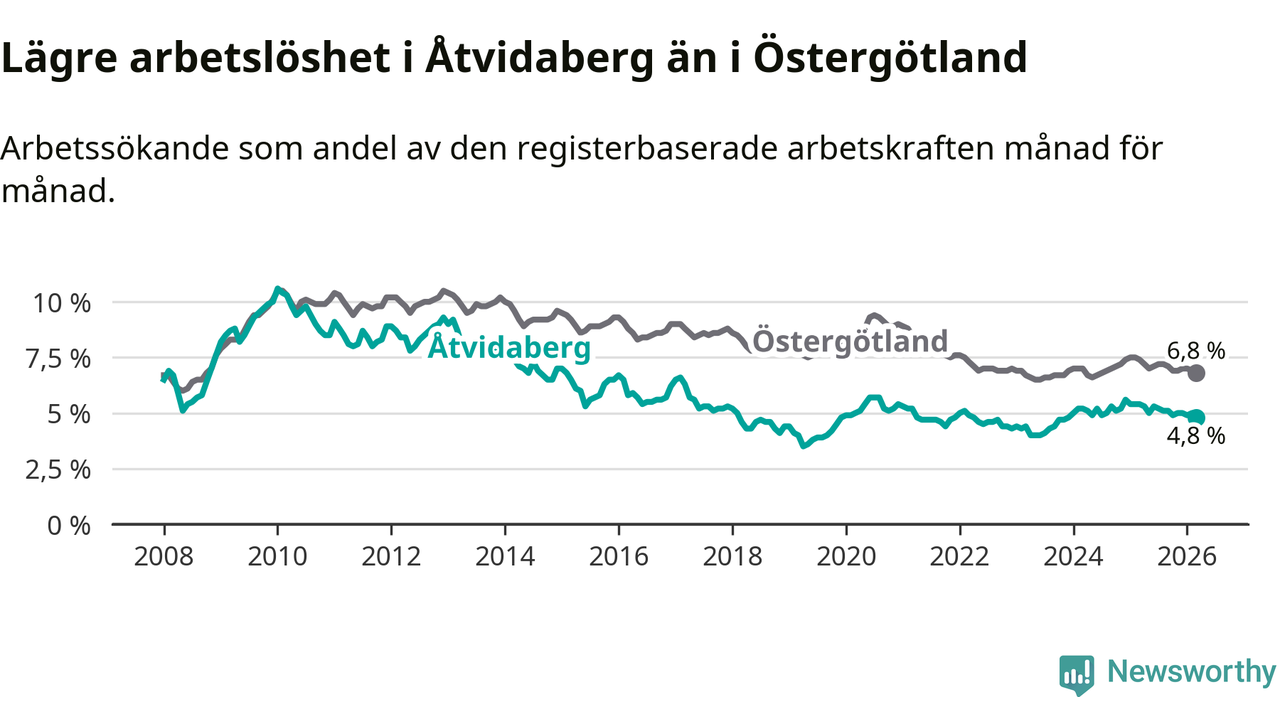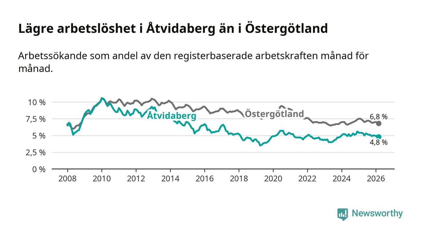 Under mars månad rapporterade Åtvidabergs kommun en total arbetslöshet på 4,8 procent. Det är en minskning jämfört med samma tidpunkt i fjol (−0,6 procentenheter). Även i Östergötlands län sjunker arbetslösheten .