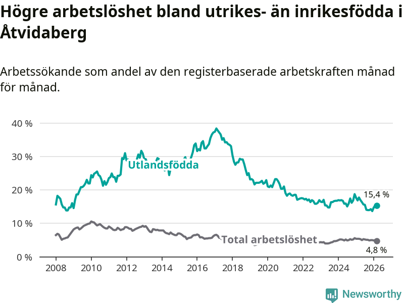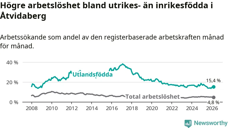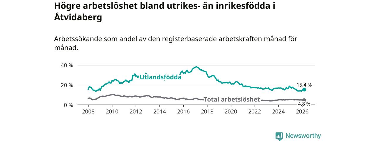 Arbetslösheten bland utlandsfödda var 15,4 procent i Åtvidaberg under mars månad, motsvarande 87 av 565 personer. Det är 2,4 procentenheter färre än vid samma tidpunkt i fjol (−9 om man räknar personer). Därmed är de utlandsföddas arbetslöshet lägre än vid samma tidpunkt i fjol för åttonde månaden i följd.
