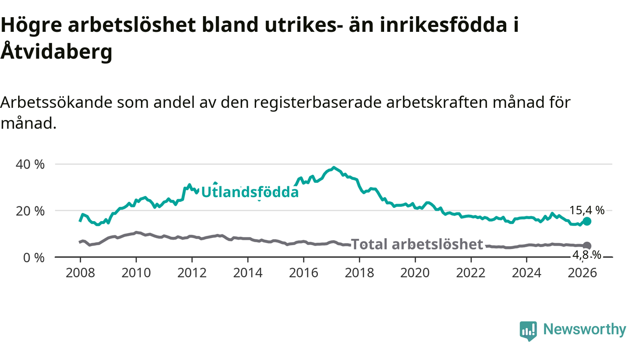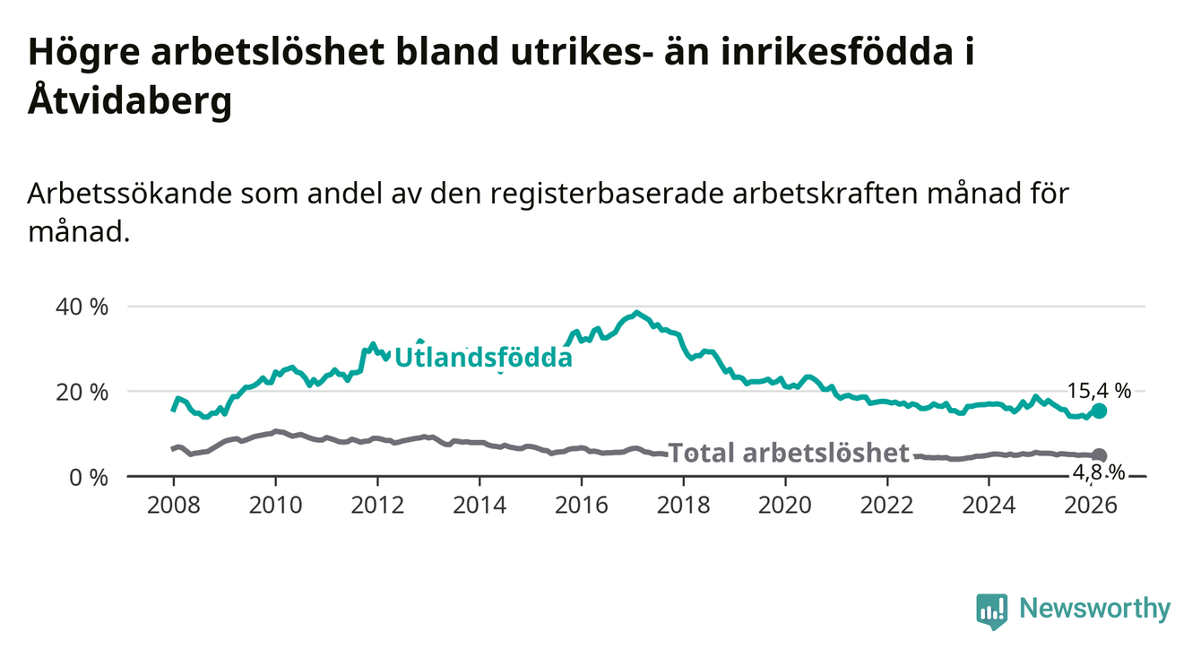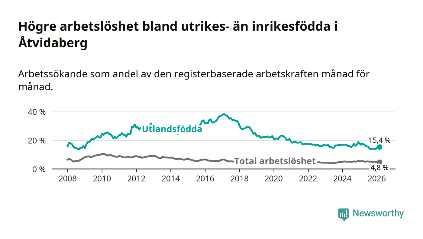 Skillnaden i arbetslöshet mellan utrikesfödda och hela befolkningen är 10,6 procentenheter i Åtvidaberg. Det är en betydligt mindre skillnad än för ett år sedan (−1,8 procentenheter).