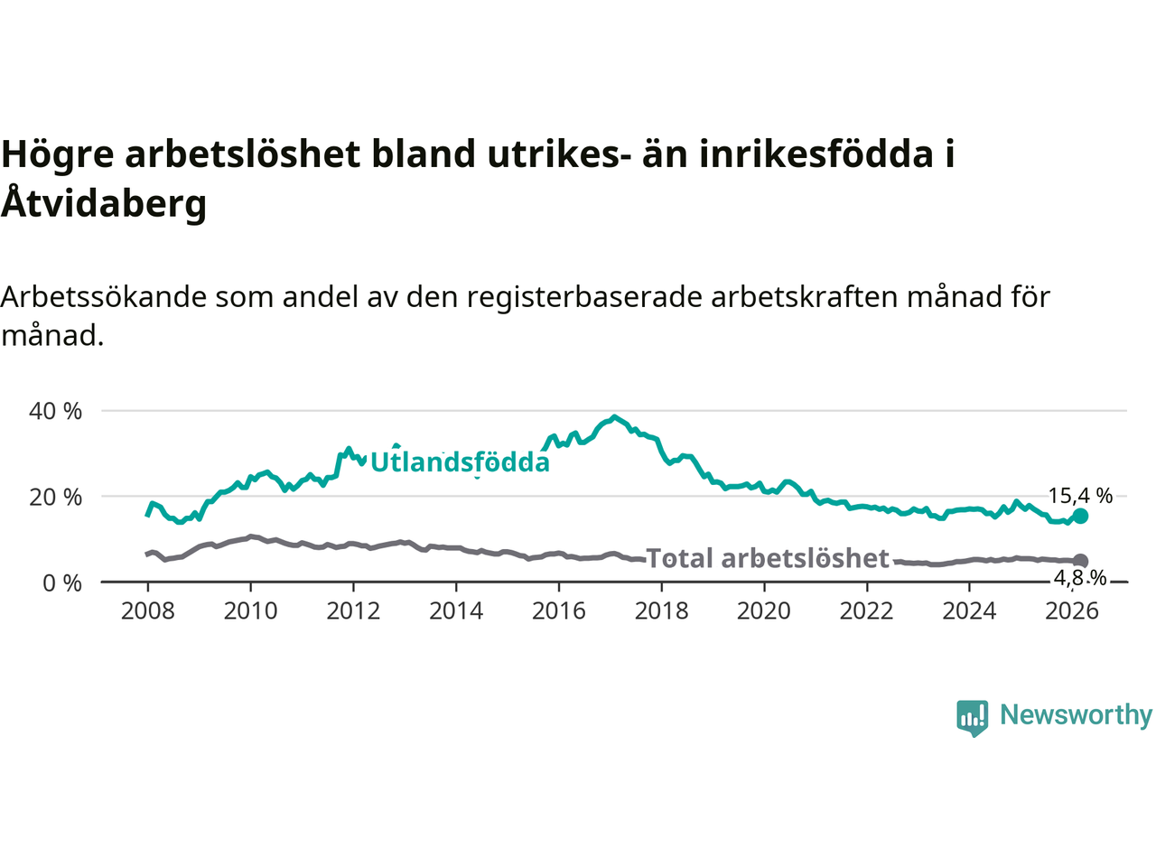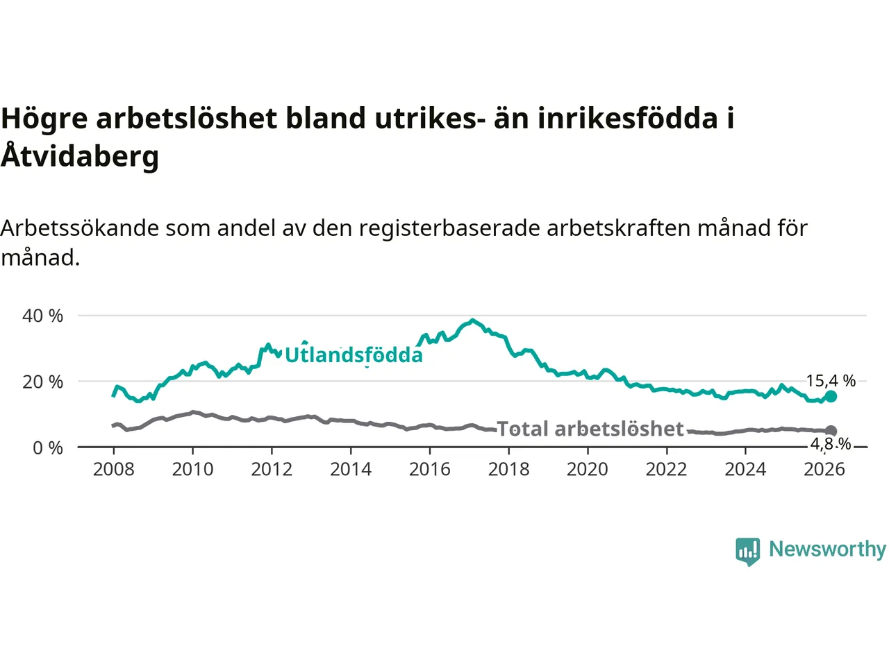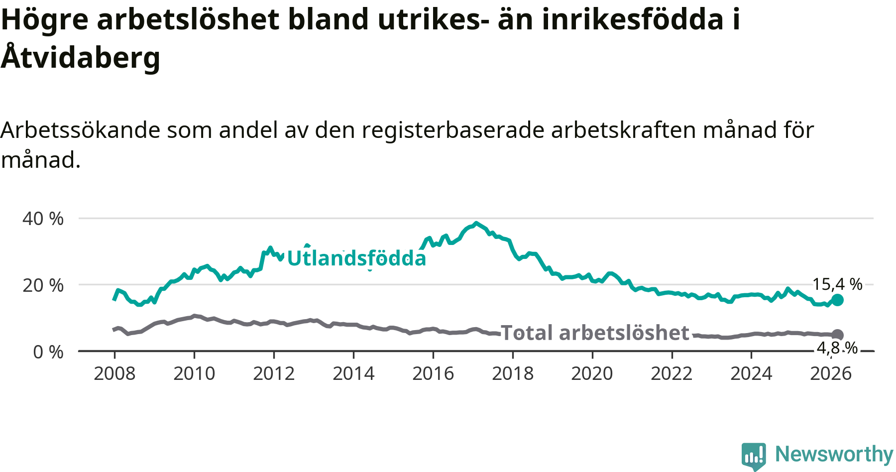 | Bland utlandsfödda | 15,4 % | −2,4 % ▼ | 16,7 % | −2,5 % ▼ | 14,1 % | −1,5 % ▼ |