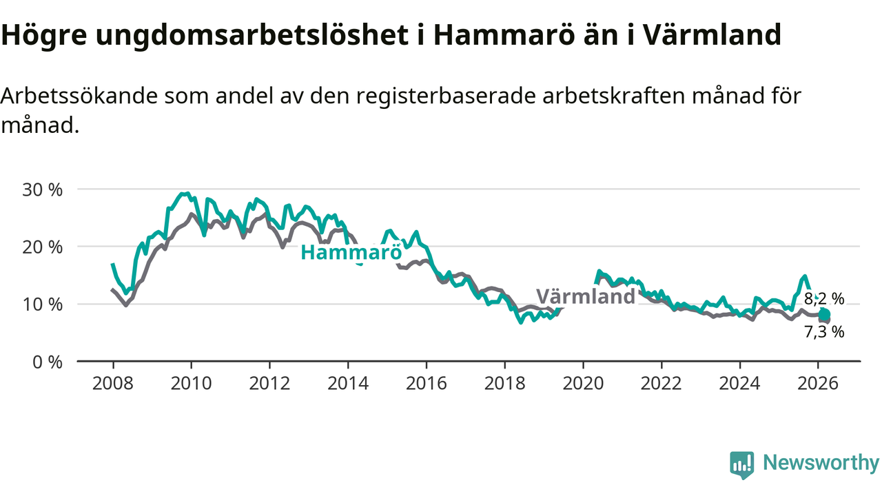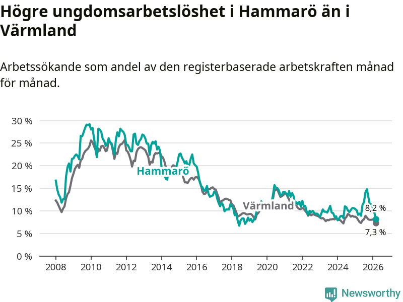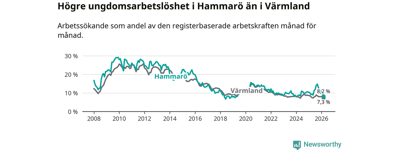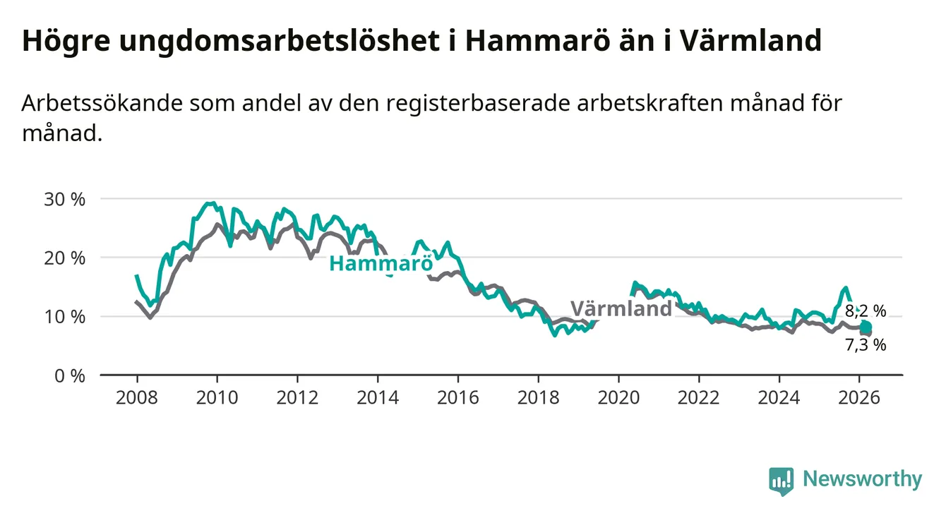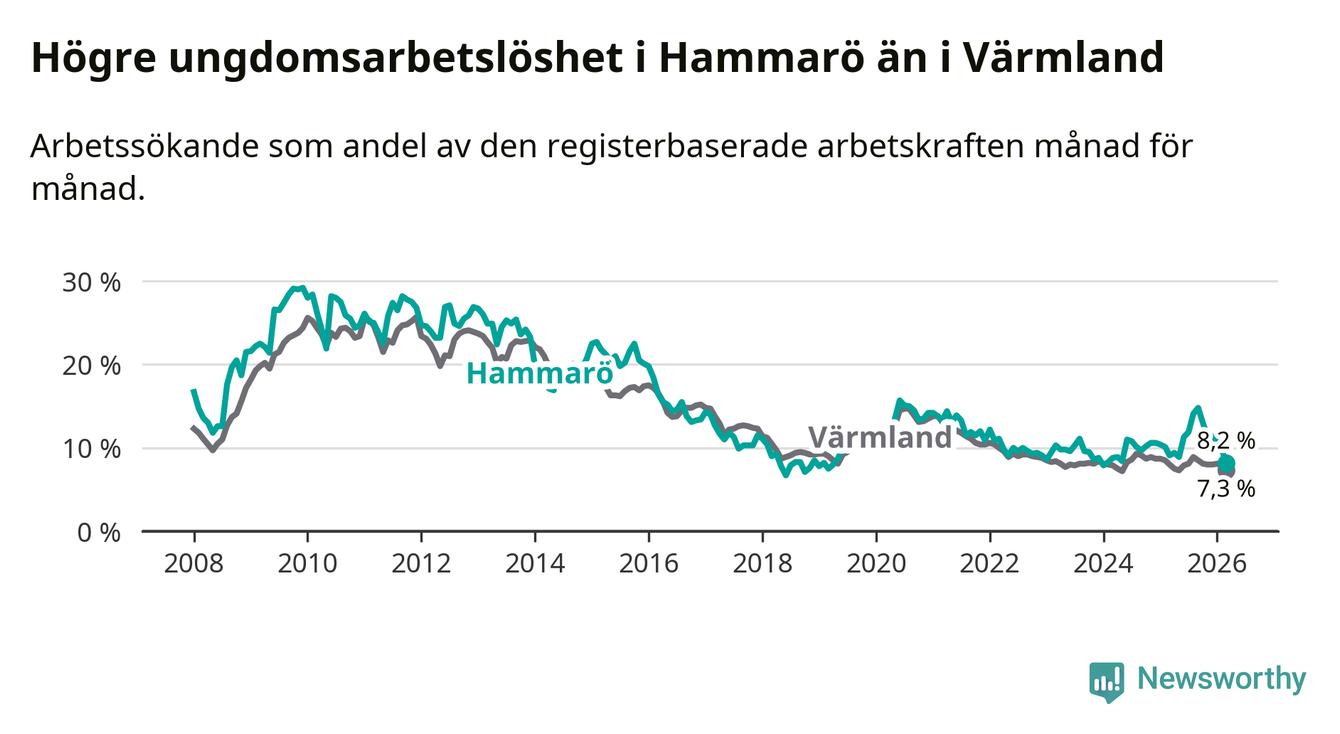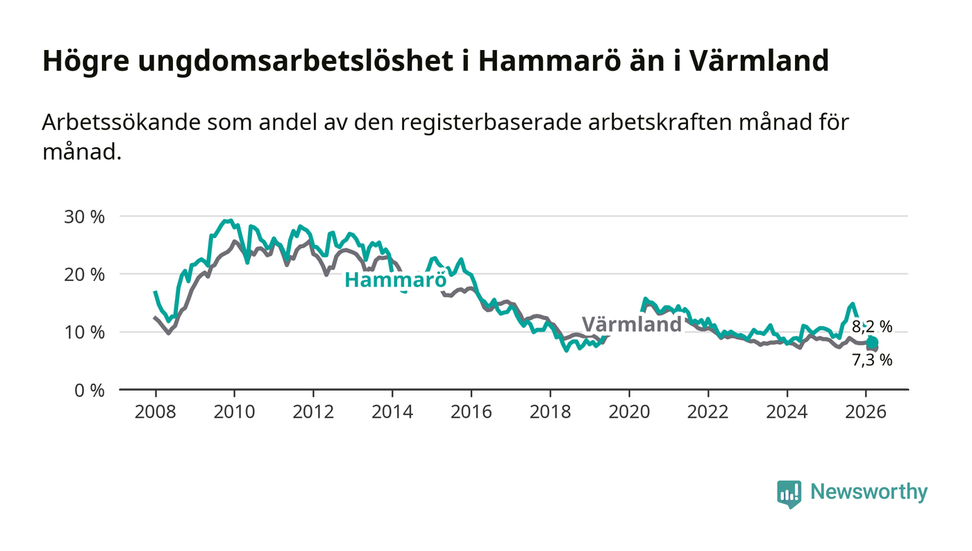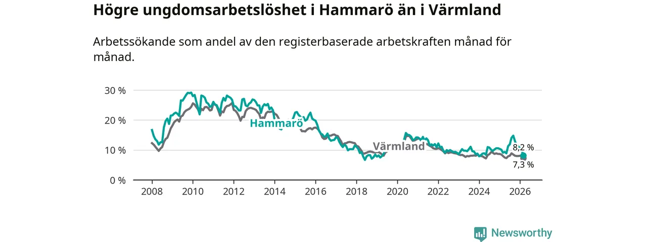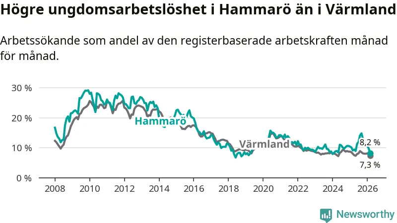 Medan Hammarö har lägre total arbetslöshet än Värmland, ligger ungdomsarbetslösheten 0,9 procentenheter högre på Hammarö.
