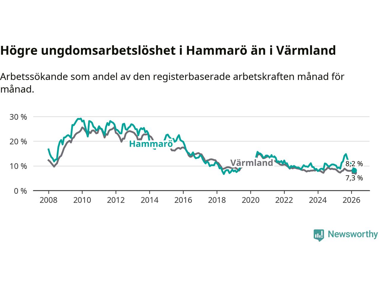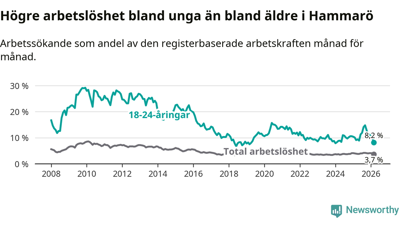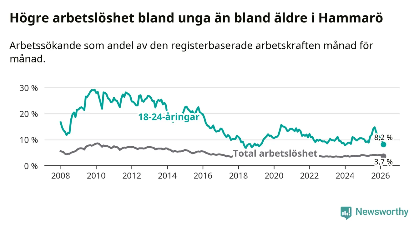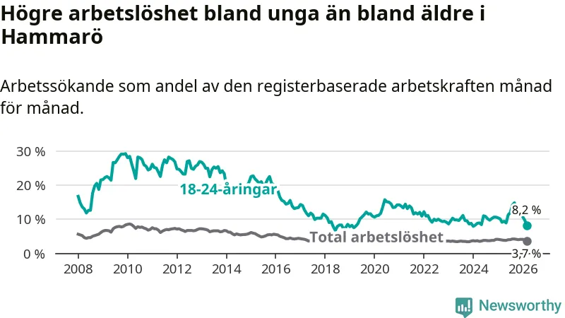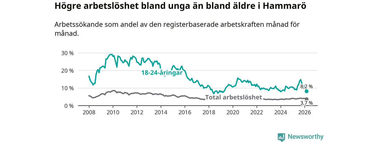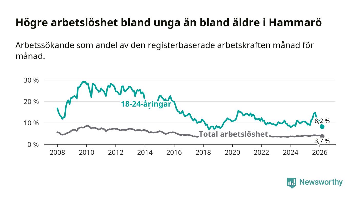 Medan Hammarö har lägre total arbetslöshet än Värmland, ligger ungdomsarbetslösheten 0,9 procentenheter högre på Hammarö.