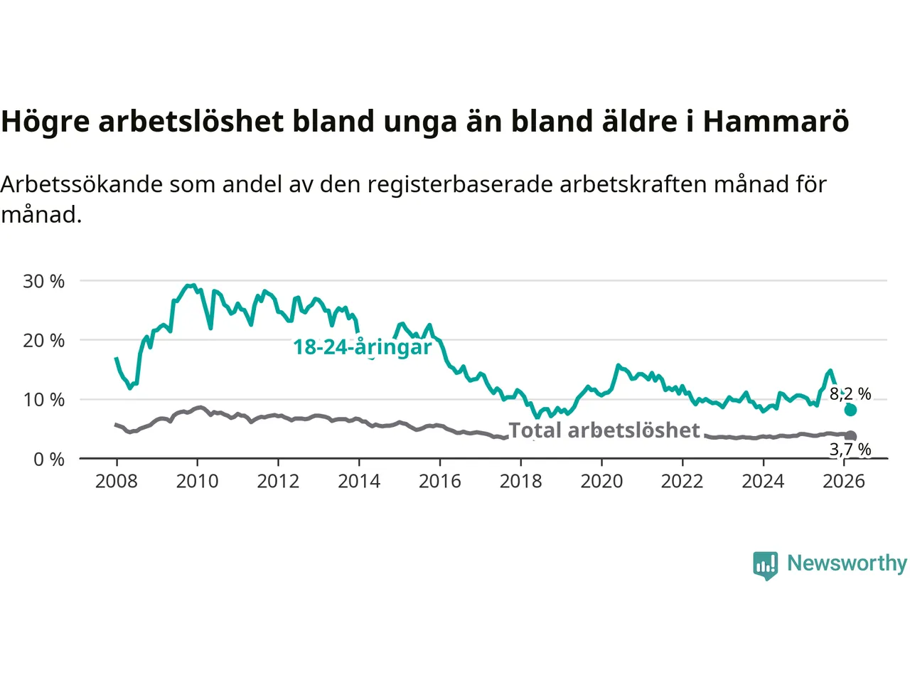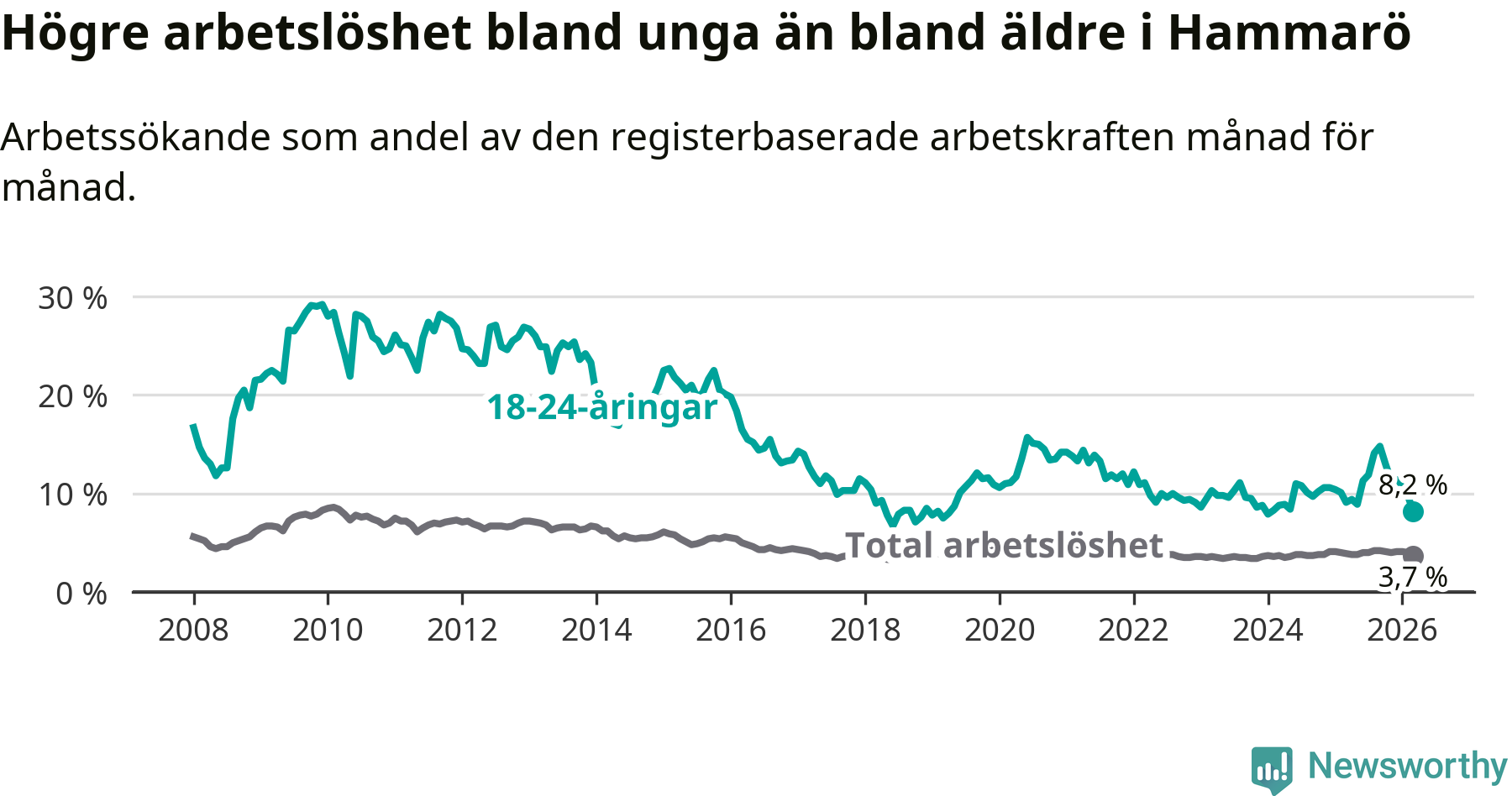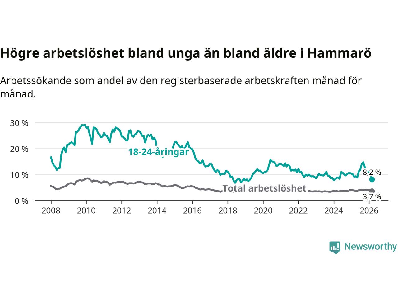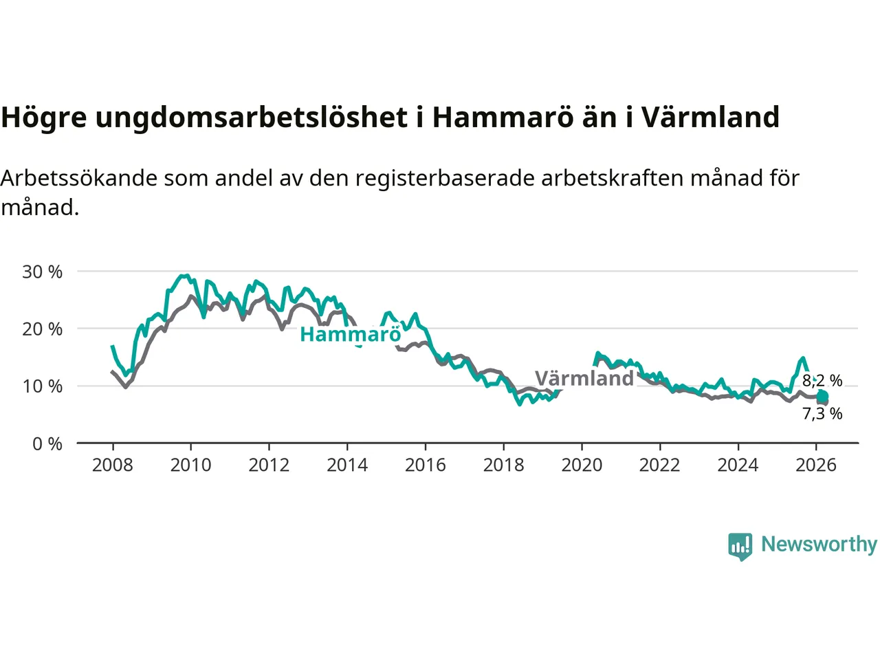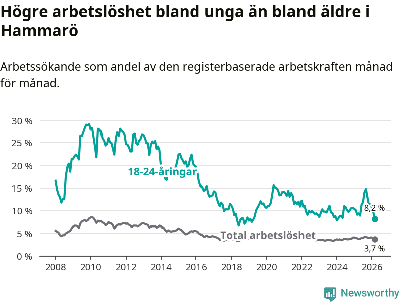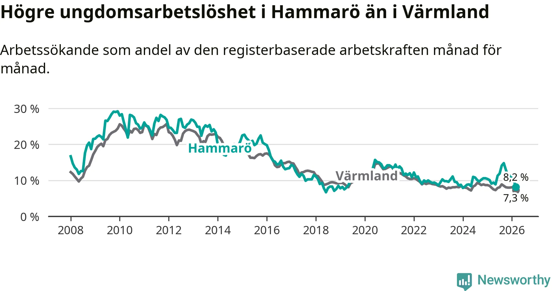 Medan Hammarö har lägre total arbetslöshet än Värmland, ligger ungdomsarbetslösheten 0,9 procentenheter högre på Hammarö.