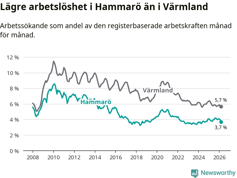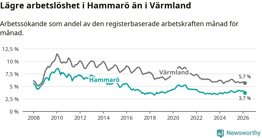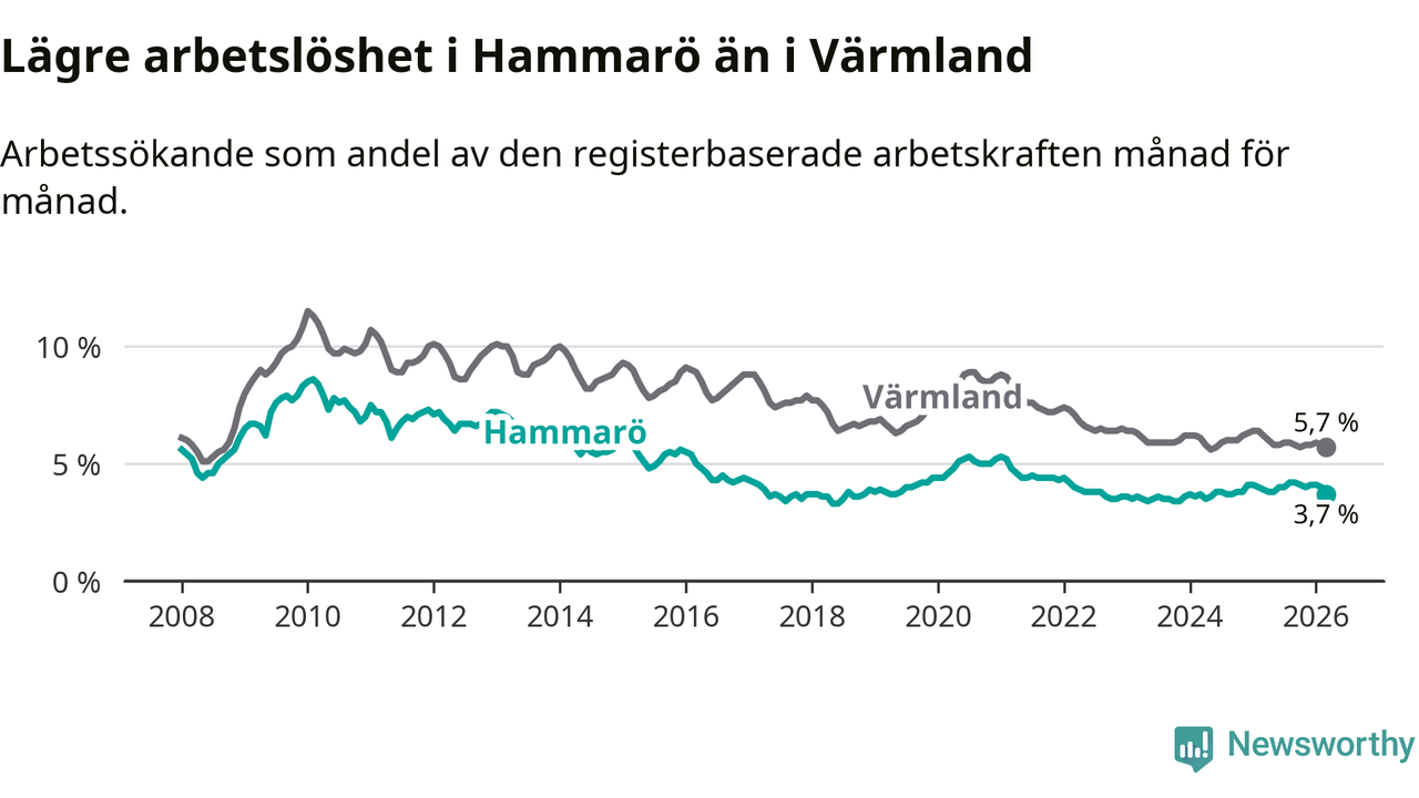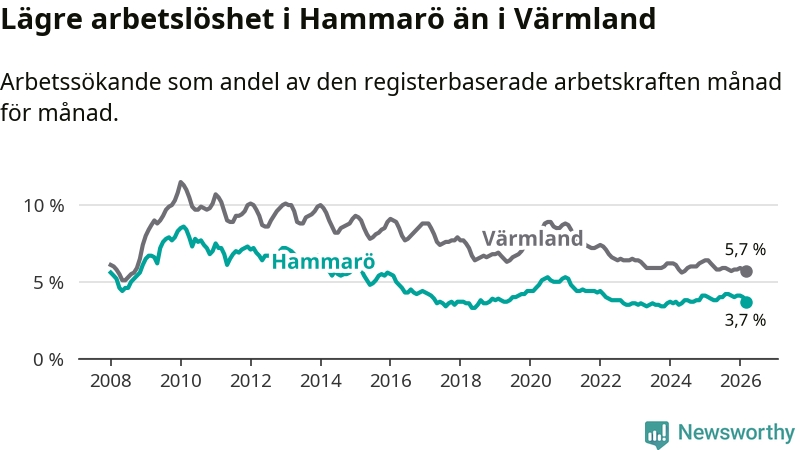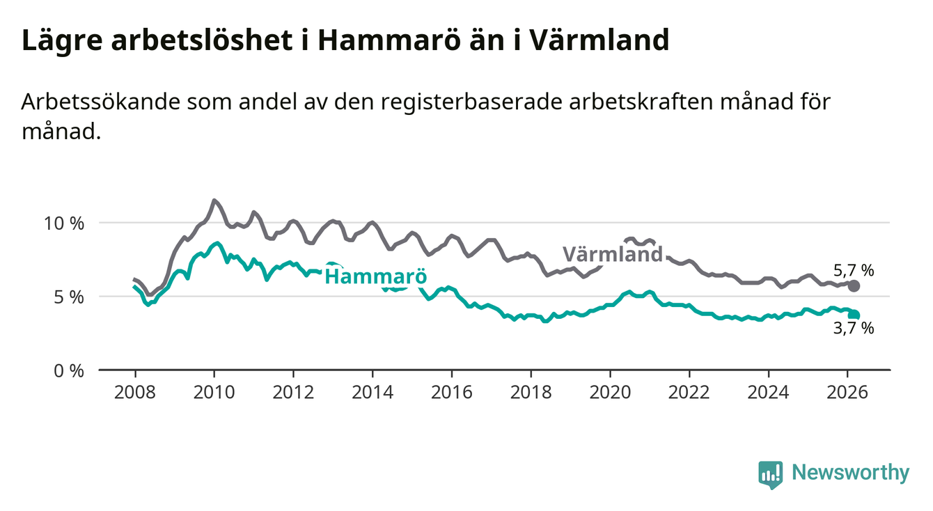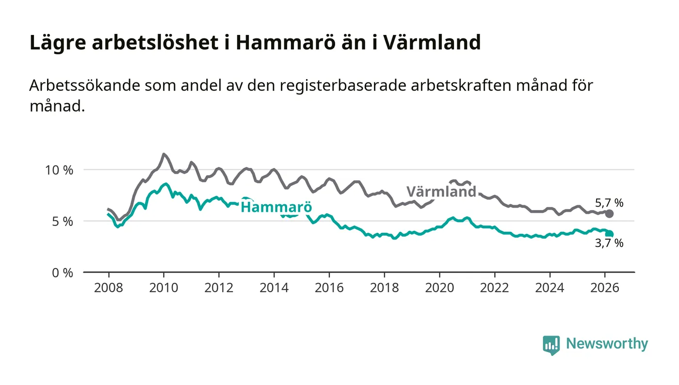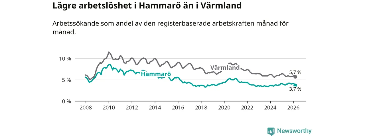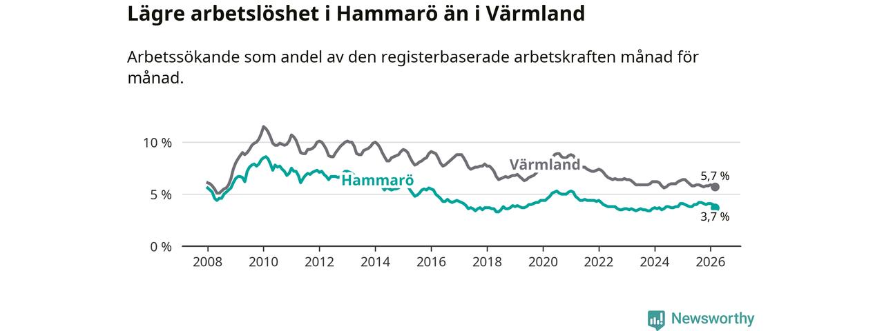 Under mars månad rapporterade Hammarö kommun en total arbetslöshet på 3,7 procent. Det är en minskning jämfört med samma tidpunkt i fjol (−0,2 procentenheter). Även i Värmlands län sjunker arbetslösheten .
