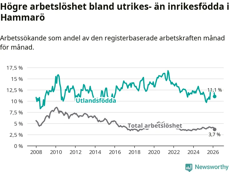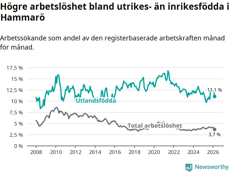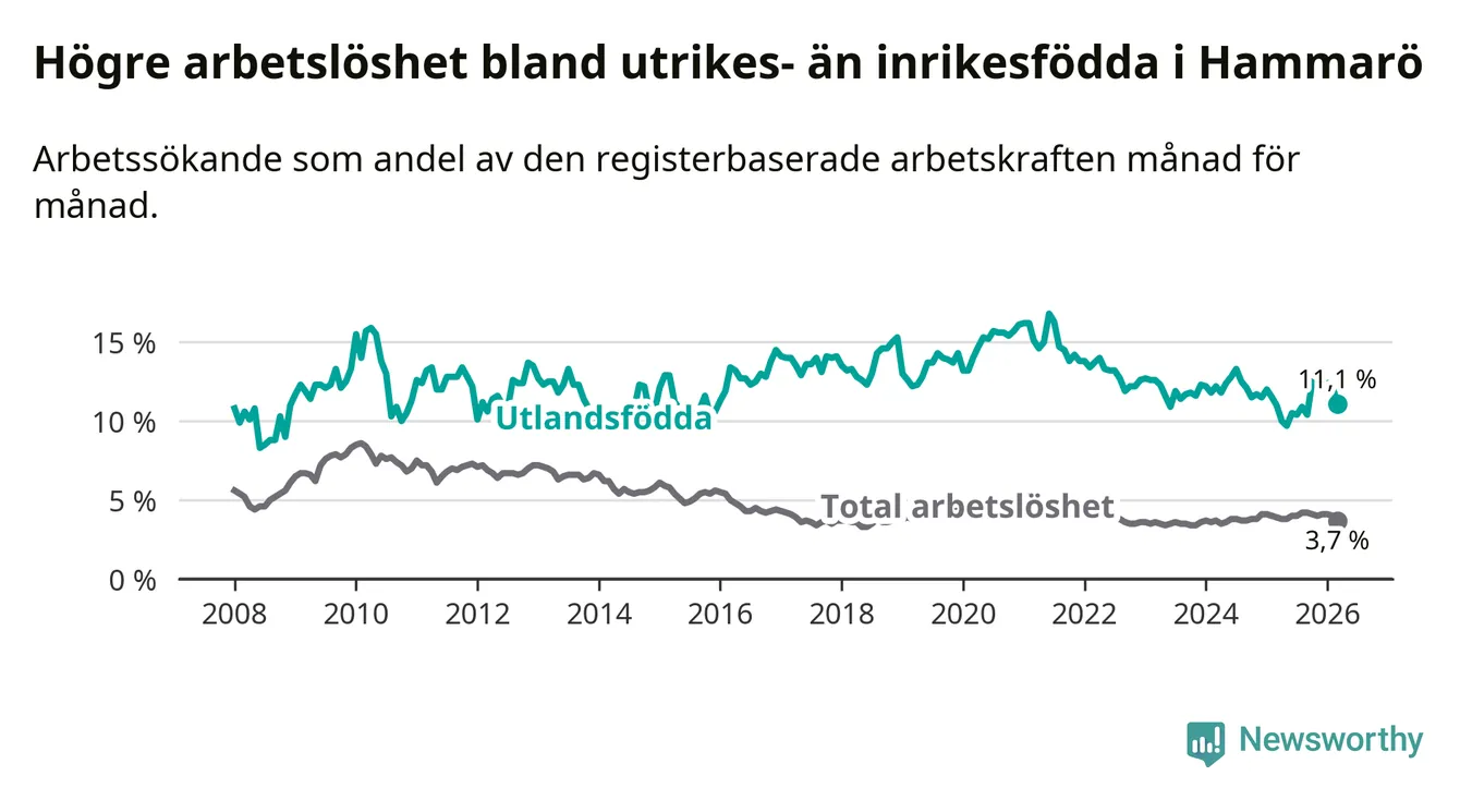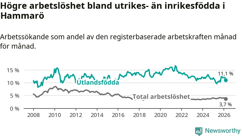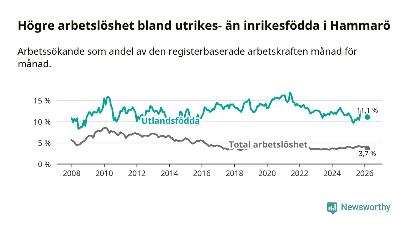 Skillnaden i arbetslöshet mellan utrikesfödda och hela befolkningen är 7,4 procentenheter på Hammarö.