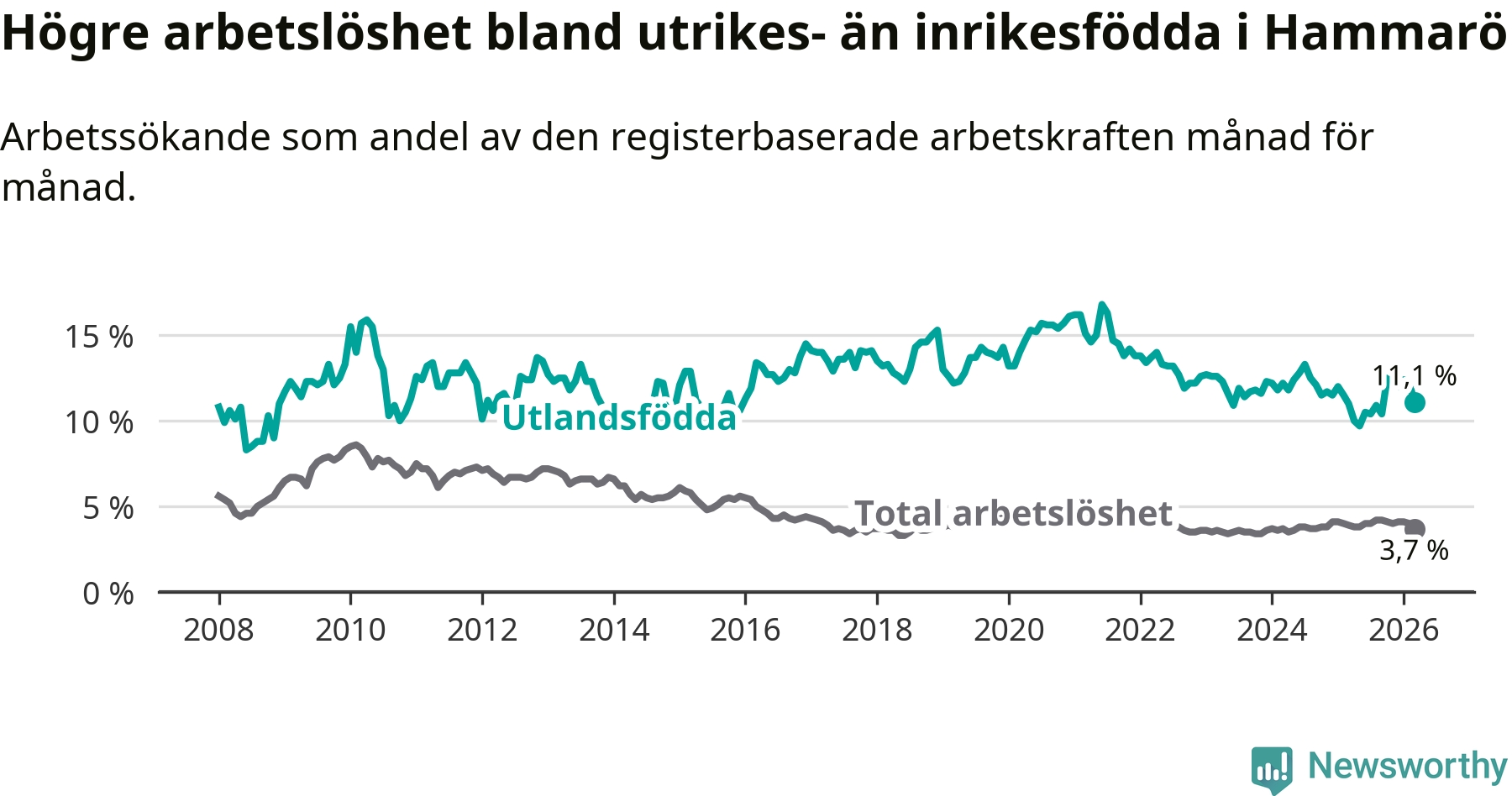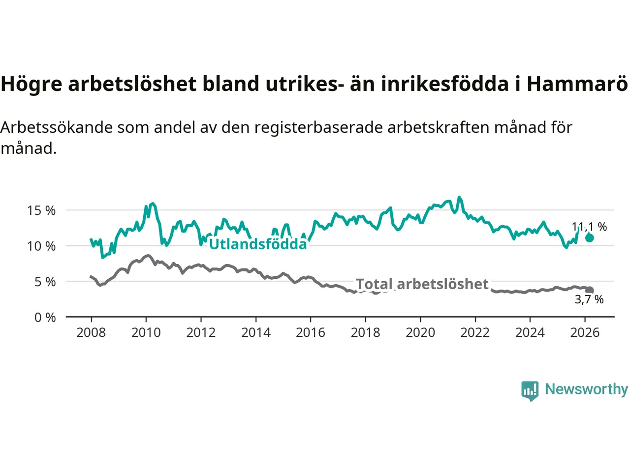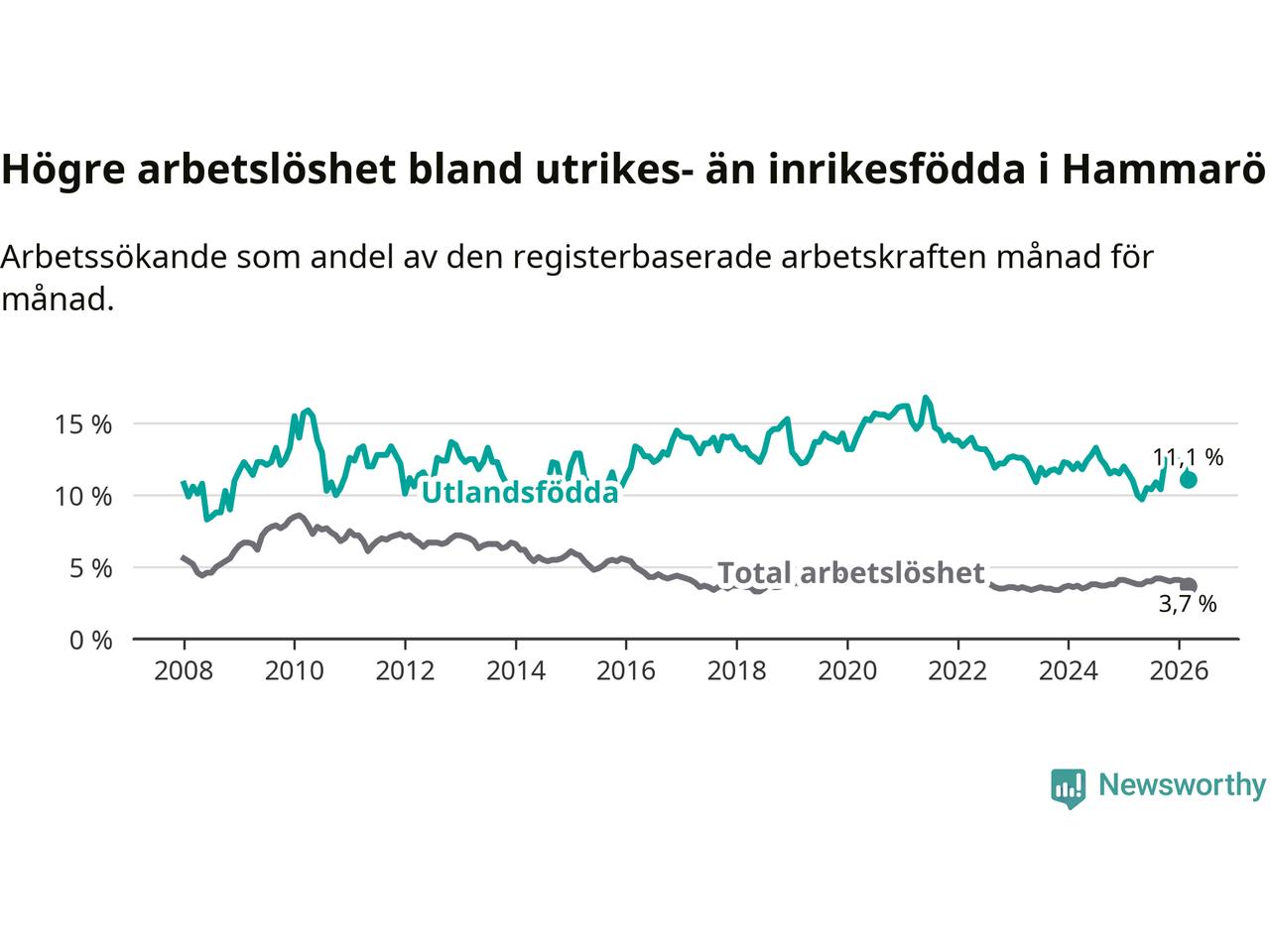 Skillnaden i arbetslöshet mellan utrikesfödda och hela befolkningen är 7,4 procentenheter på Hammarö.