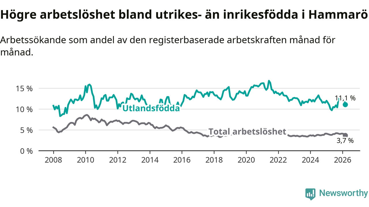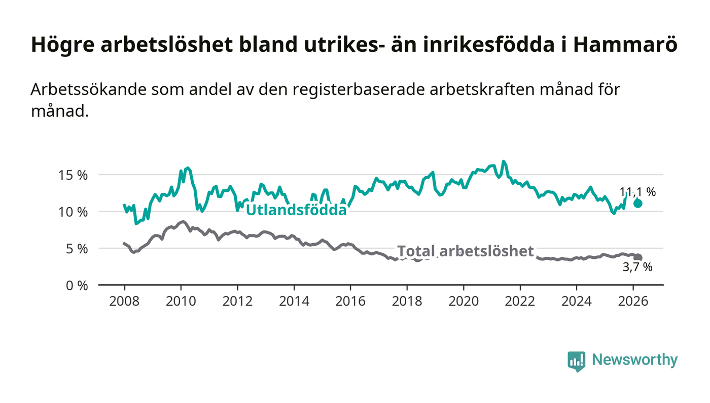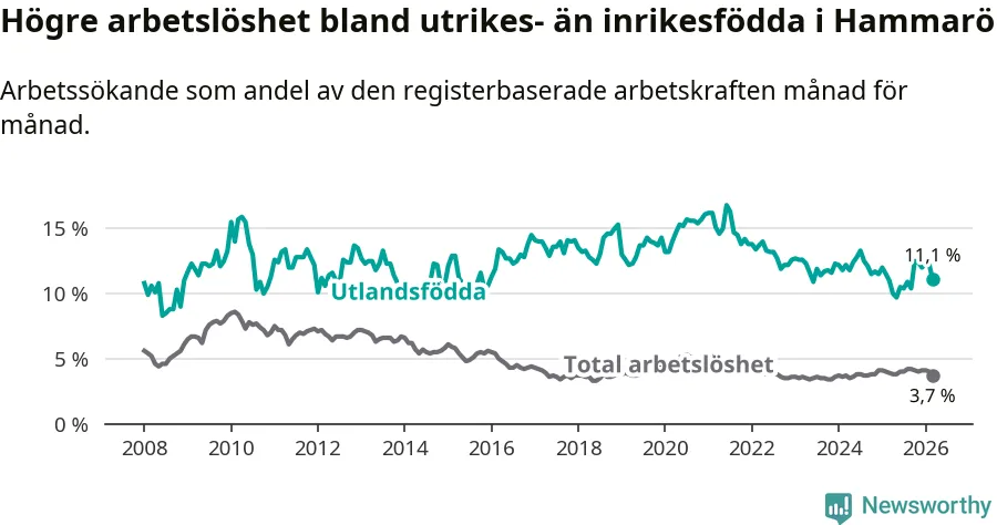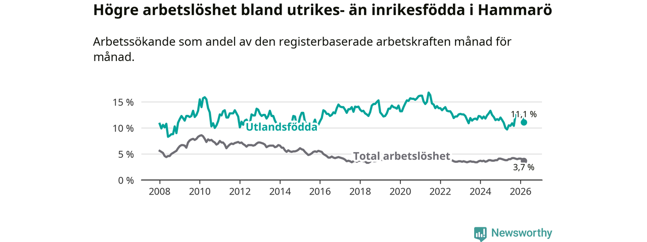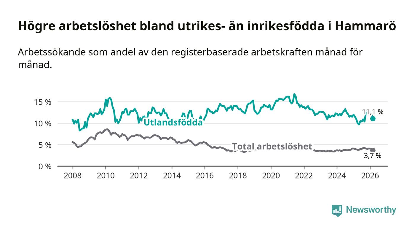 Arbetslösheten bland utlandsfödda var 11,1 procent på Hammarö under mars månad, motsvarande 84 av 757 personer. Det är 0,1 procentenheter fler än vid samma tidpunkt i fjol (+2 om man räknar personer). Därmed är de utlandsföddas arbetslöshet högre än vid samma tidpunkt i fjol för sjätte månaden i följd.