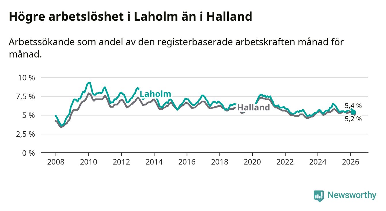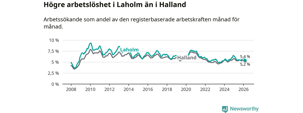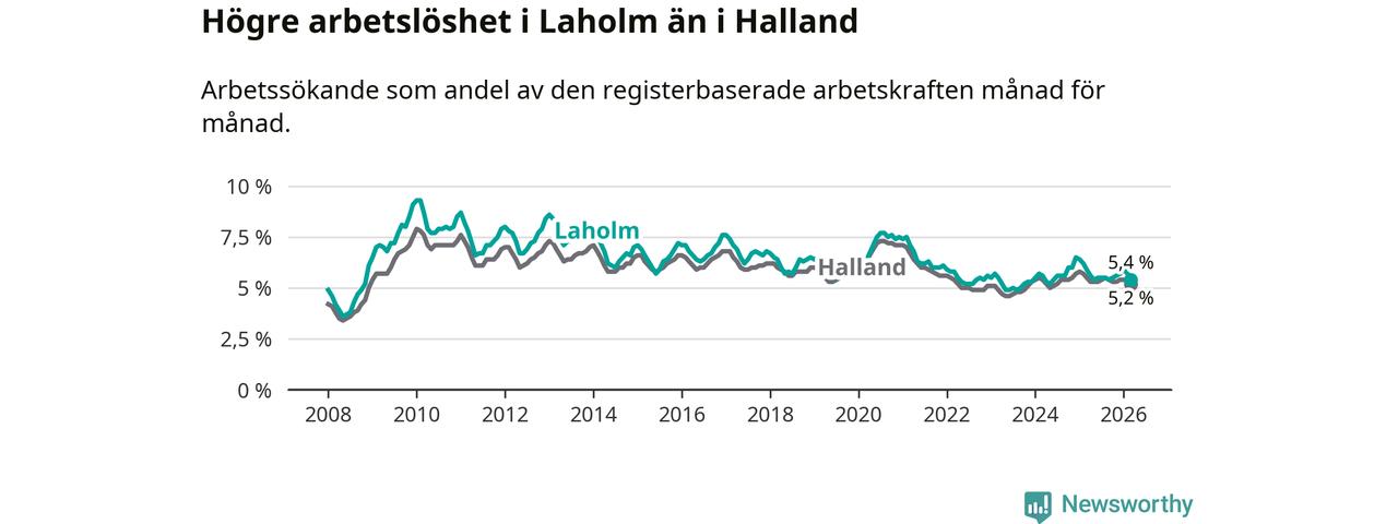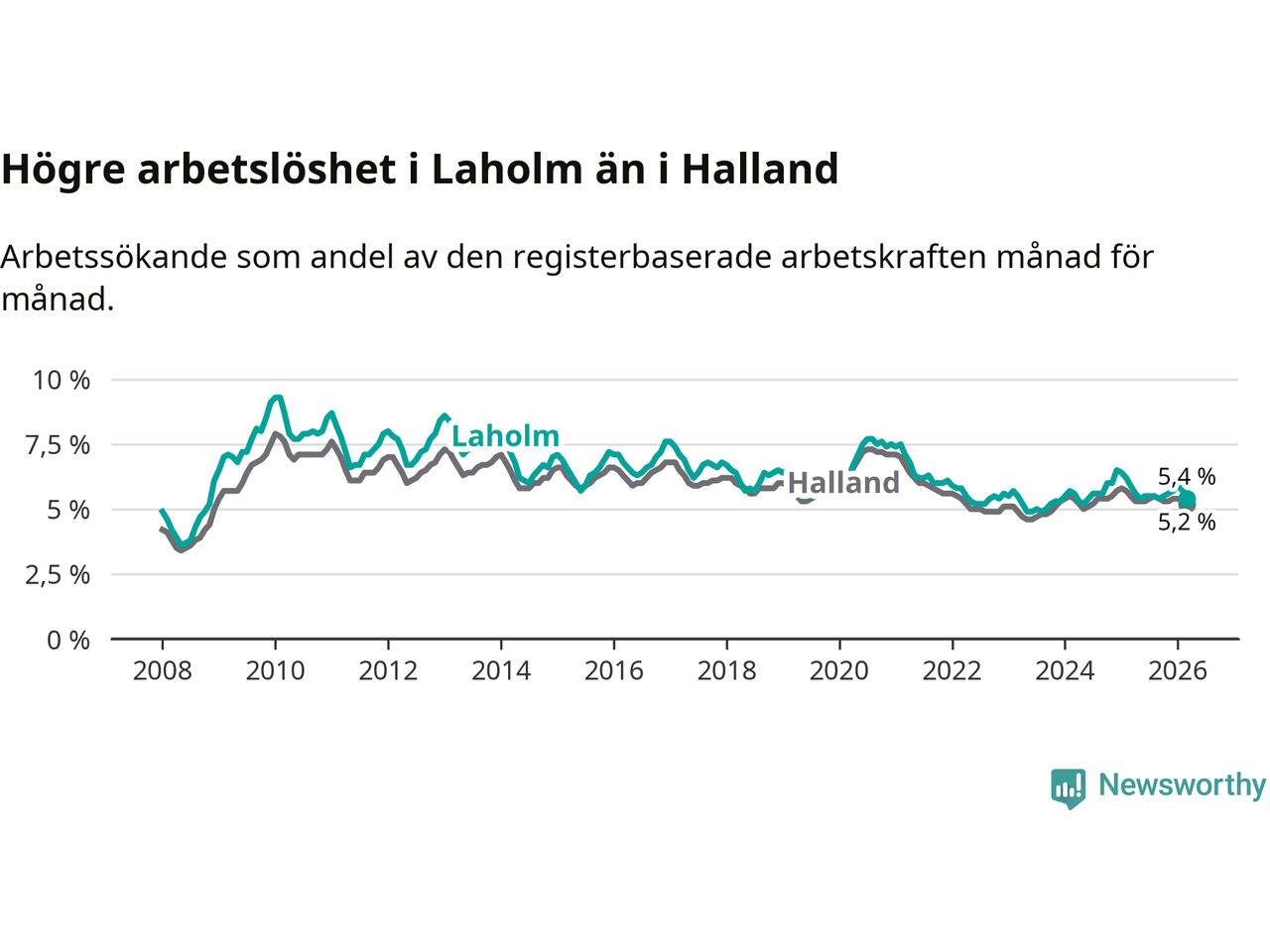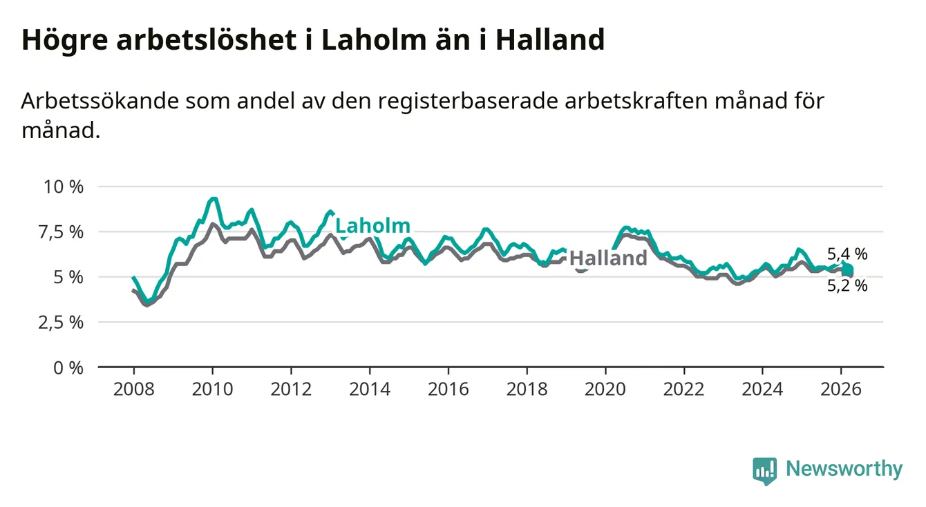 Under mars månad rapporterade Laholms kommun en total arbetslöshet på 5,4 procent. Det är en minskning jämfört med samma tidpunkt i fjol (−0,5 procentenheter). Även i Hallands län sjunker arbetslösheten .