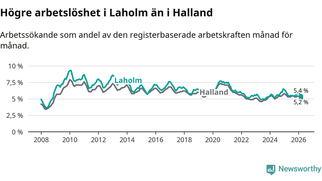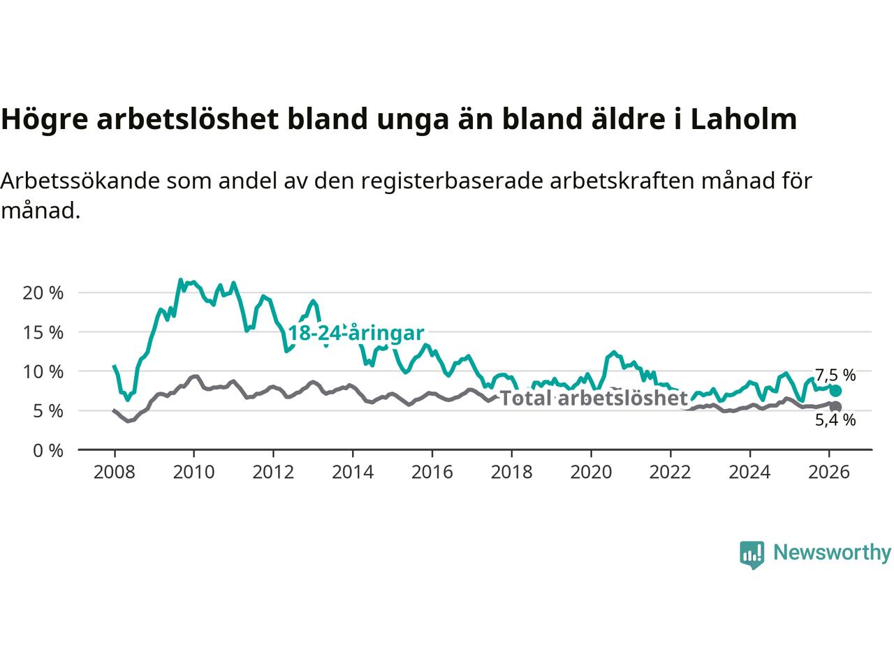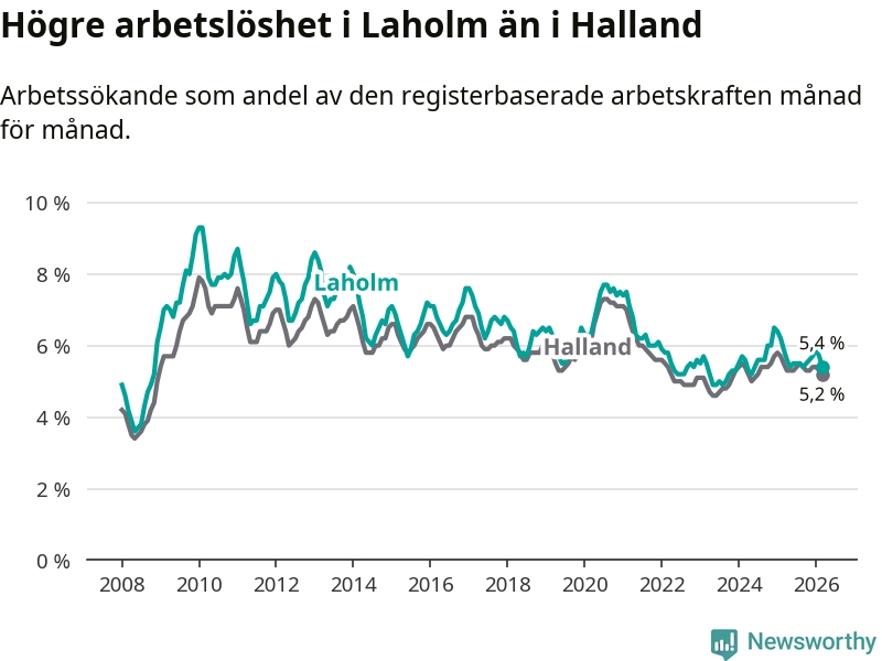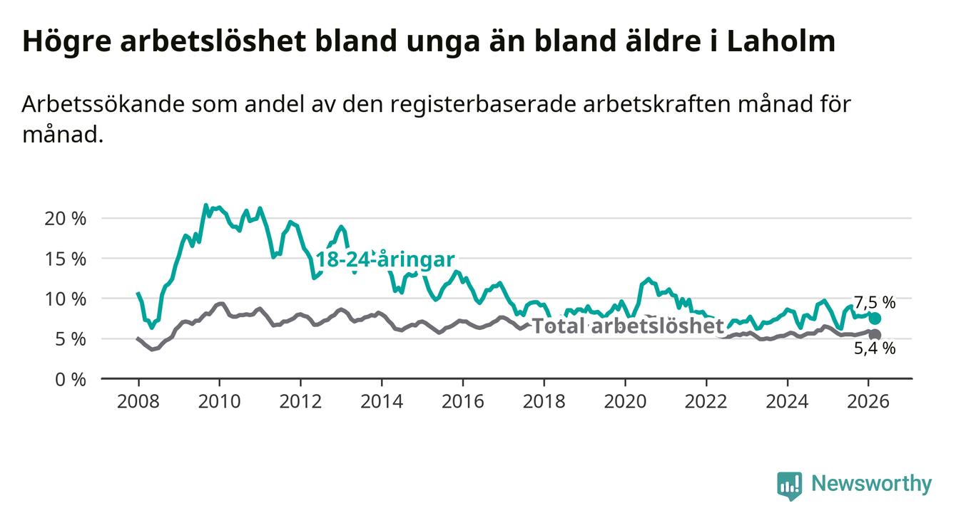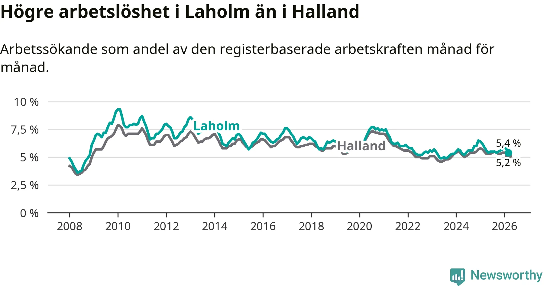 Under mars månad rapporterade Laholms kommun en total arbetslöshet på 5,4 procent. Det är en minskning jämfört med samma tidpunkt i fjol (−0,5 procentenheter). Även i Hallands län sjunker arbetslösheten .
