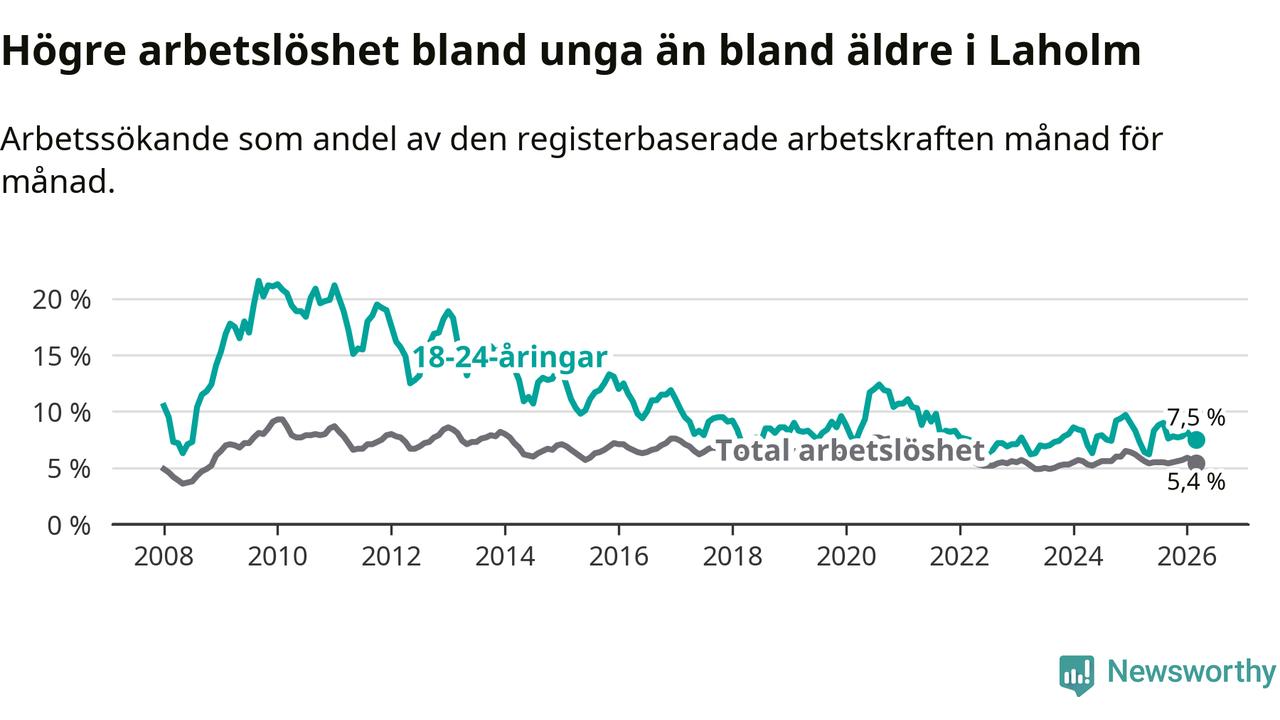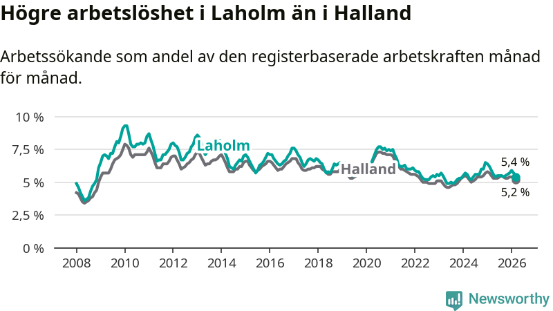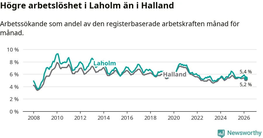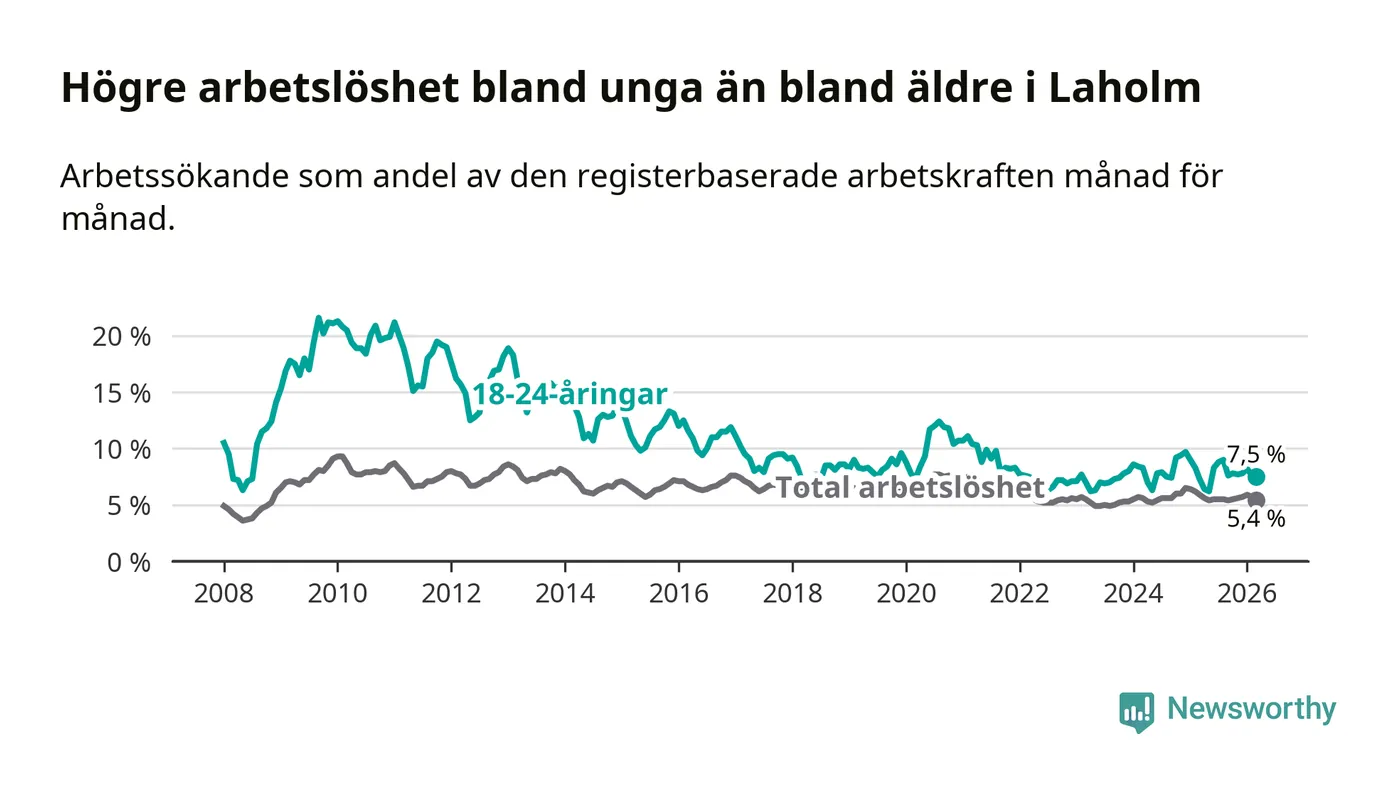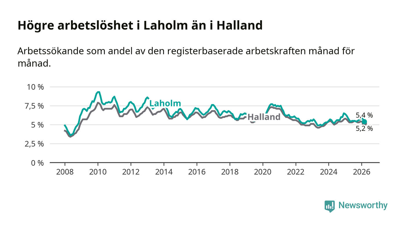 Under mars månad rapporterade Laholms kommun en total arbetslöshet på 5,4 procent. Det är en minskning jämfört med samma tidpunkt i fjol (−0,5 procentenheter). Även i Hallands län sjunker arbetslösheten .