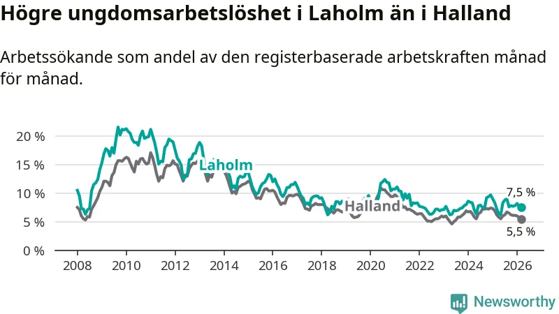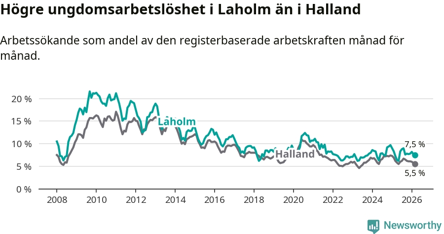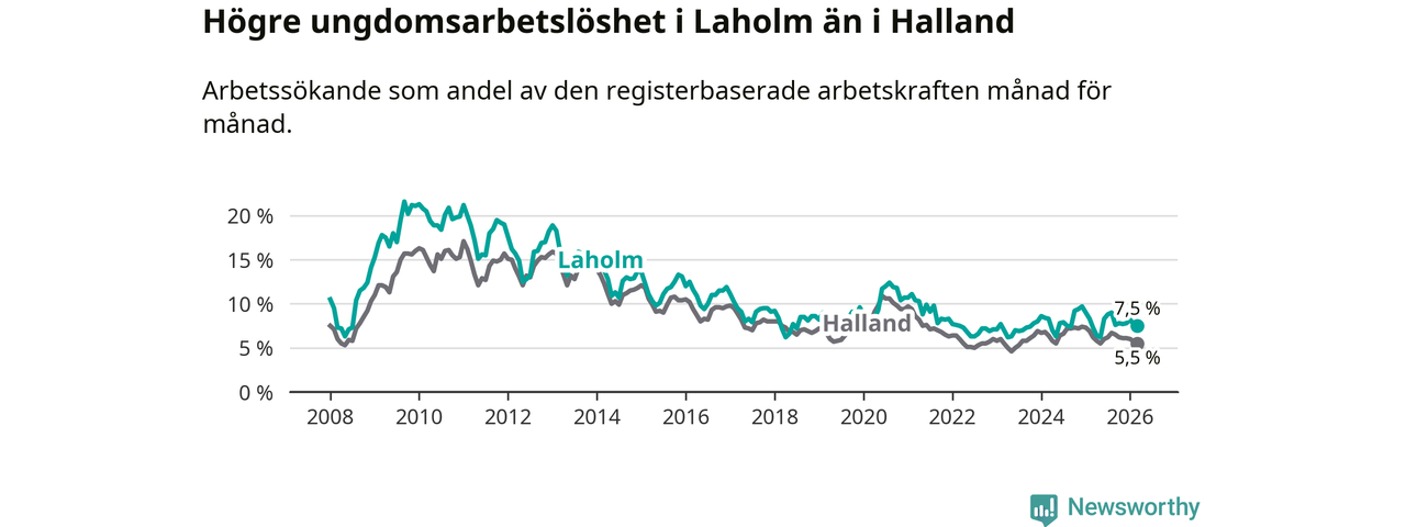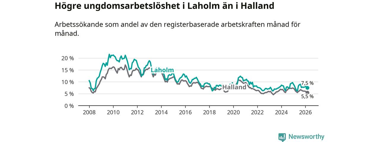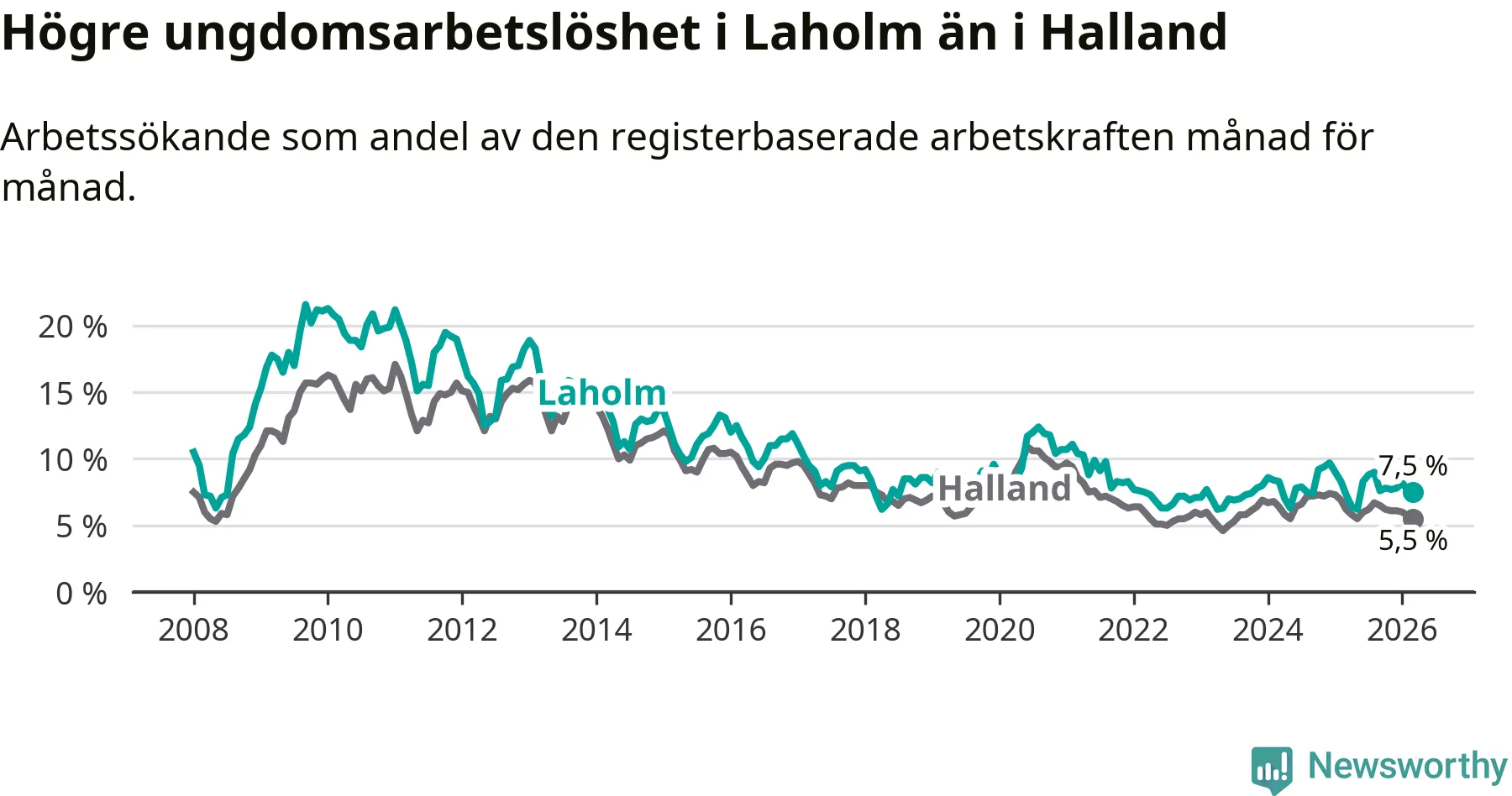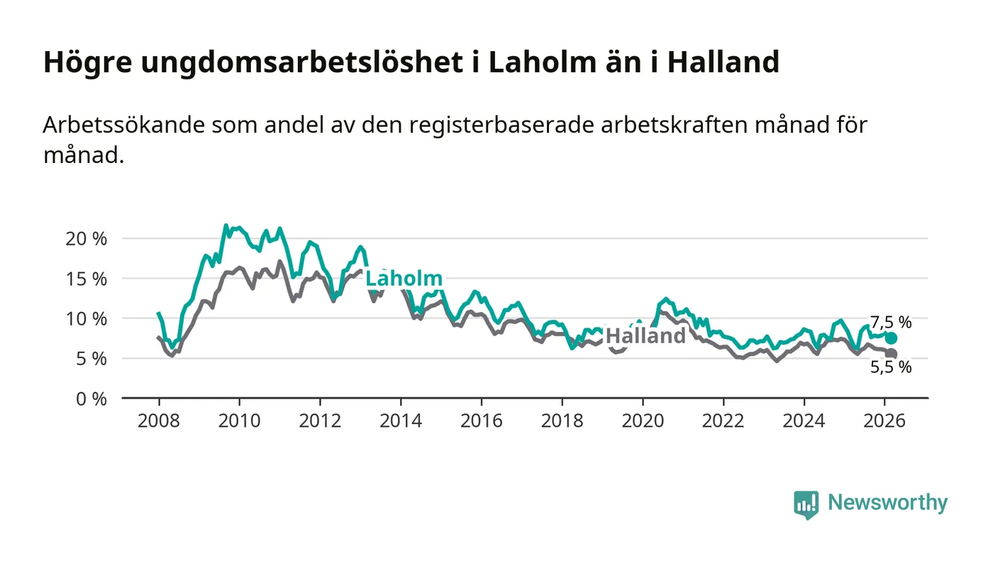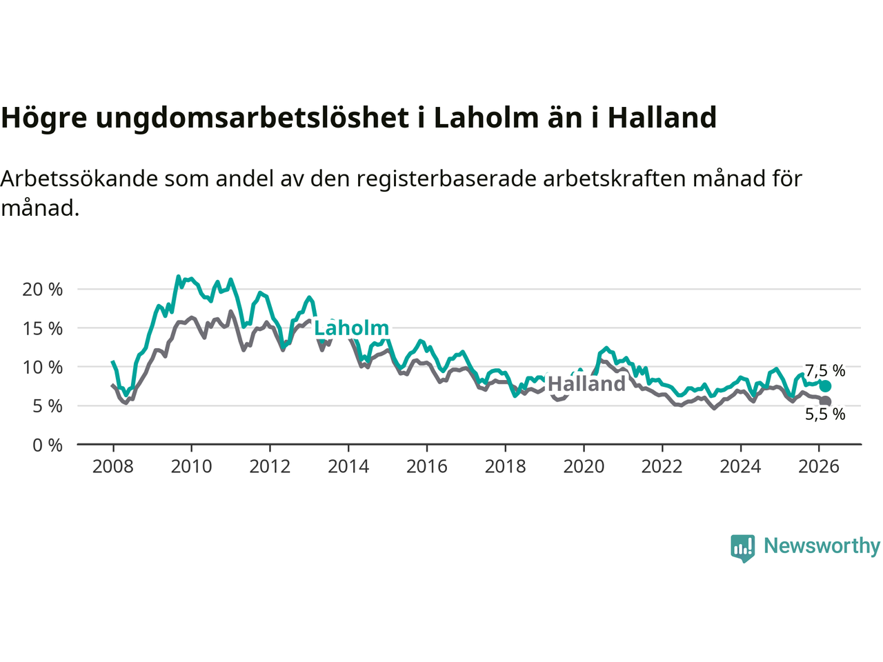 Precis som den totala arbetslösheten ligger ungdomsarbetslösheten i Laholm högre än i Halland som helhet. Skillnaden mellan kommunen och länet är 2,0 procentenheter.