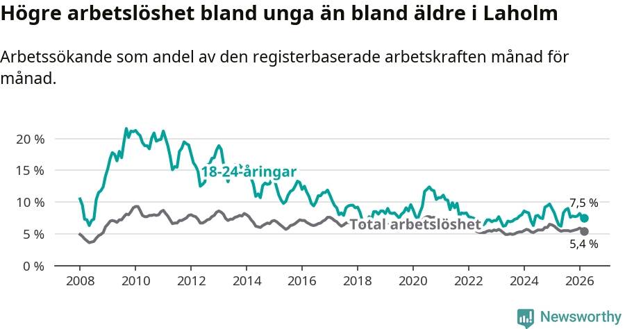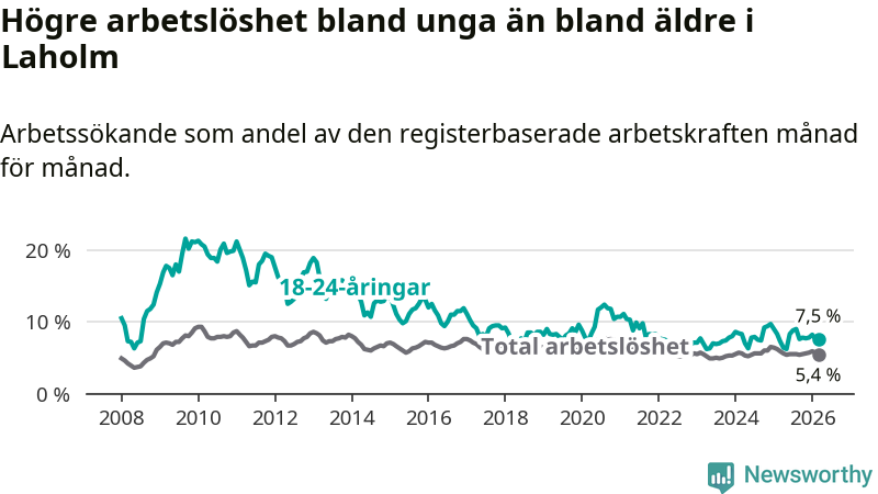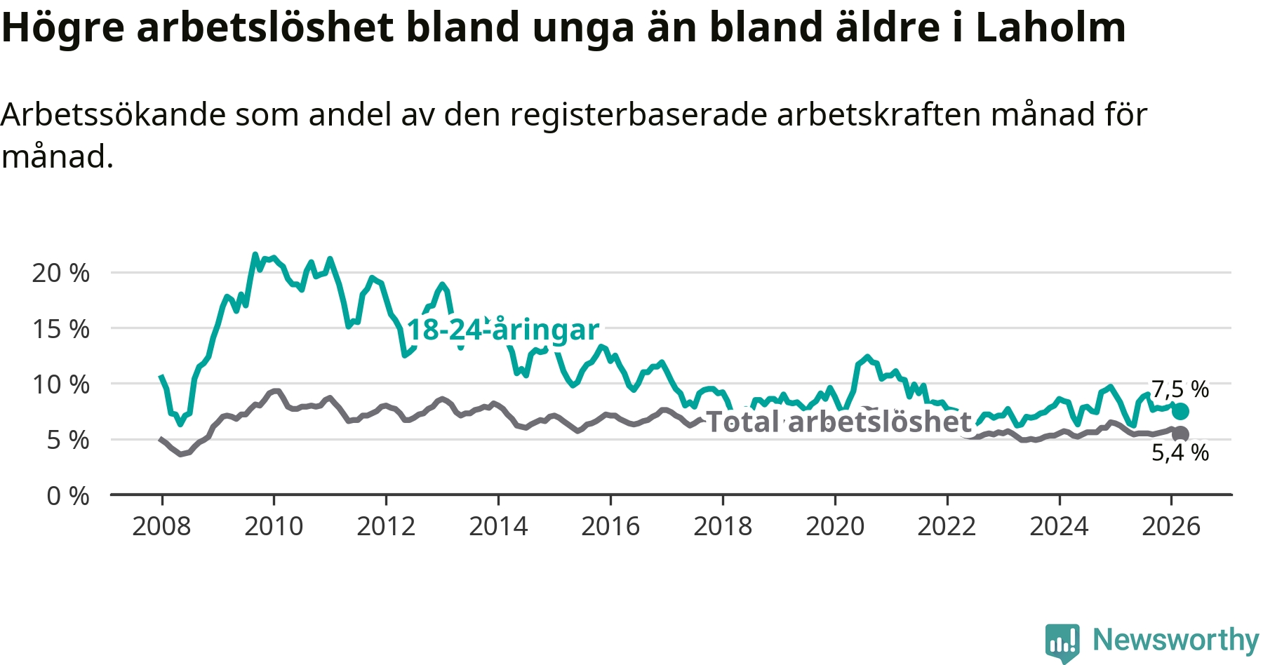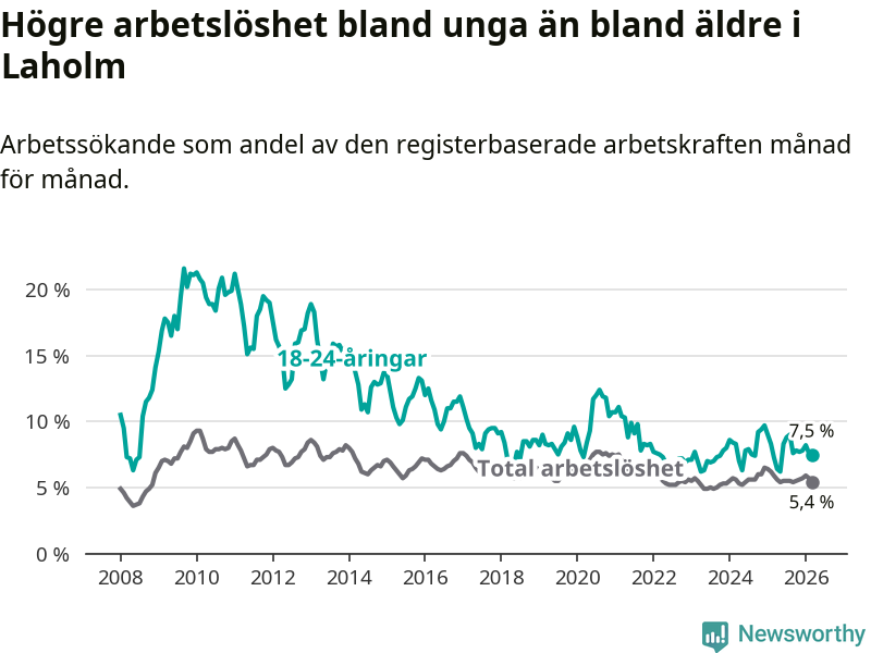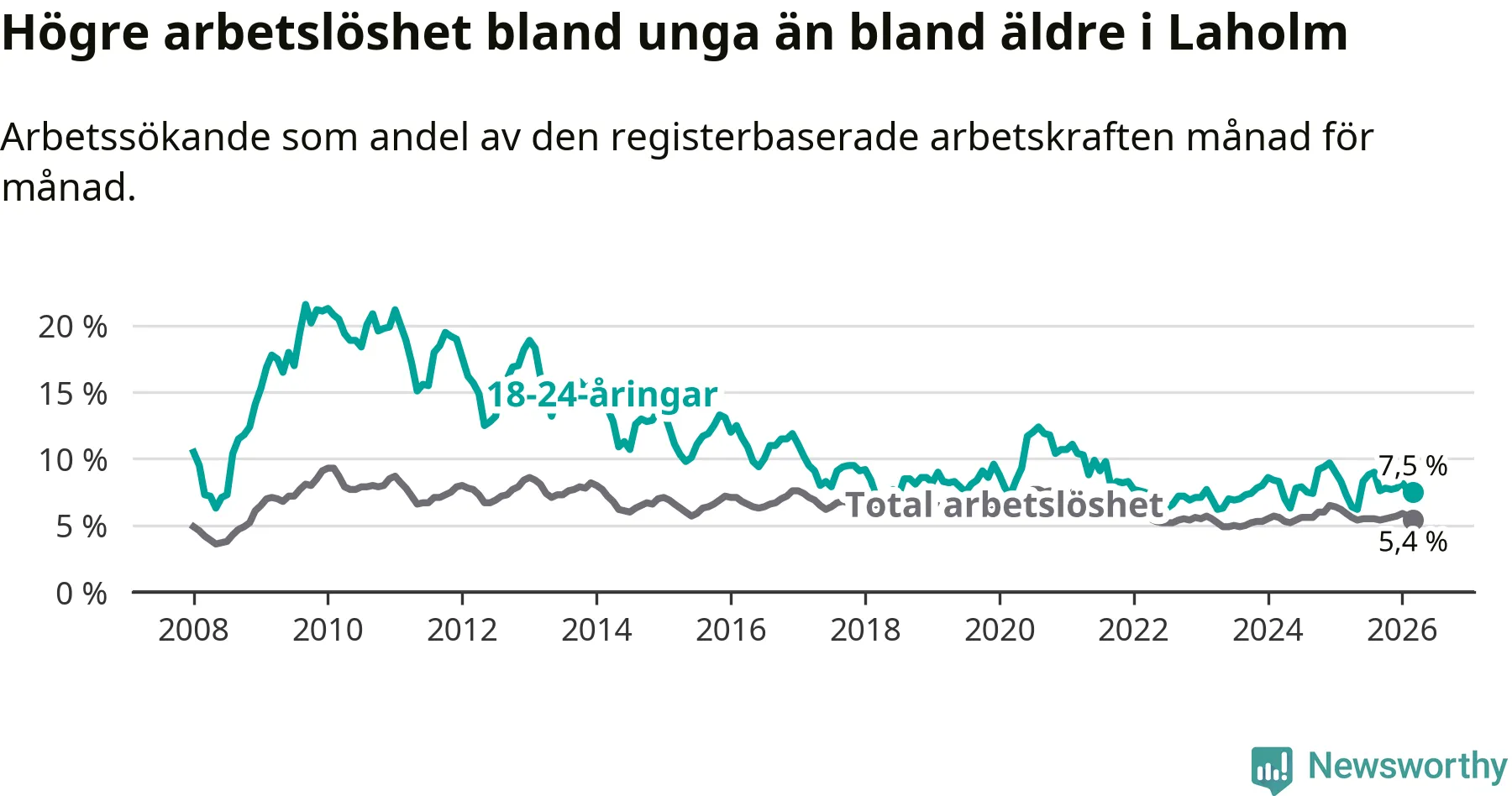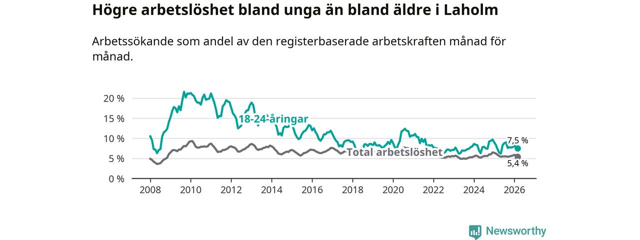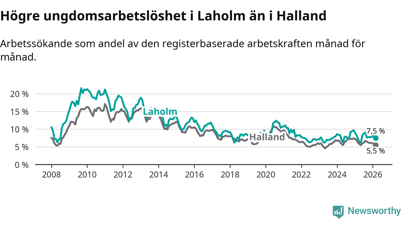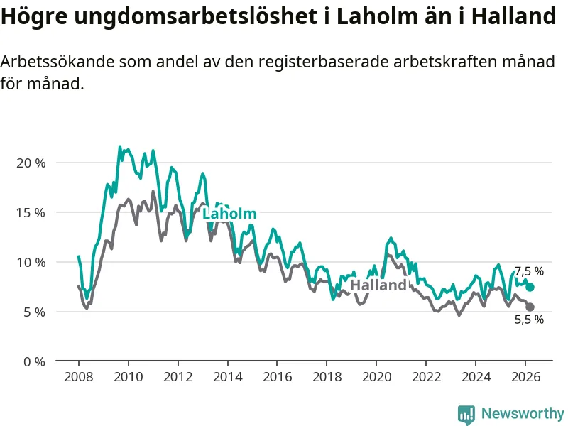 Precis som den totala arbetslösheten ligger ungdomsarbetslösheten i Laholm högre än i Halland som helhet. Skillnaden mellan kommunen och länet är 2,0 procentenheter.