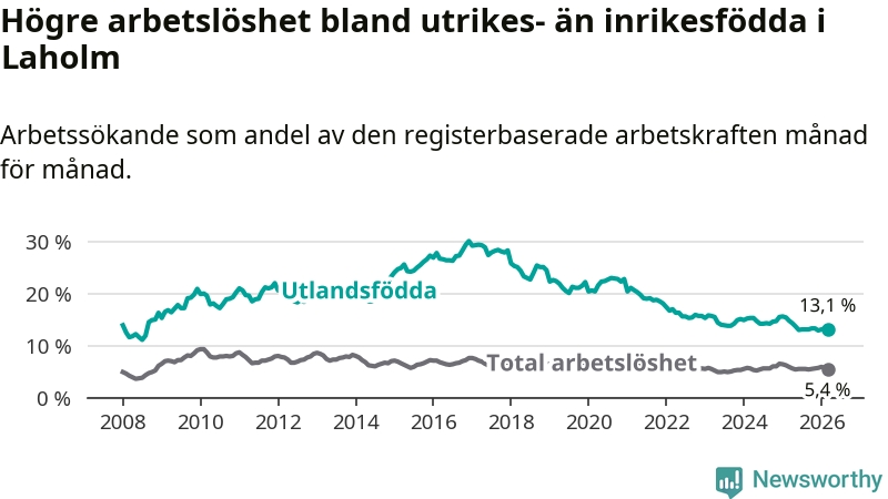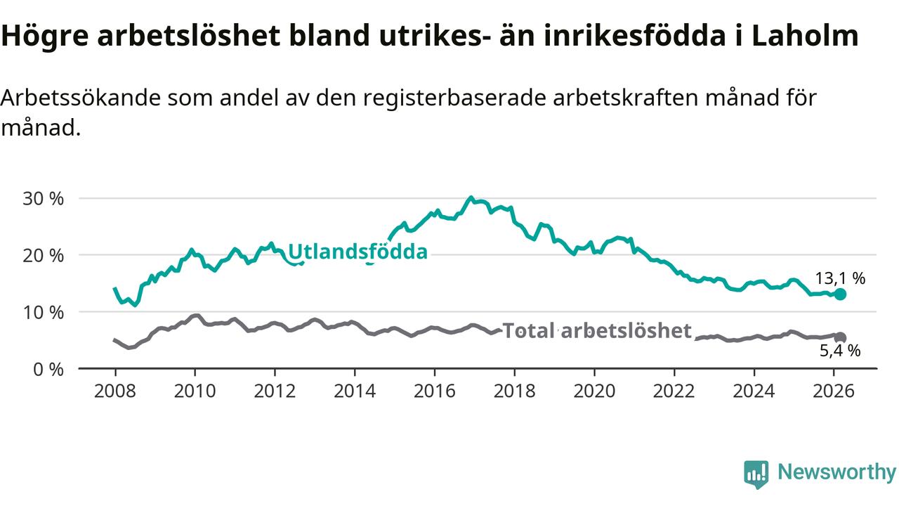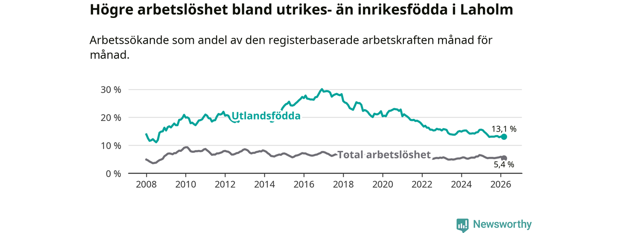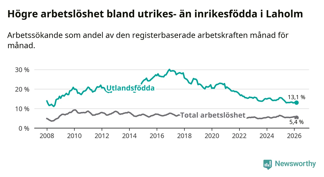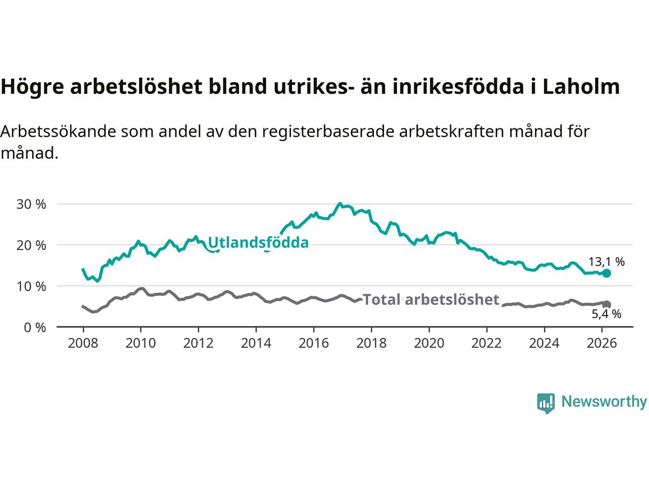 Arbetslösheten bland utlandsfödda var 13,1 procent i Laholm under mars månad, motsvarande 300 av 2 290 personer. Det är 1,7 procentenheter färre än vid samma tidpunkt i fjol (−36 om man räknar personer). Därmed är de utlandsföddas arbetslöshet lägre än vid samma tidpunkt i fjol för 13:e månaden i följd. Sedan februari 2025 har arbetslösheten bland utlandsfödda minskat från 15,4 till 13,1 procent.