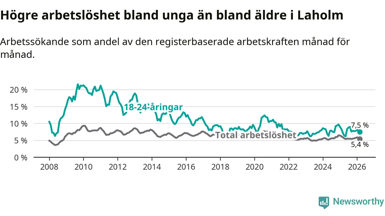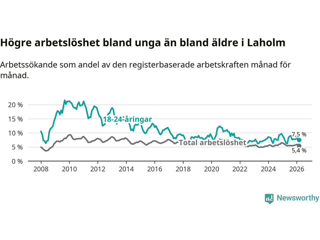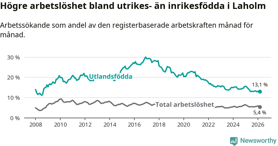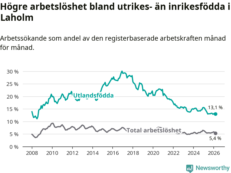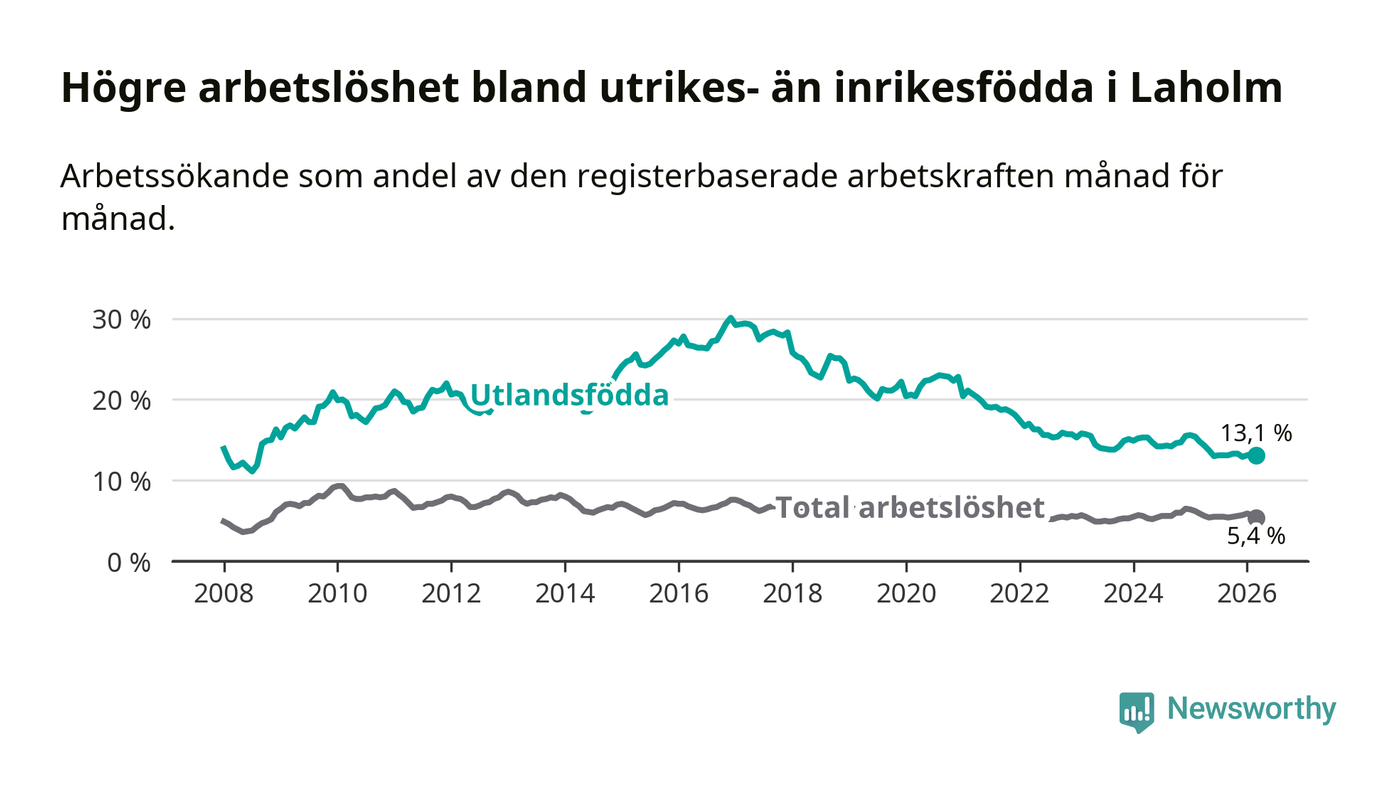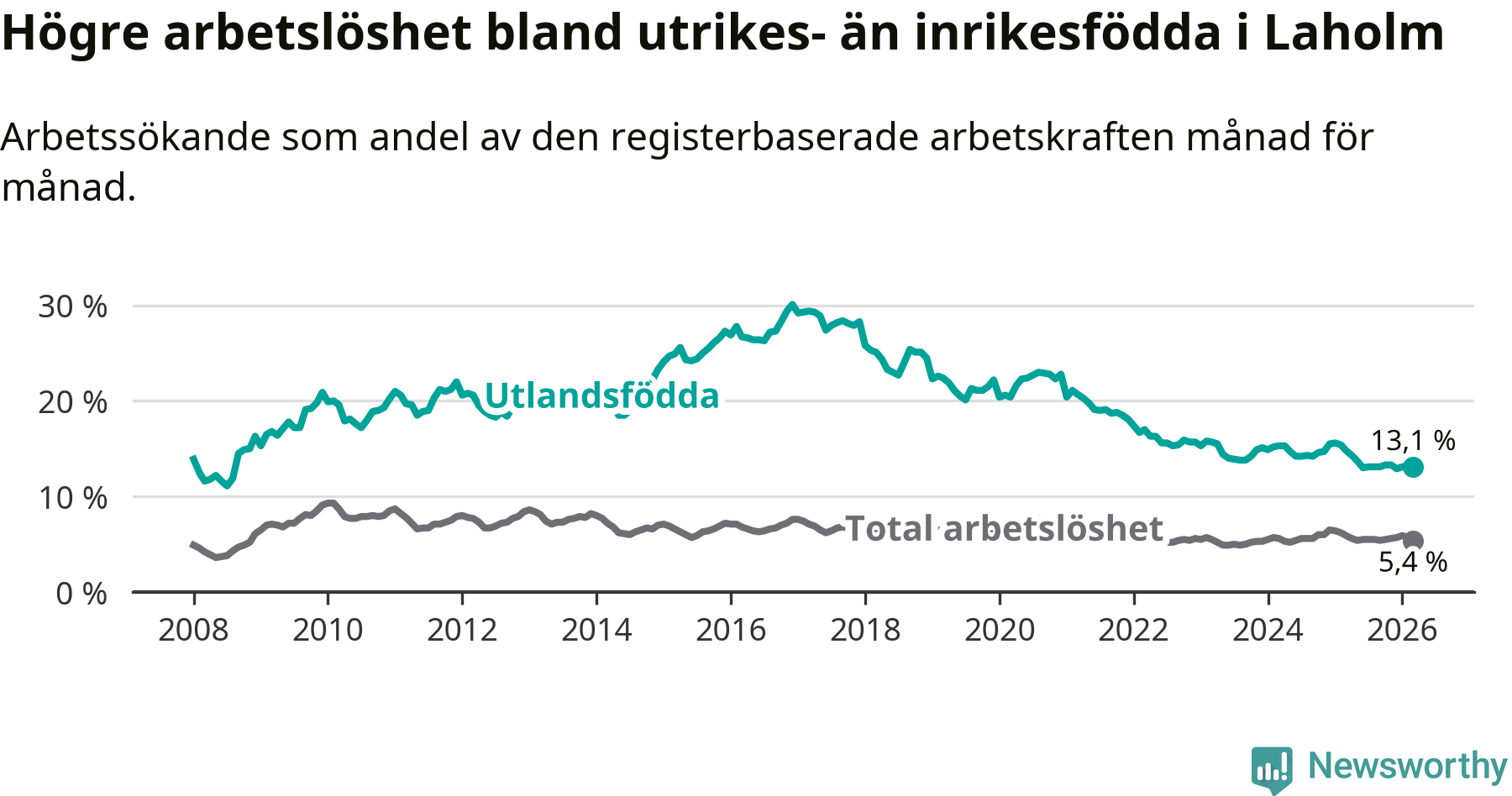 Arbetslösheten bland utlandsfödda var 13,1 procent i Laholm under mars månad, motsvarande 300 av 2 290 personer. Det är 1,7 procentenheter färre än vid samma tidpunkt i fjol (−36 om man räknar personer). Därmed är de utlandsföddas arbetslöshet lägre än vid samma tidpunkt i fjol för 13:e månaden i följd. Sedan februari 2025 har arbetslösheten bland utlandsfödda minskat från 15,4 till 13,1 procent.