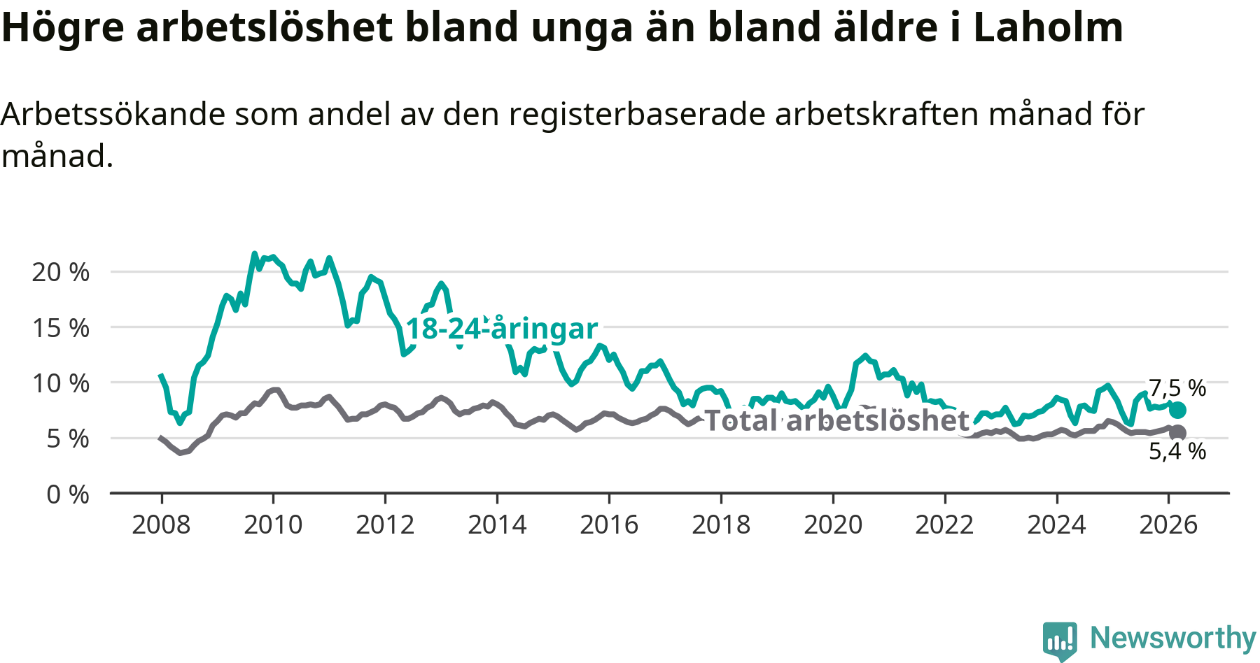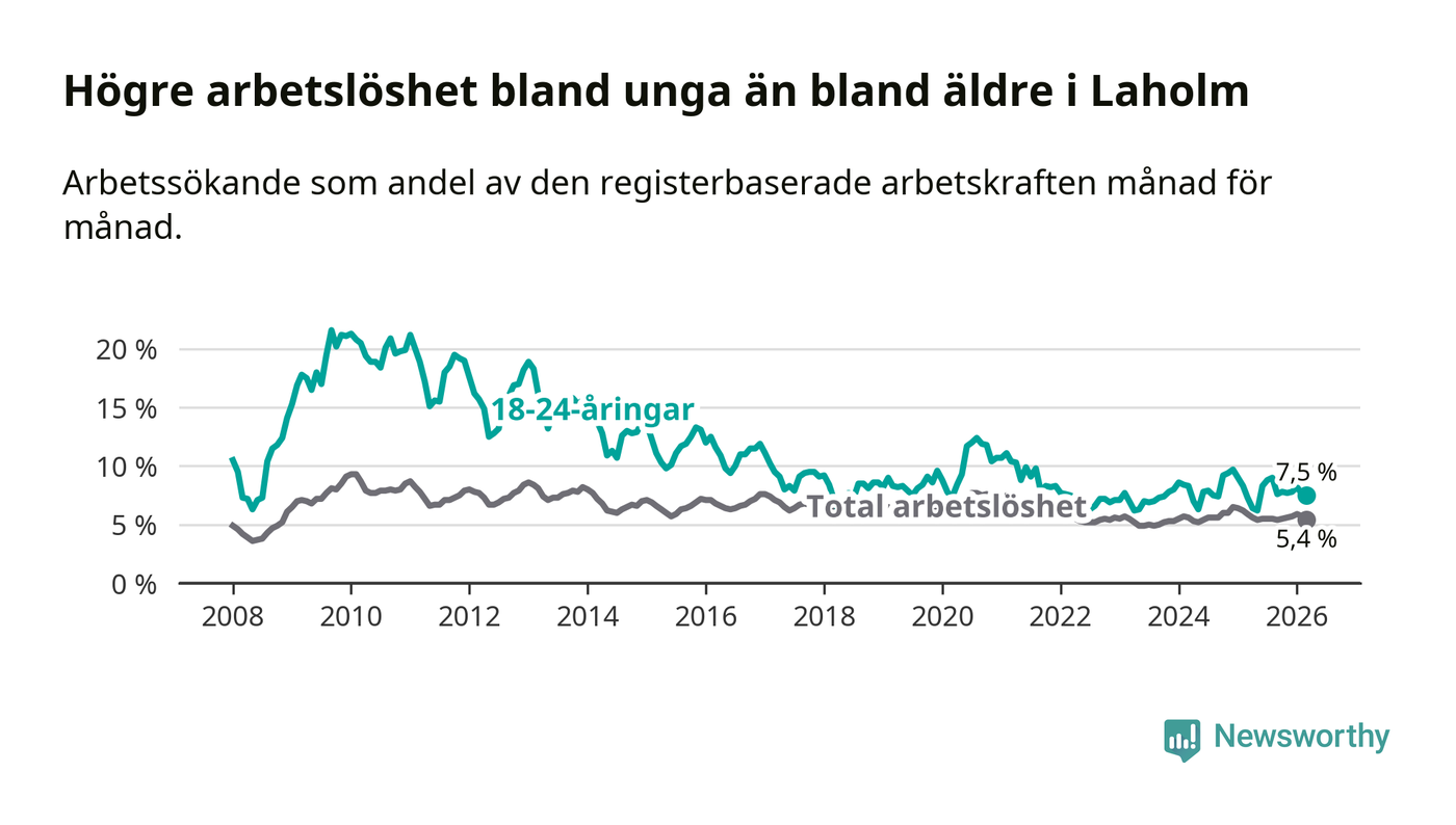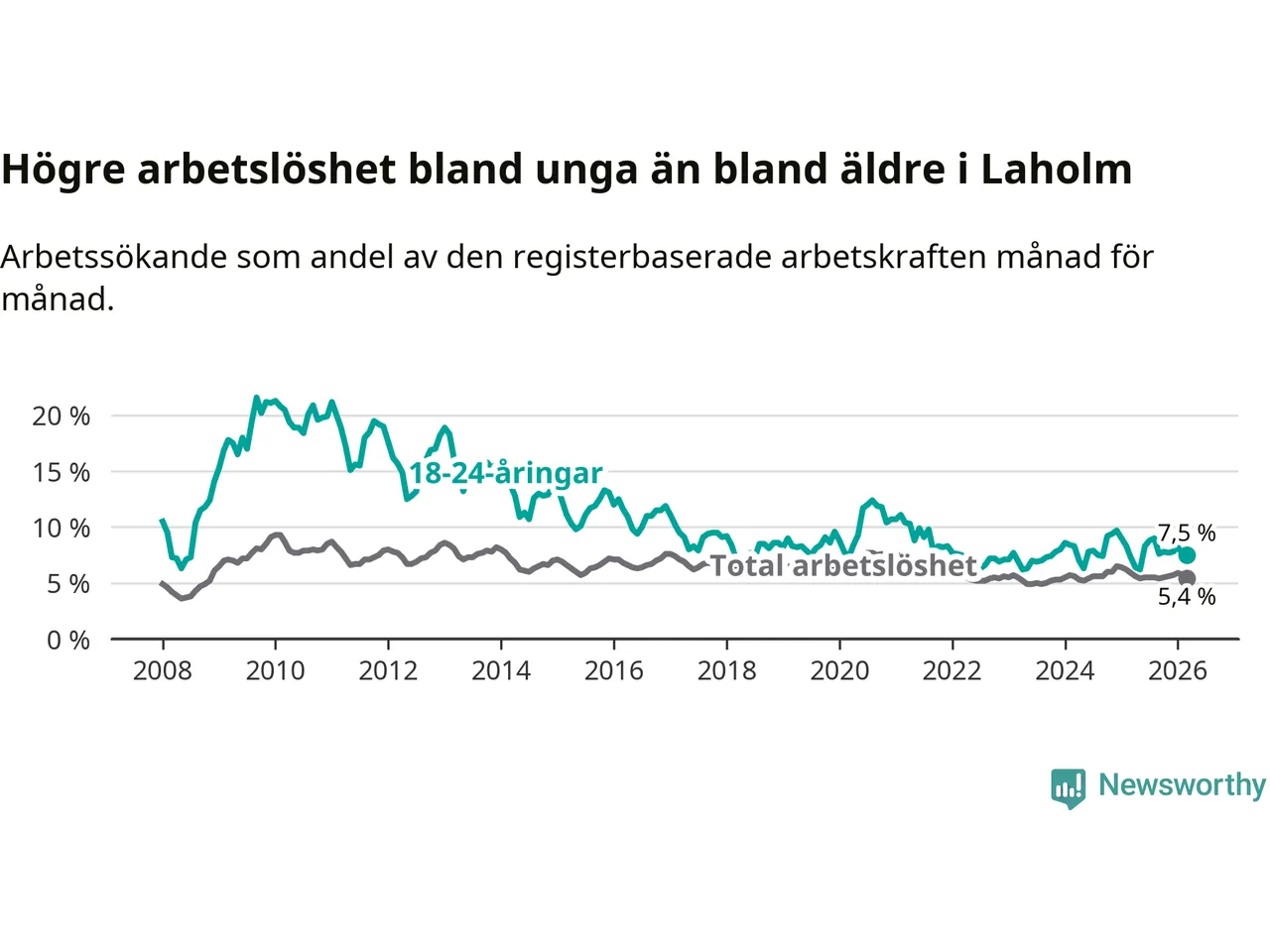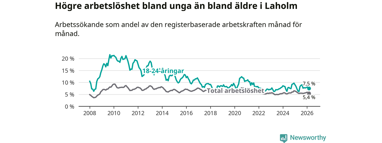 Arbetslösheten bland utlandsfödda var 13,1 procent i Laholm under mars månad, motsvarande 300 av 2 290 personer. Det är 1,7 procentenheter färre än vid samma tidpunkt i fjol (−36 om man räknar personer). Därmed är de utlandsföddas arbetslöshet lägre än vid samma tidpunkt i fjol för 13:e månaden i följd. Sedan februari 2025 har arbetslösheten bland utlandsfödda minskat från 15,4 till 13,1 procent.