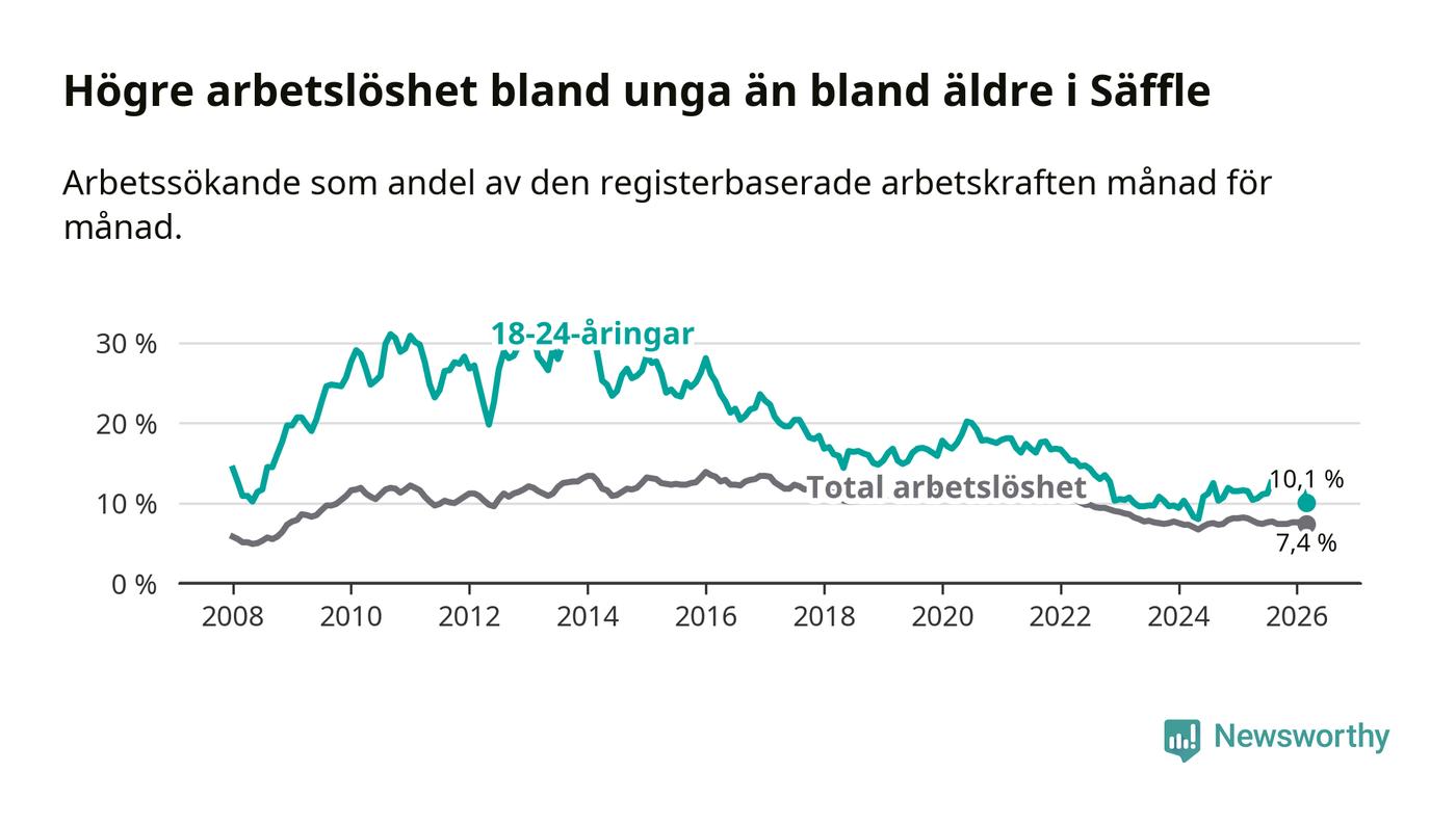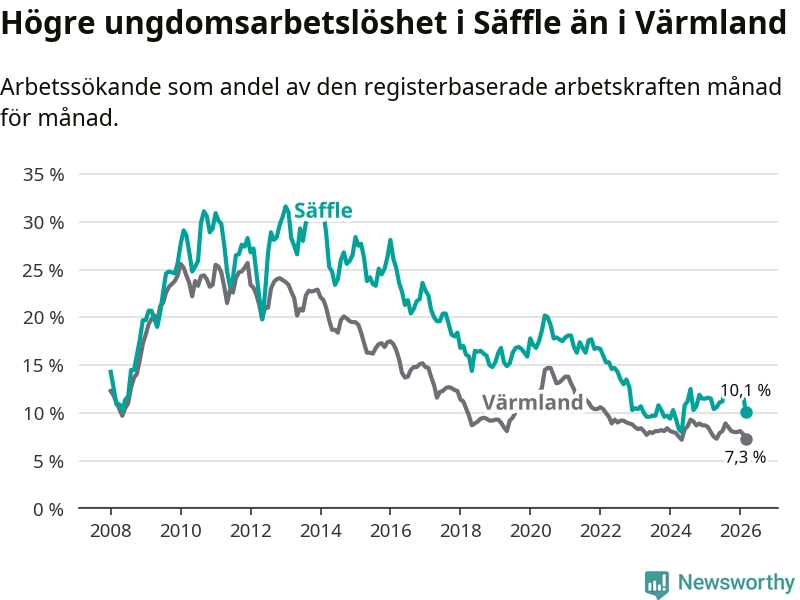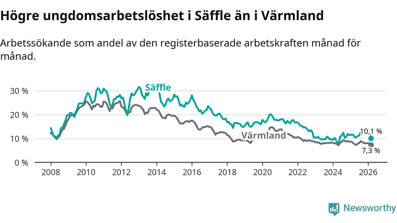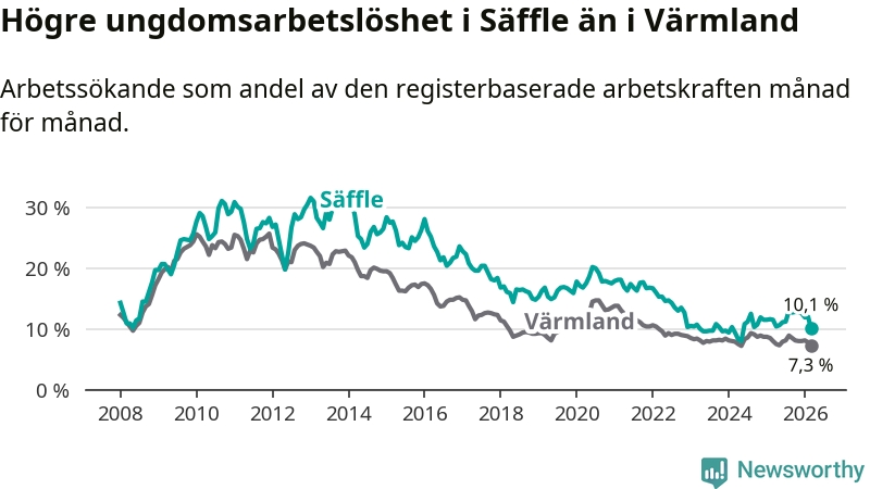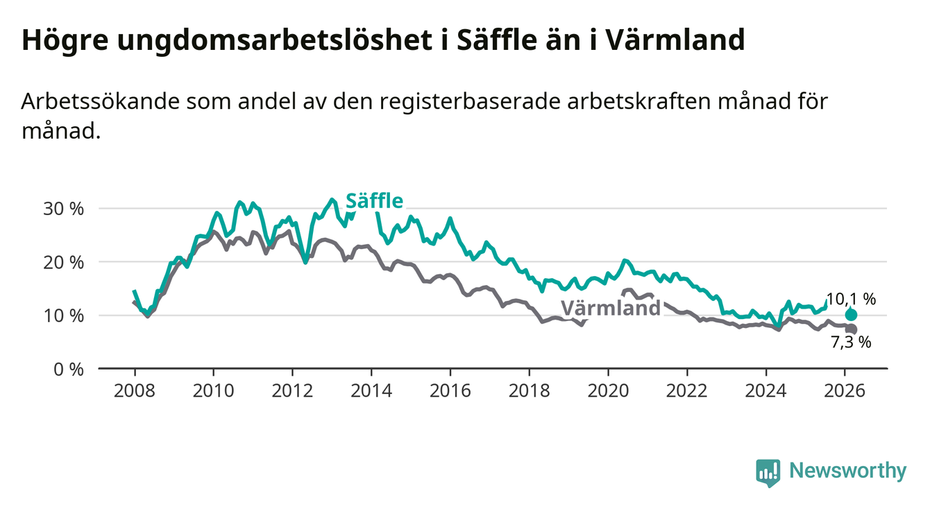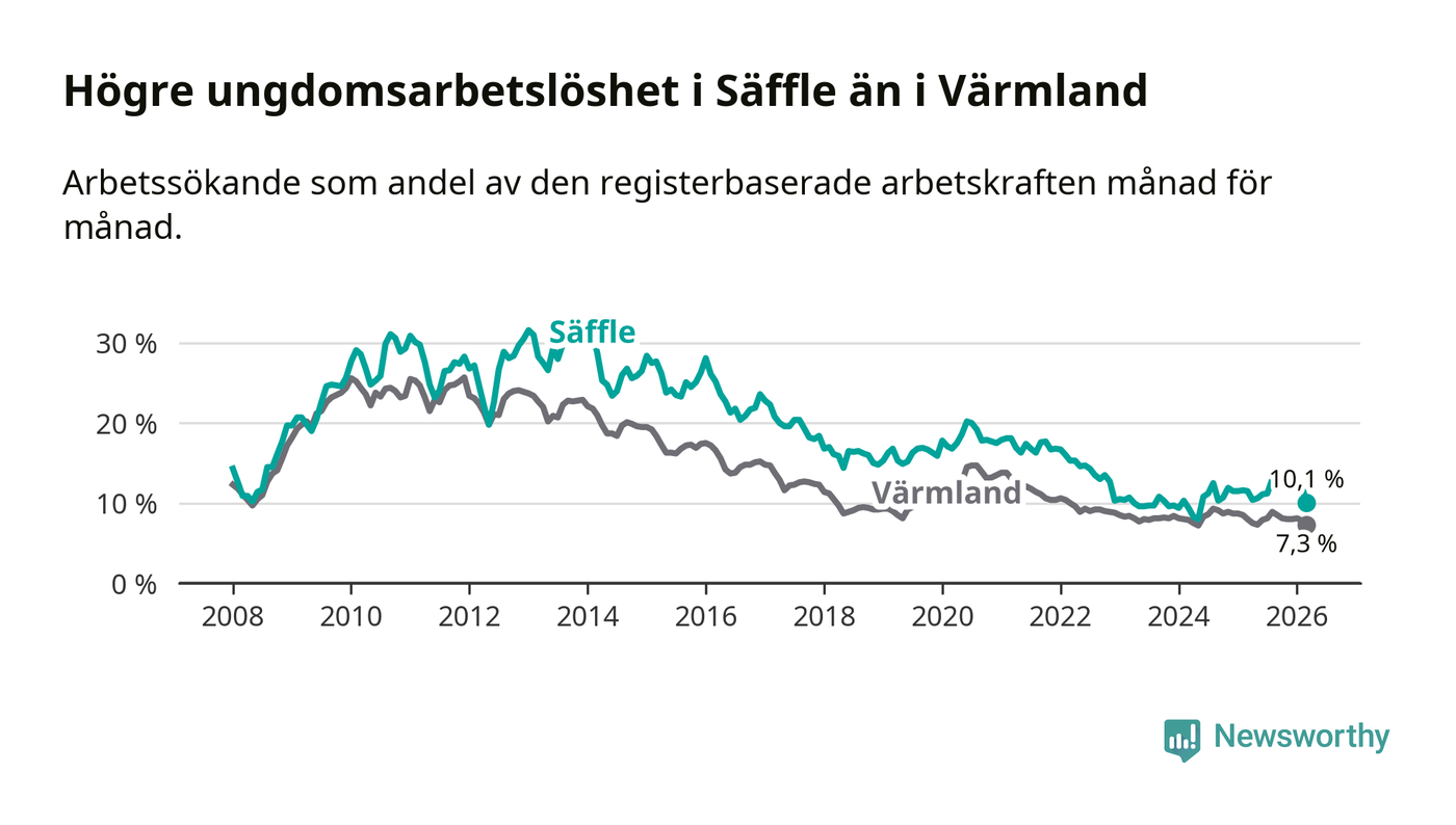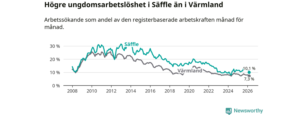Precis som den totala arbetslösheten ligger ungdomsarbetslösheten i Säffle högre än i Värmland som helhet. Skillnaden mellan kommunen och länet är 2,8 procentenheter.