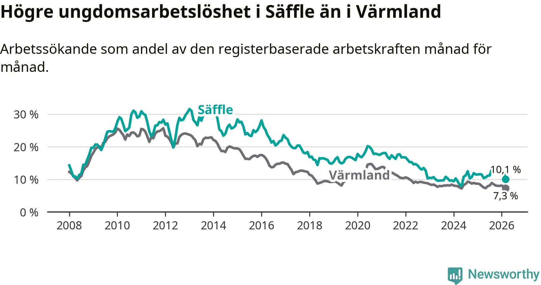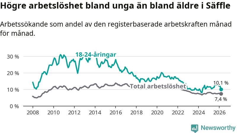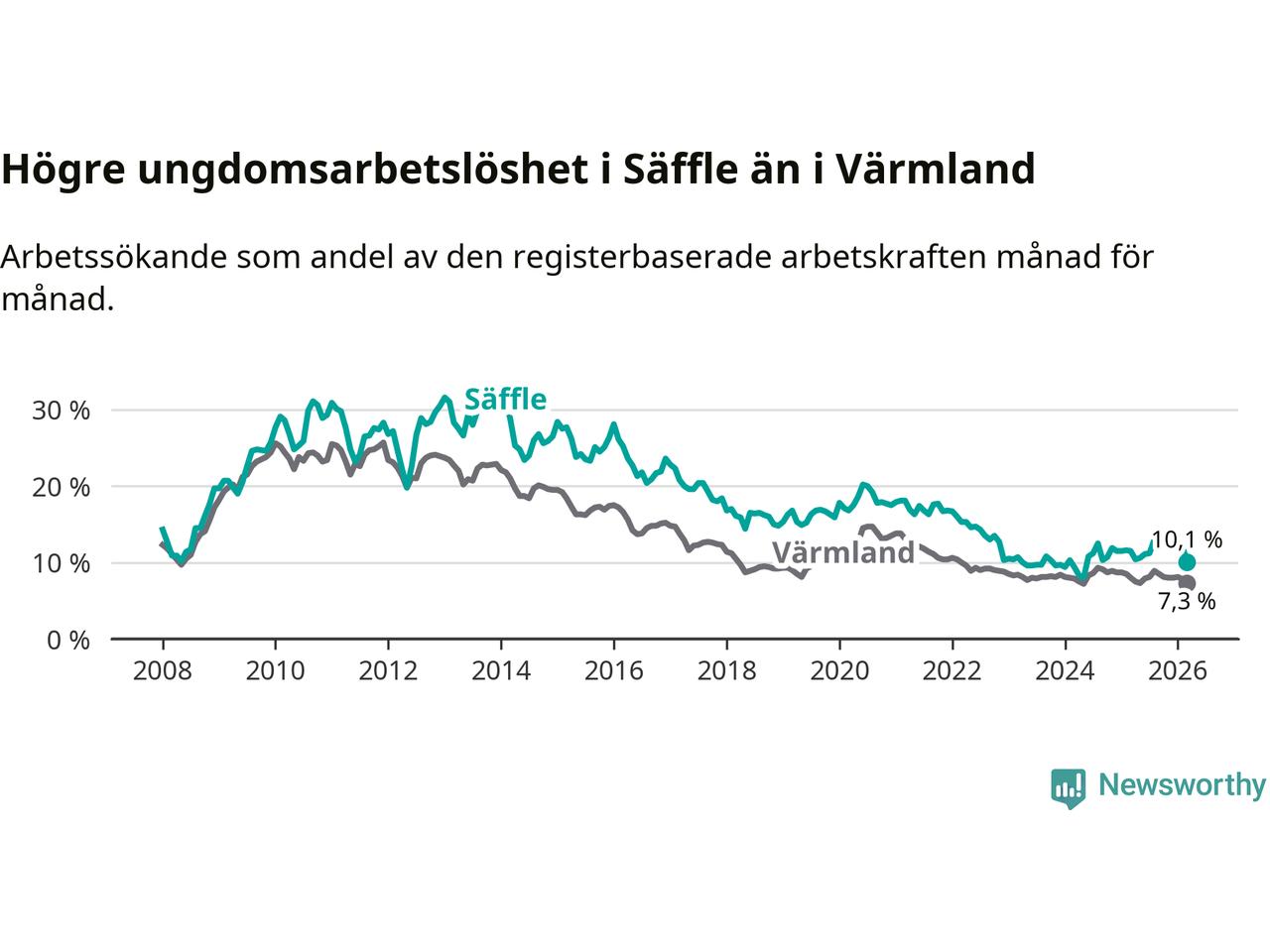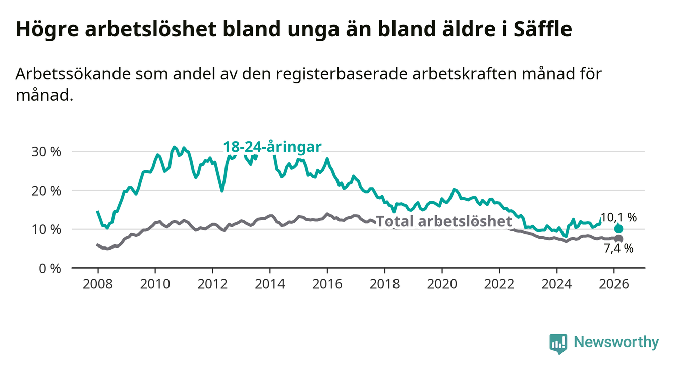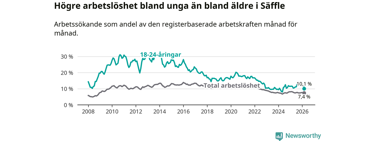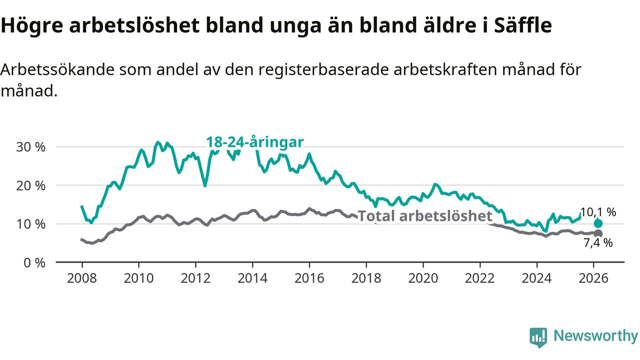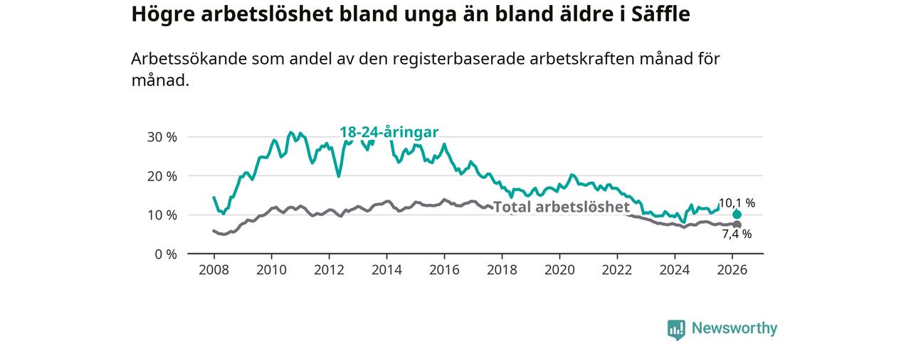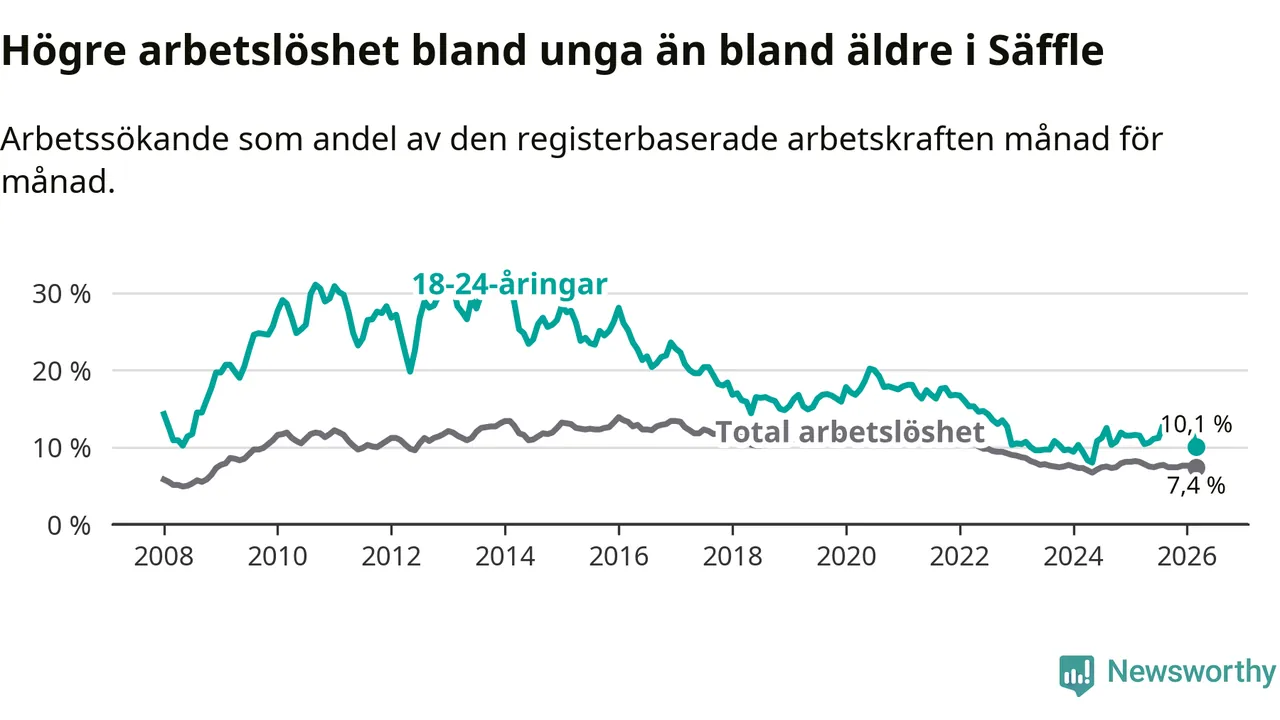 Precis som den totala arbetslösheten ligger ungdomsarbetslösheten i Säffle högre än i Värmland som helhet. Skillnaden mellan kommunen och länet är 2,8 procentenheter.