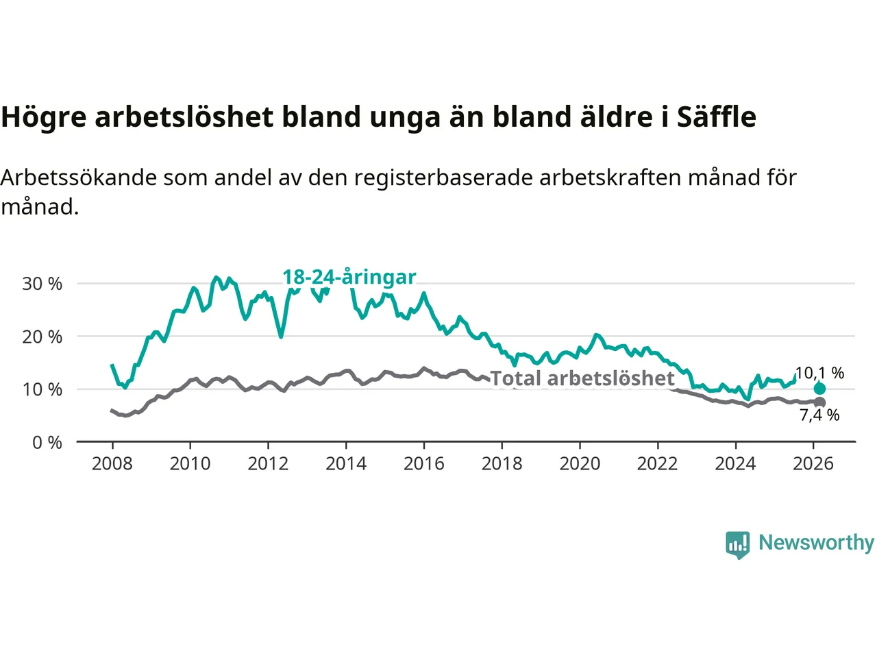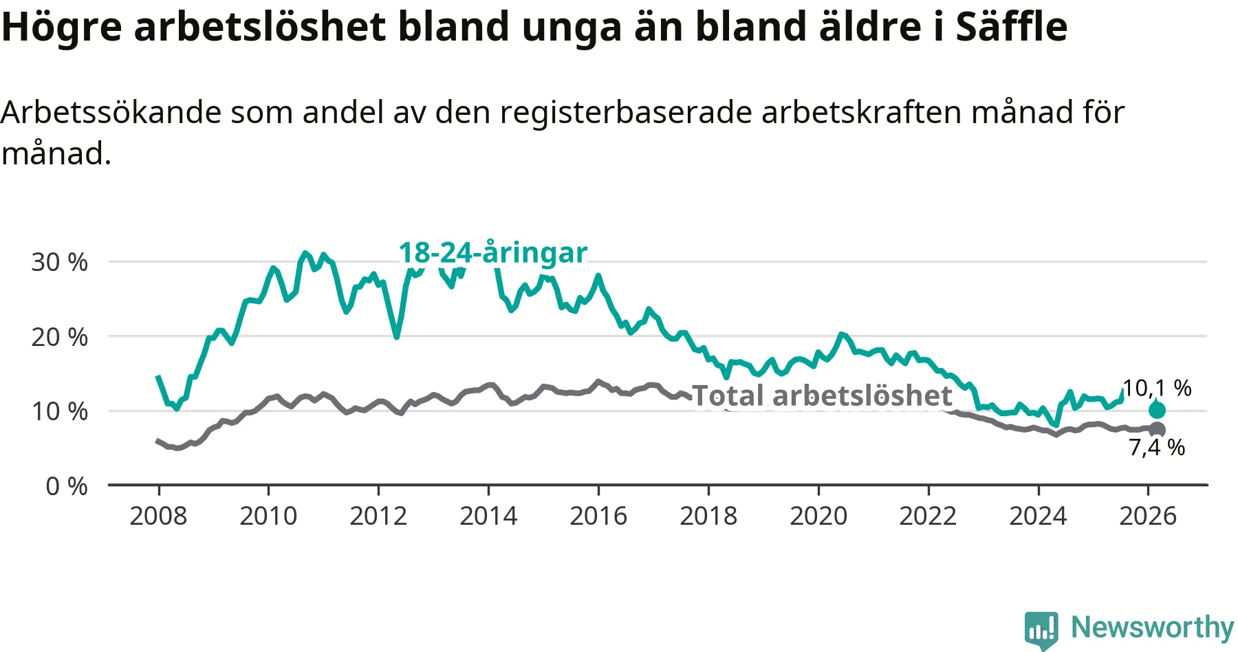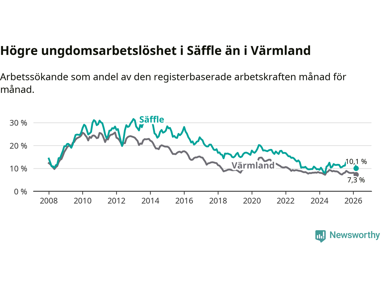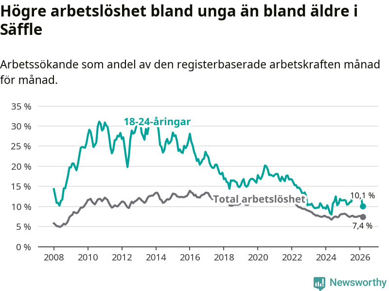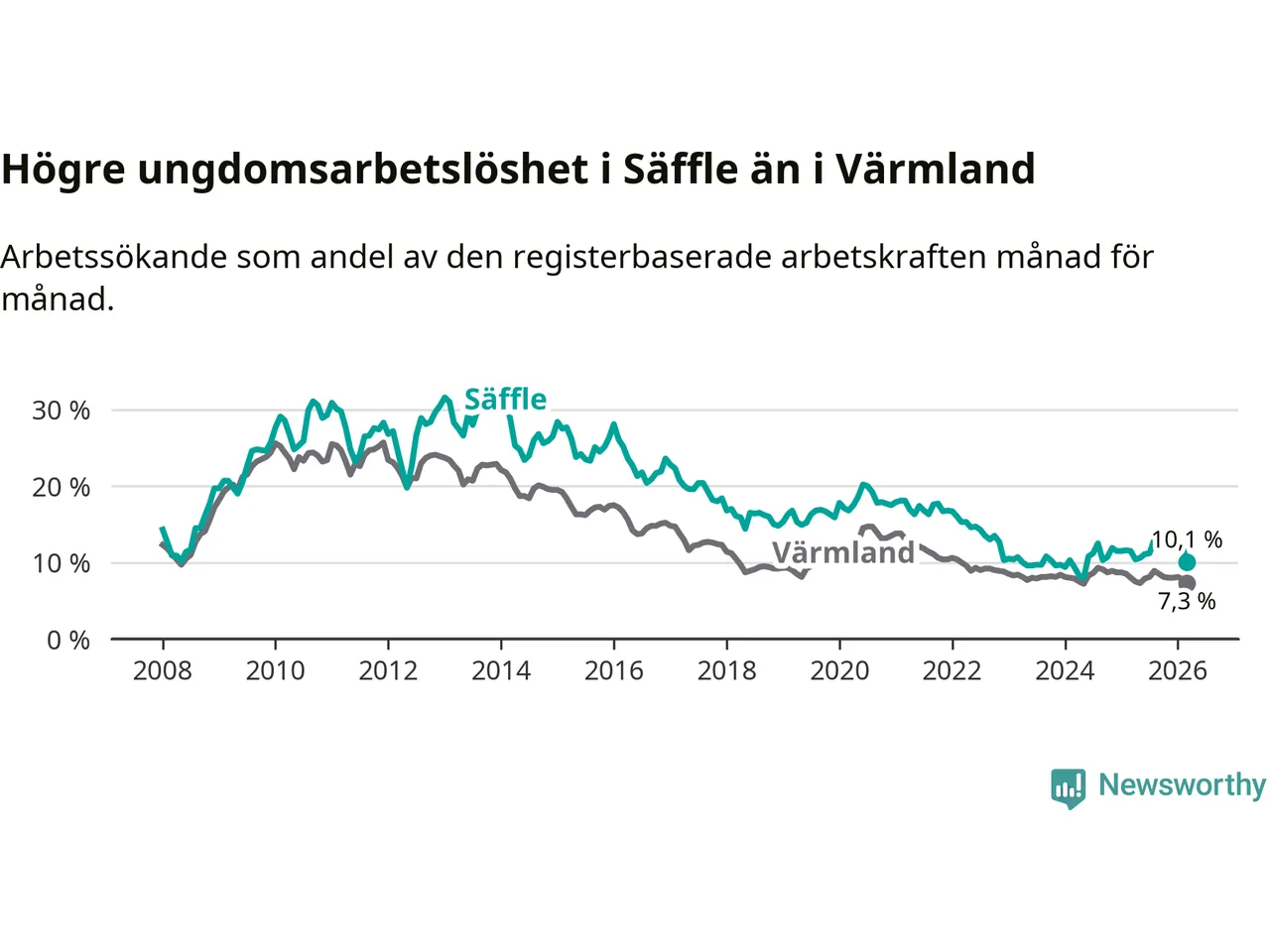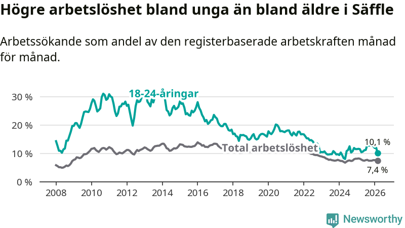 Precis som den totala arbetslösheten ligger ungdomsarbetslösheten i Säffle högre än i Värmland som helhet. Skillnaden mellan kommunen och länet är 2,8 procentenheter.