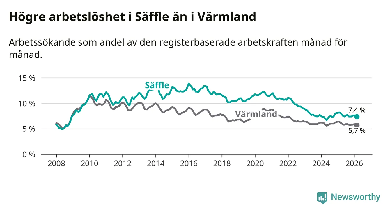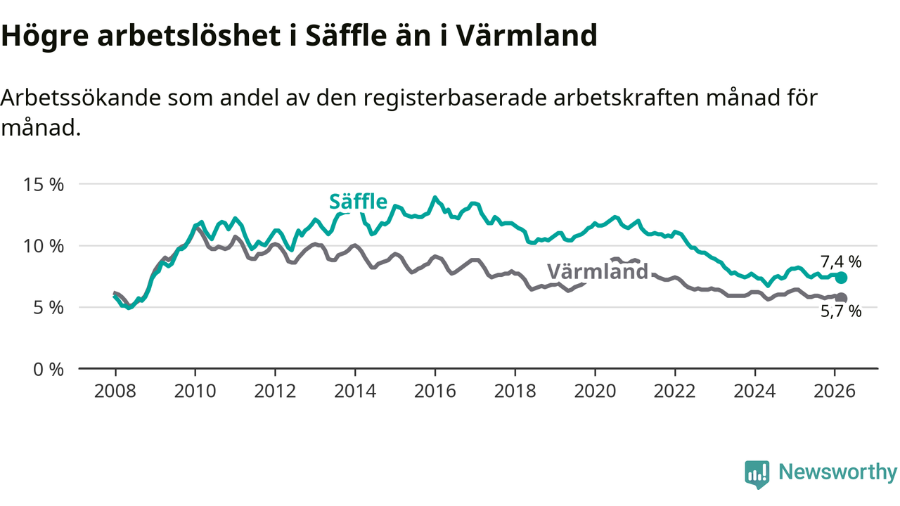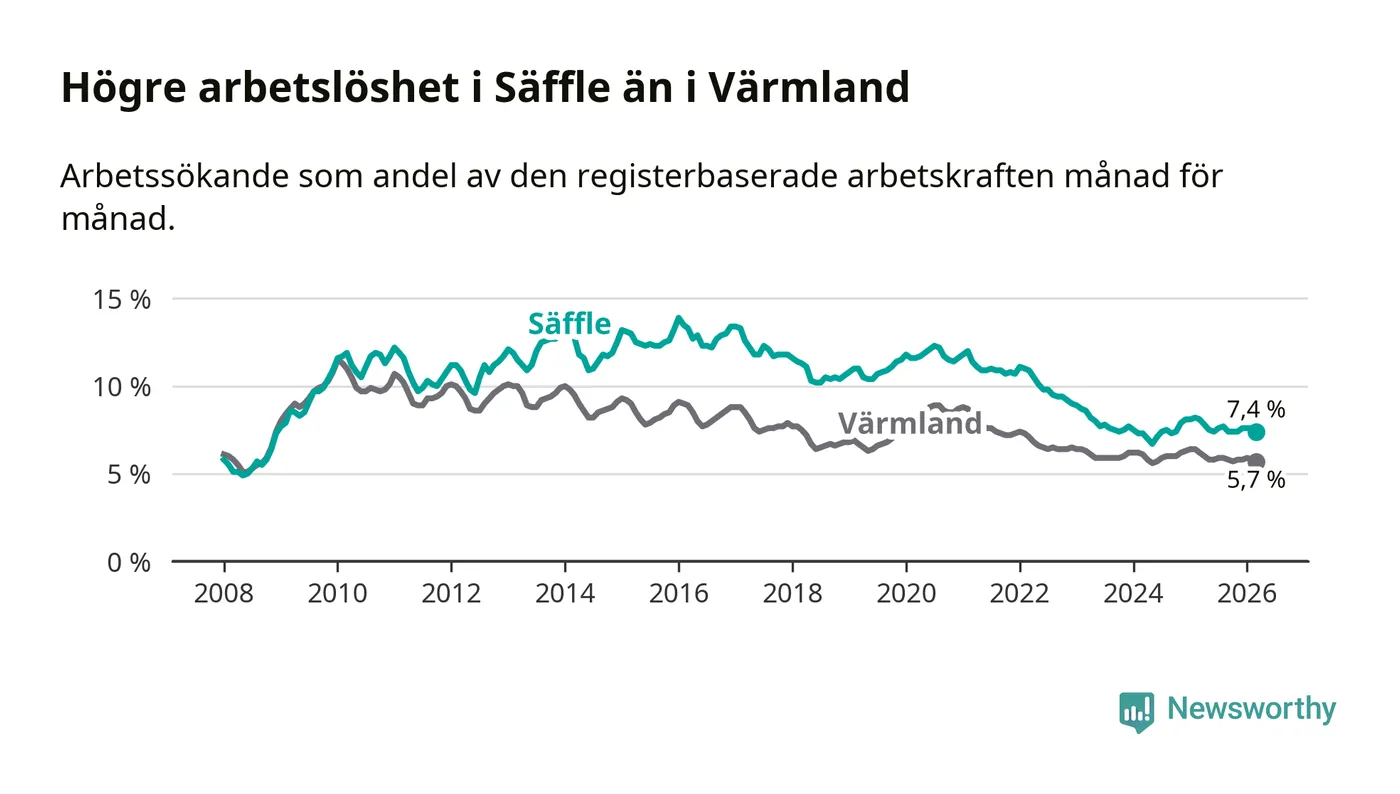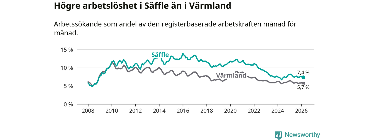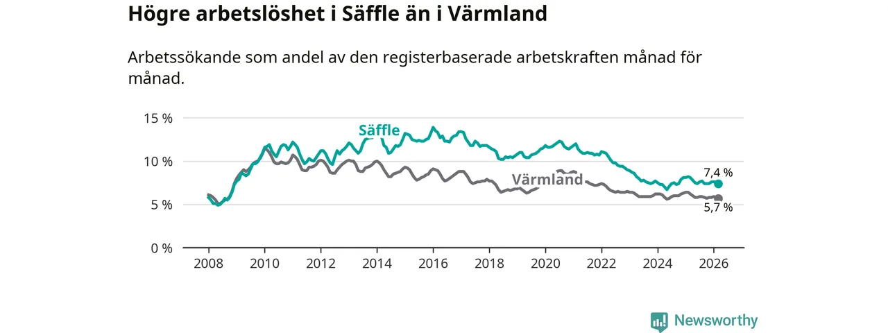 Under mars månad rapporterade Säffle kommun en total arbetslöshet på 7,4 procent. Det är en minskning jämfört med samma tidpunkt i fjol (−0,7 procentenheter). Även i Värmlands län sjunker arbetslösheten .