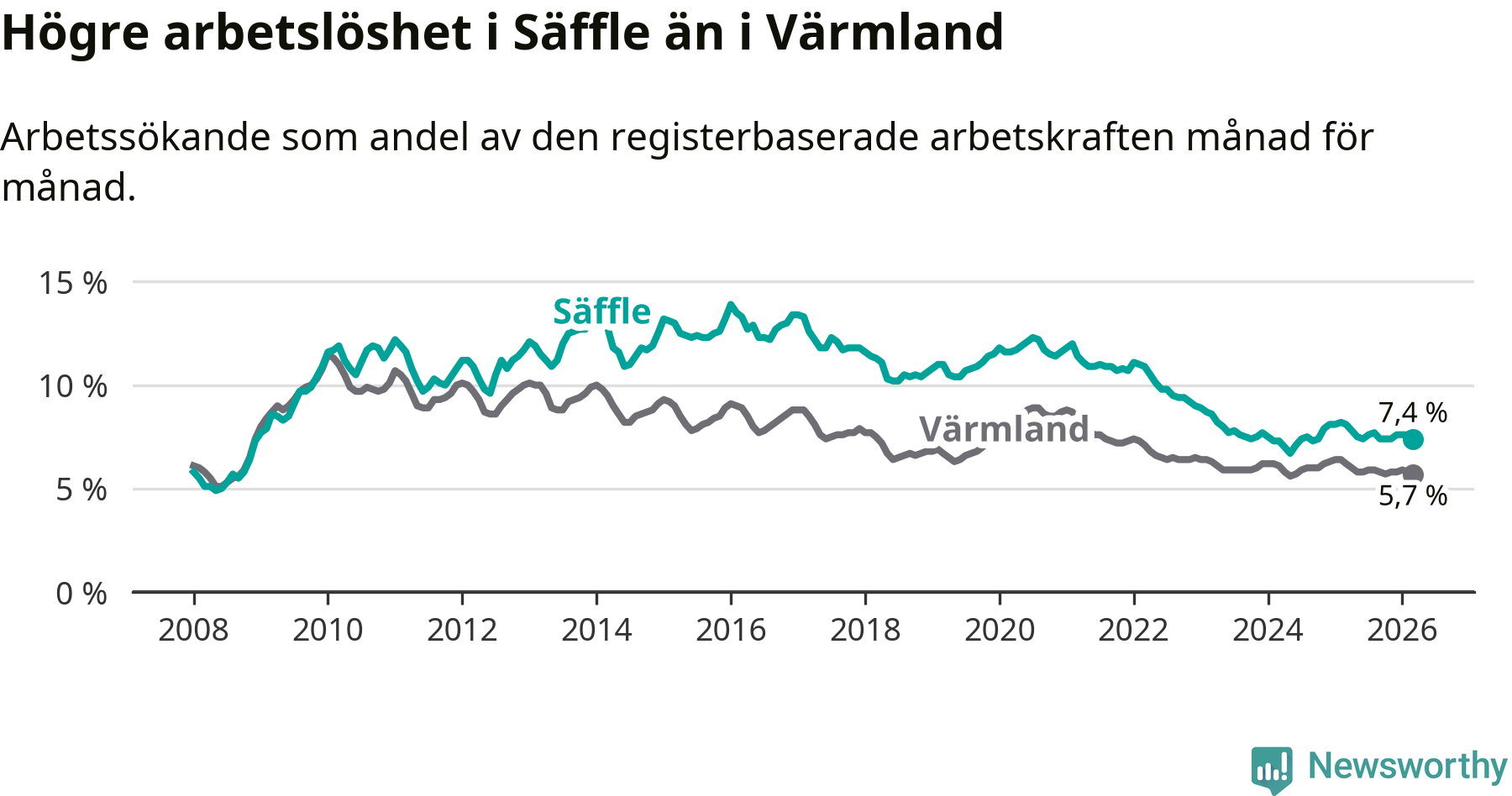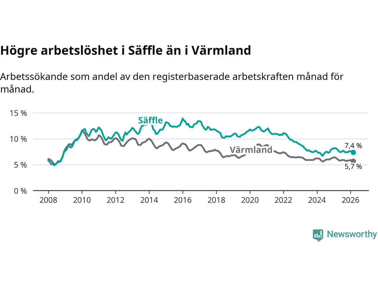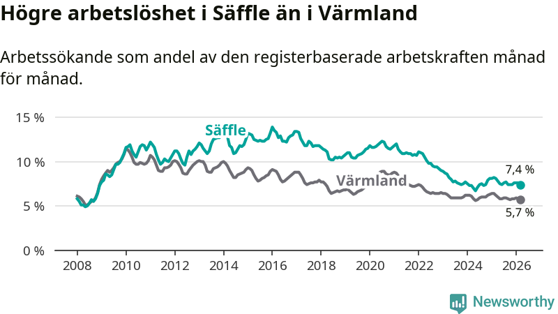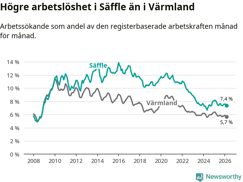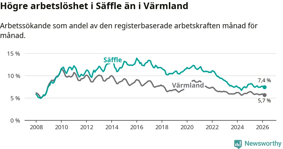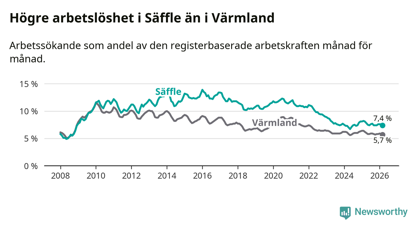 Under mars månad rapporterade Säffle kommun en total arbetslöshet på 7,4 procent. Det är en minskning jämfört med samma tidpunkt i fjol (−0,7 procentenheter). Även i Värmlands län sjunker arbetslösheten .