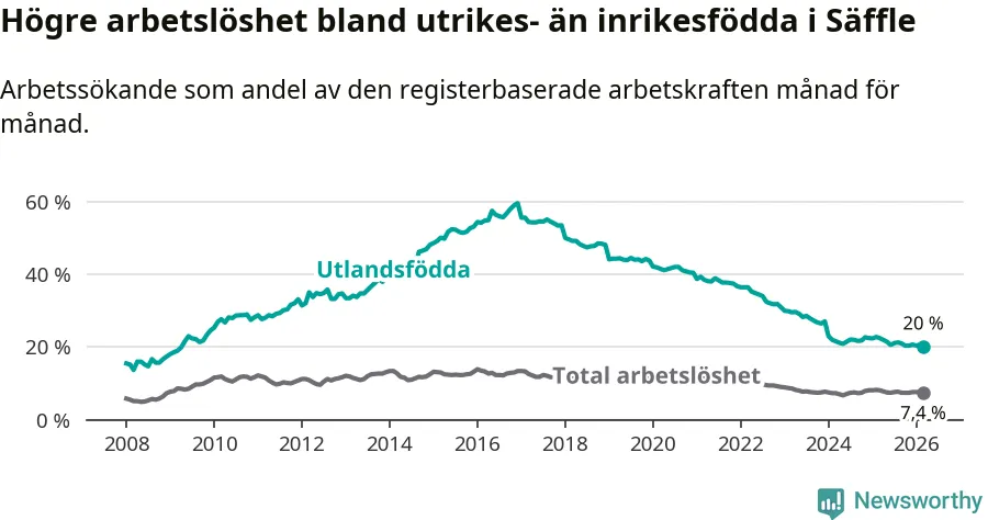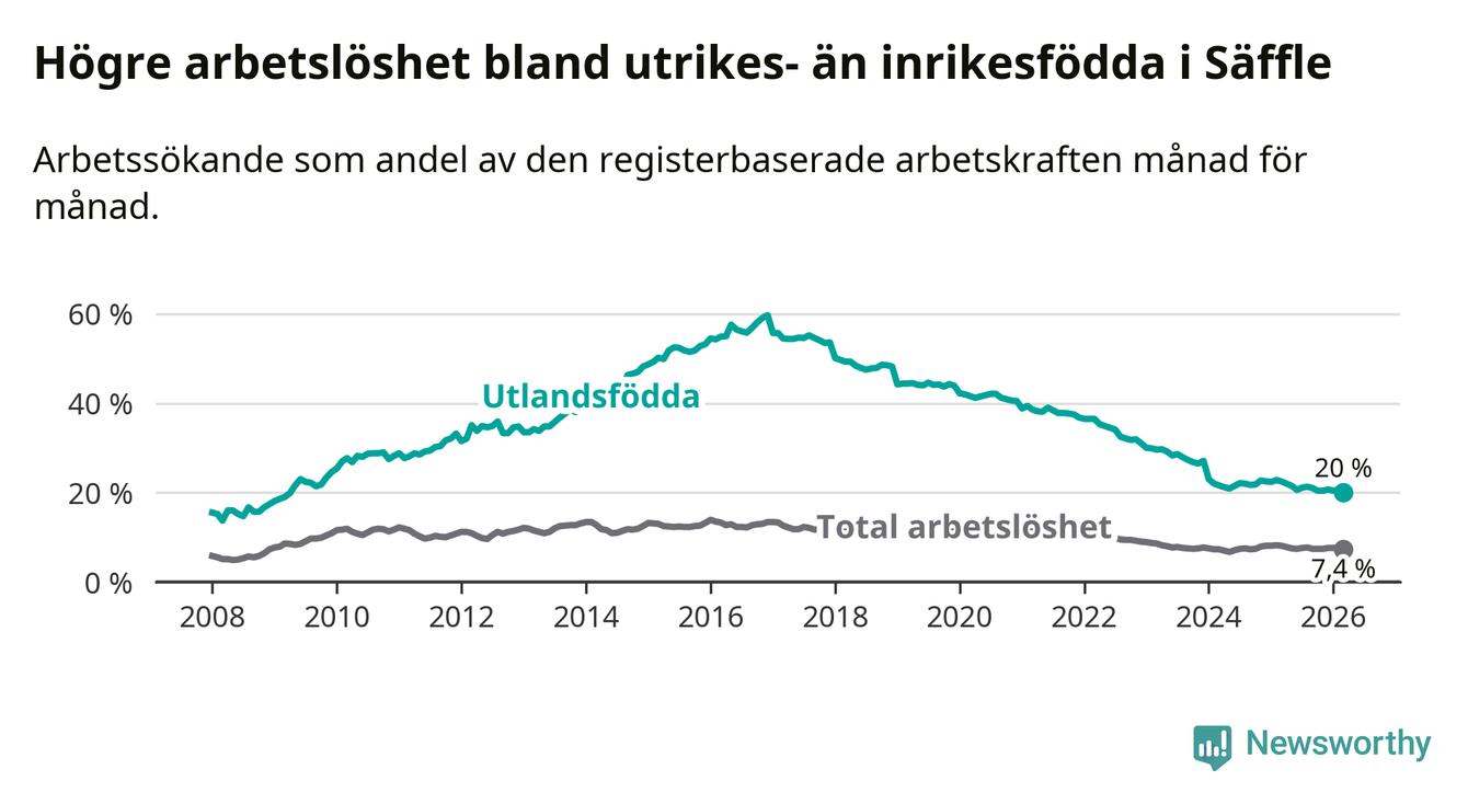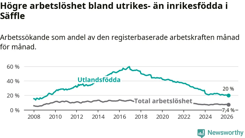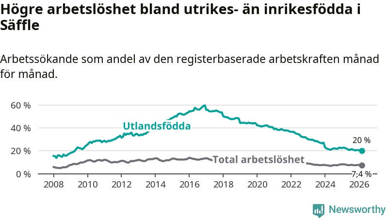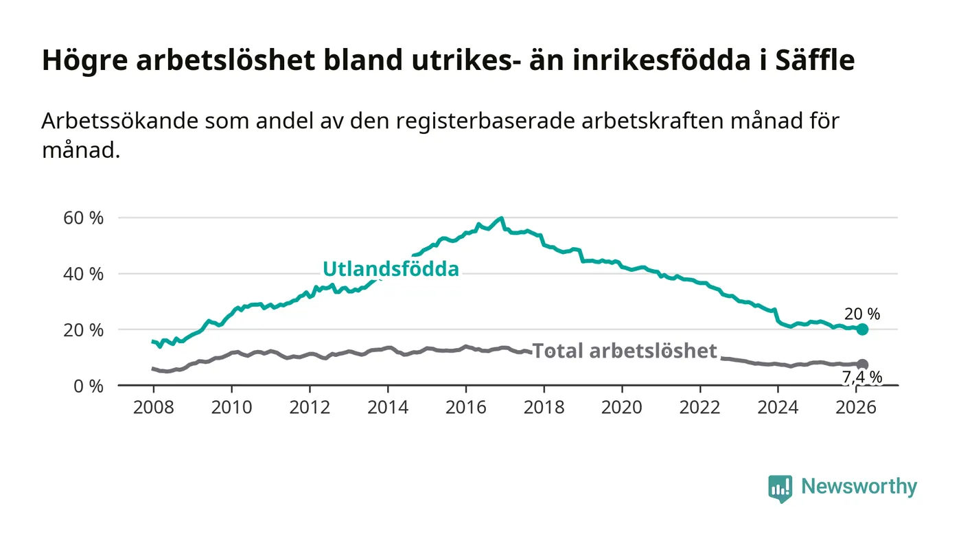 Arbetslösheten bland utlandsfödda var 20,0 procent i Säffle under mars månad, motsvarande 203 av 1 015 personer. Det är 2,5 procentenheter färre än vid samma tidpunkt i fjol (−29 om man räknar personer). Därmed är de utlandsföddas arbetslöshet lägre än vid samma tidpunkt i fjol för tionde månaden i följd. Sedan maj 2025 har arbetslösheten bland utlandsfödda minskat från 21,5 till 20,0 procent. Den nuvarande arbetslöshetsnivån är den lägsta sedan april 2009.