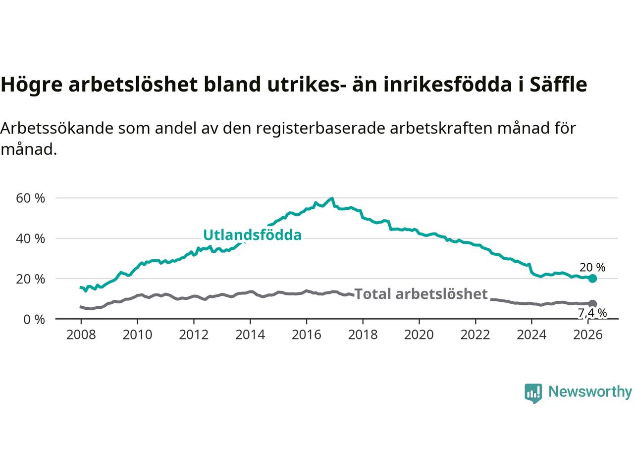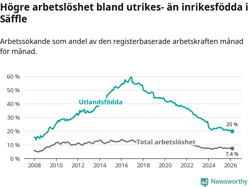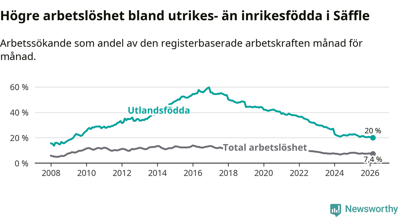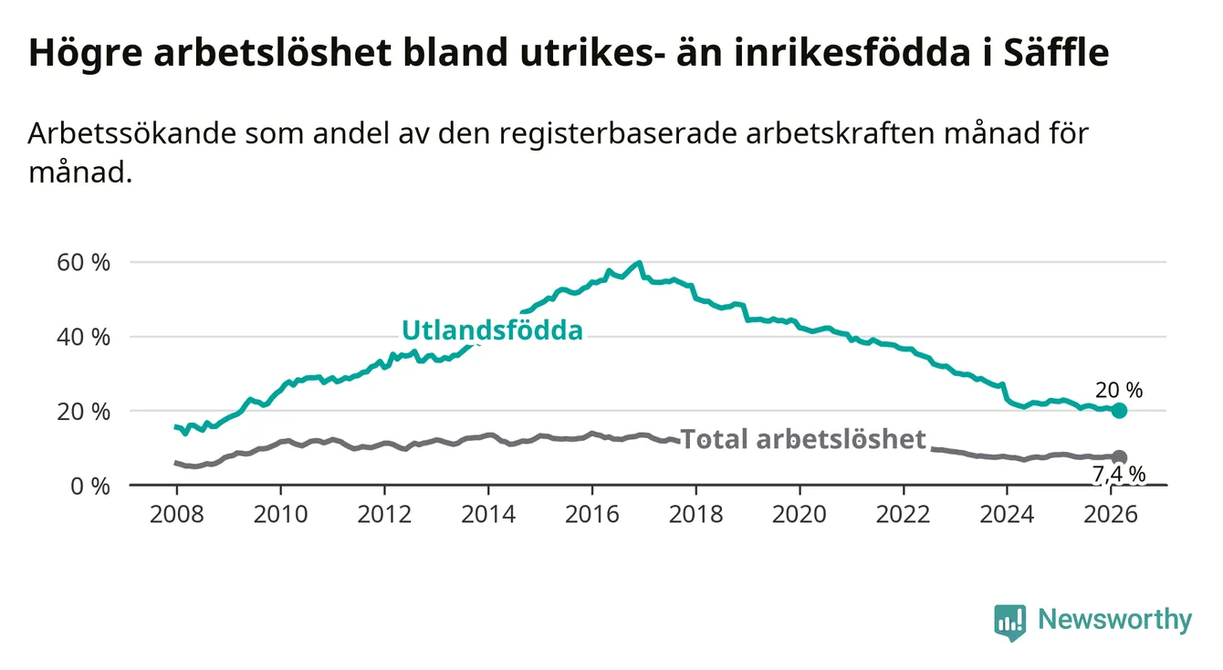 Arbetslösheten bland utlandsfödda var 20,0 procent i Säffle under mars månad, motsvarande 203 av 1 015 personer. Det är 2,5 procentenheter färre än vid samma tidpunkt i fjol (−29 om man räknar personer). Därmed är de utlandsföddas arbetslöshet lägre än vid samma tidpunkt i fjol för tionde månaden i följd. Sedan maj 2025 har arbetslösheten bland utlandsfödda minskat från 21,5 till 20,0 procent. Den nuvarande arbetslöshetsnivån är den lägsta sedan april 2009.