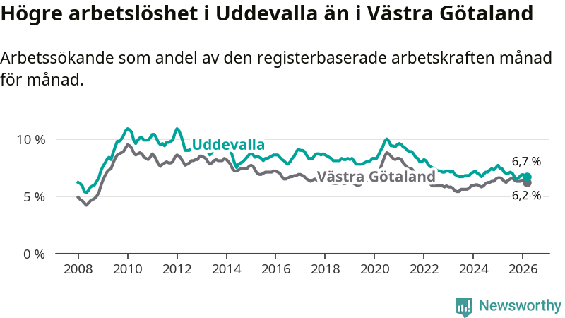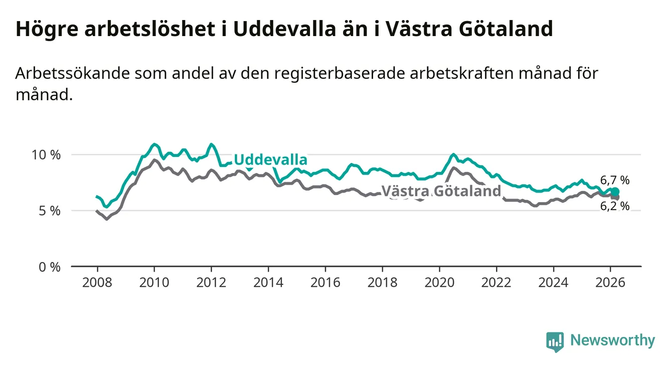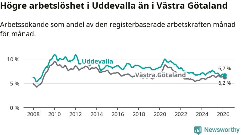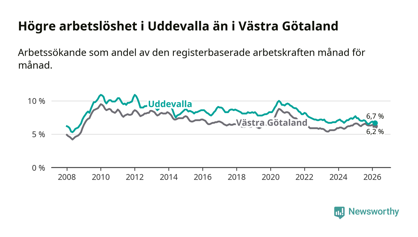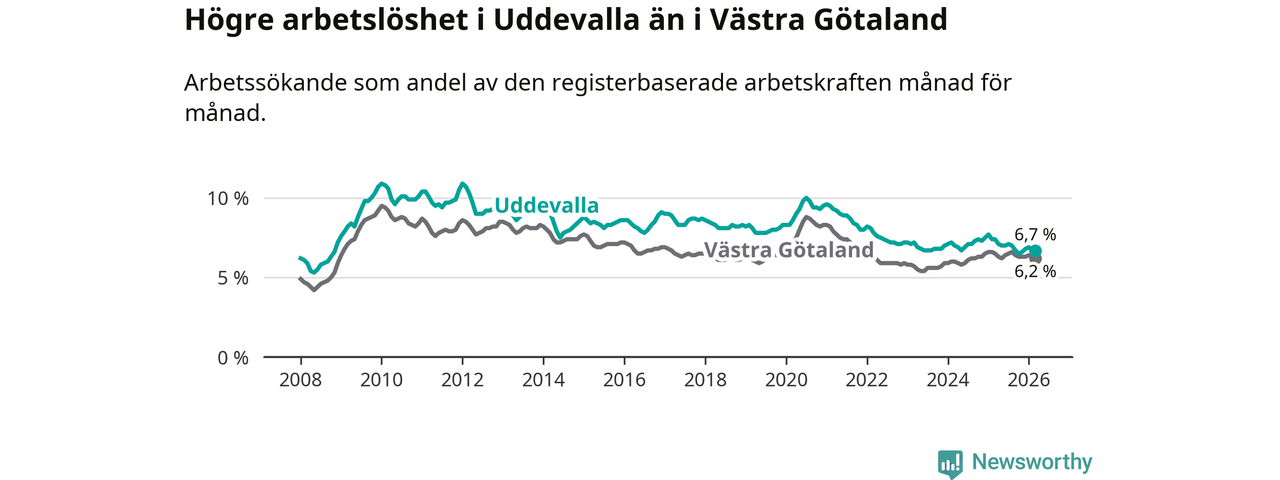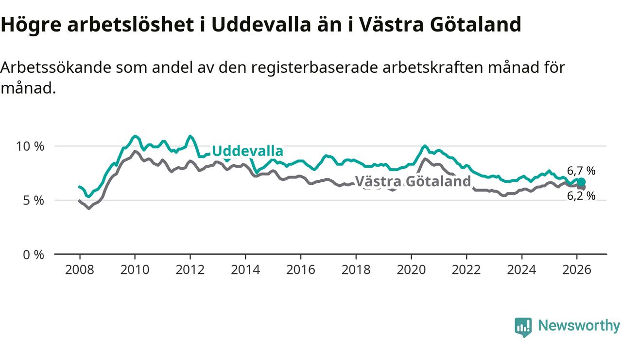 Under mars månad rapporterade Uddevalla kommun en total arbetslöshet på 6,7 procent. Det är en minskning jämfört med samma tidpunkt i fjol (−0,7 procentenheter). Även i Västra Götalands län sjunker arbetslösheten .