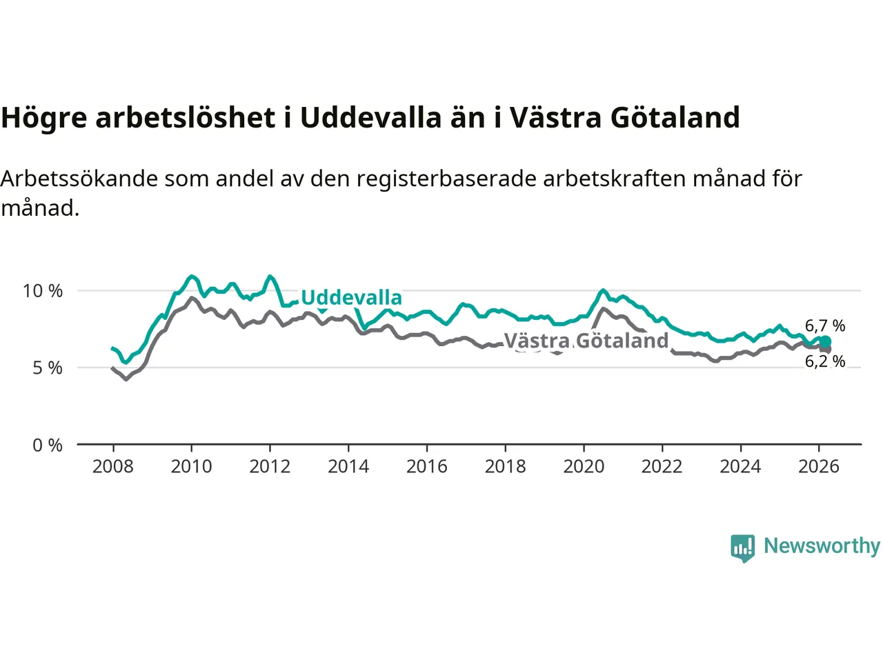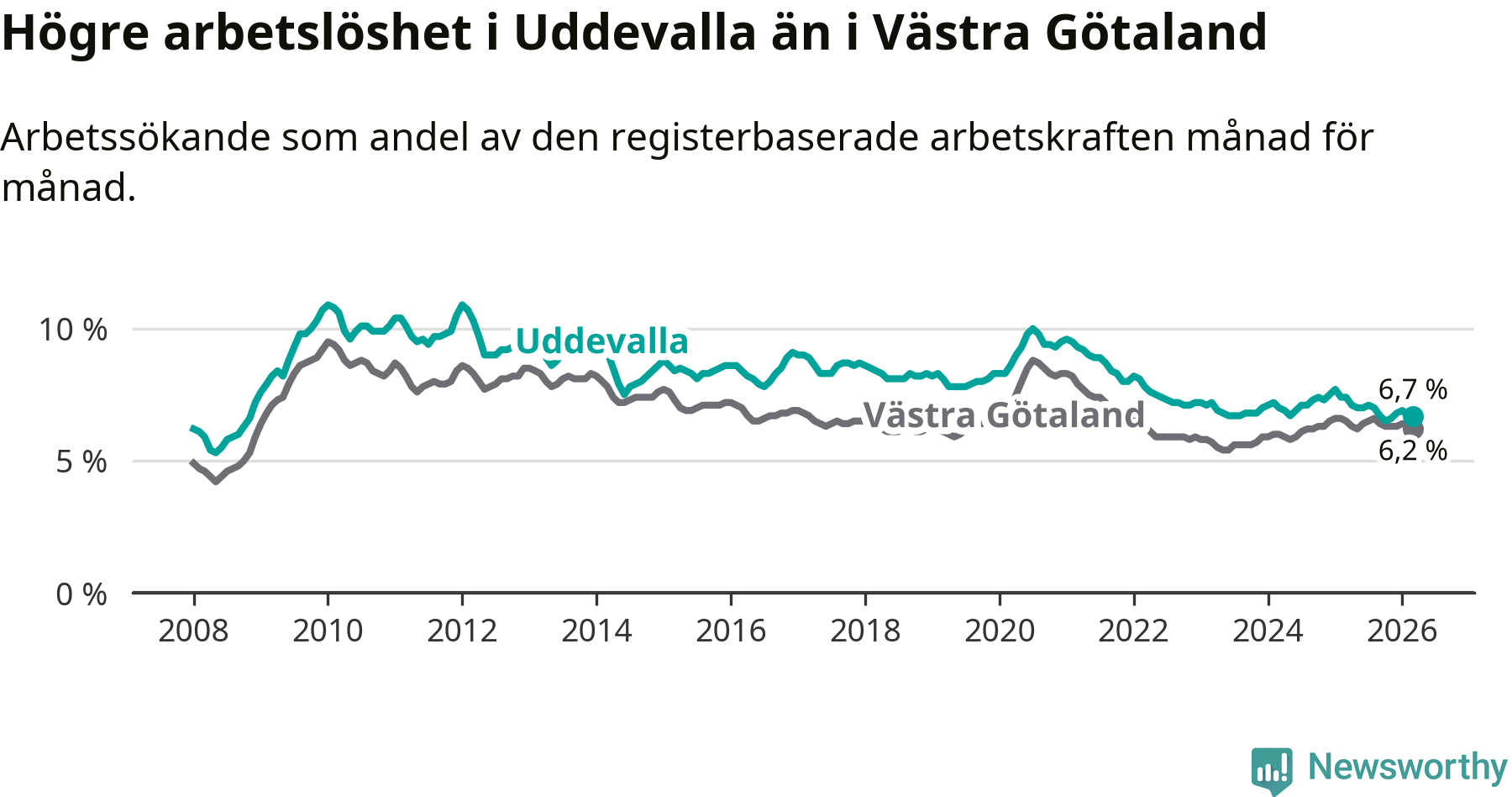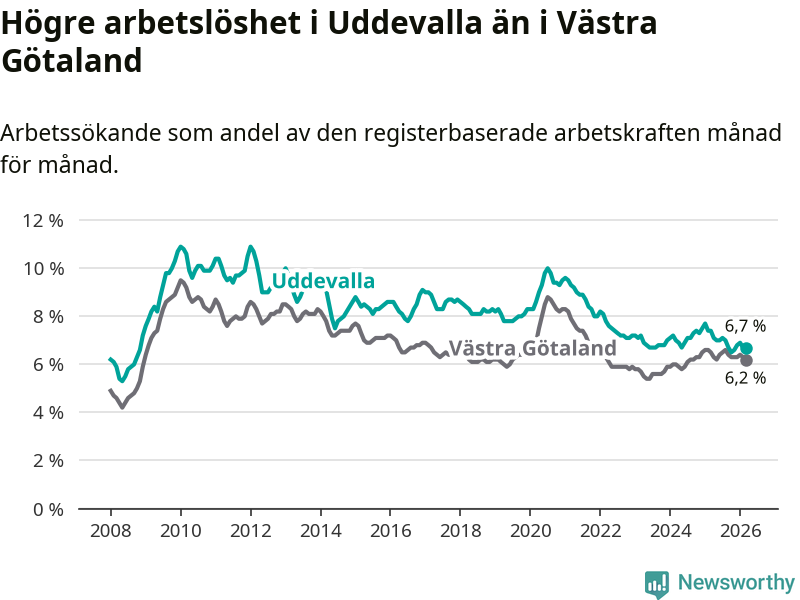 Graf: Arbetslöshet i Uddevalla kommun och Västra Götalands län