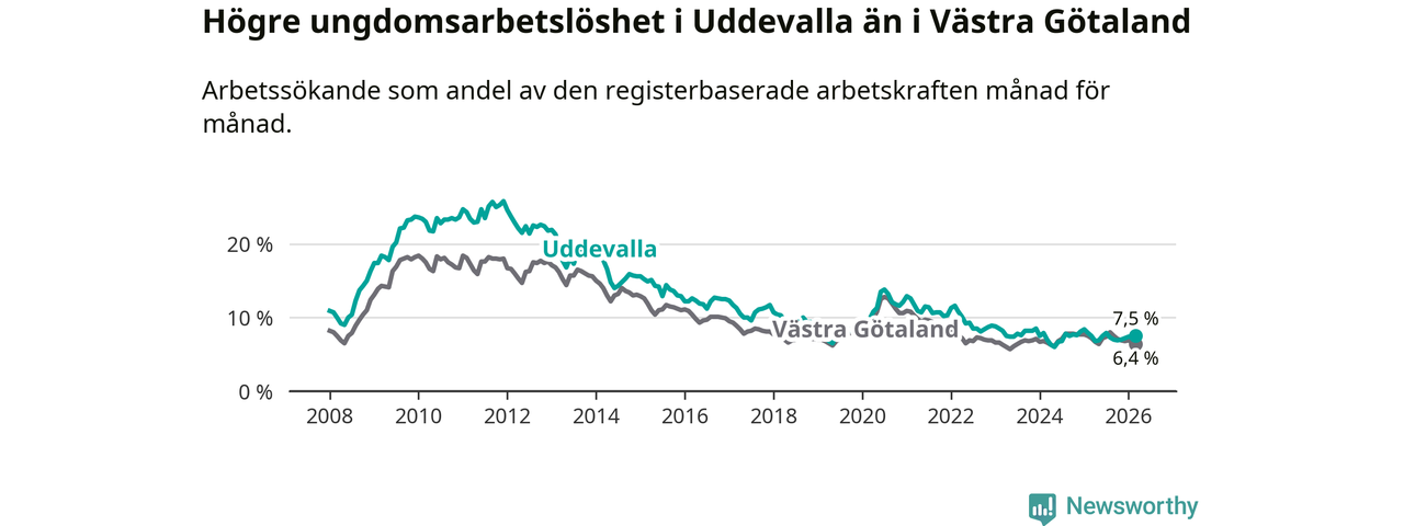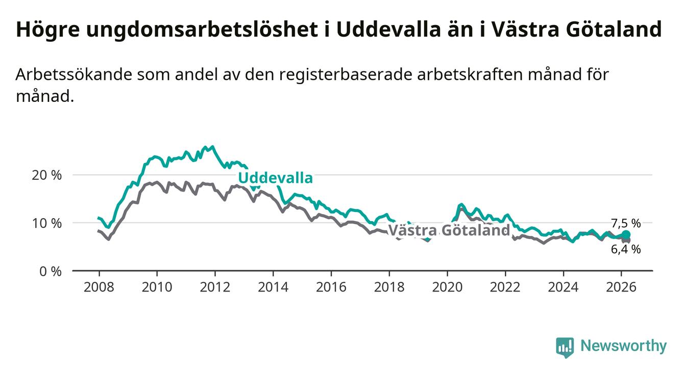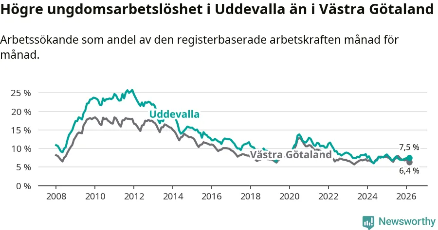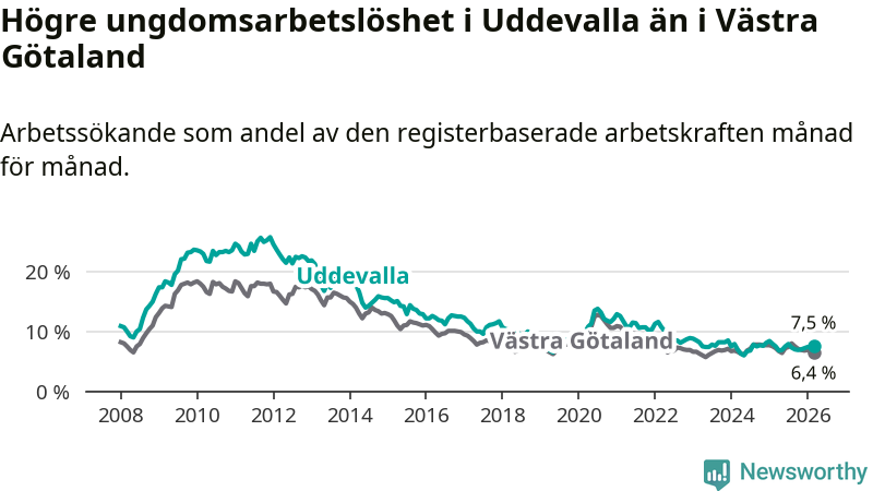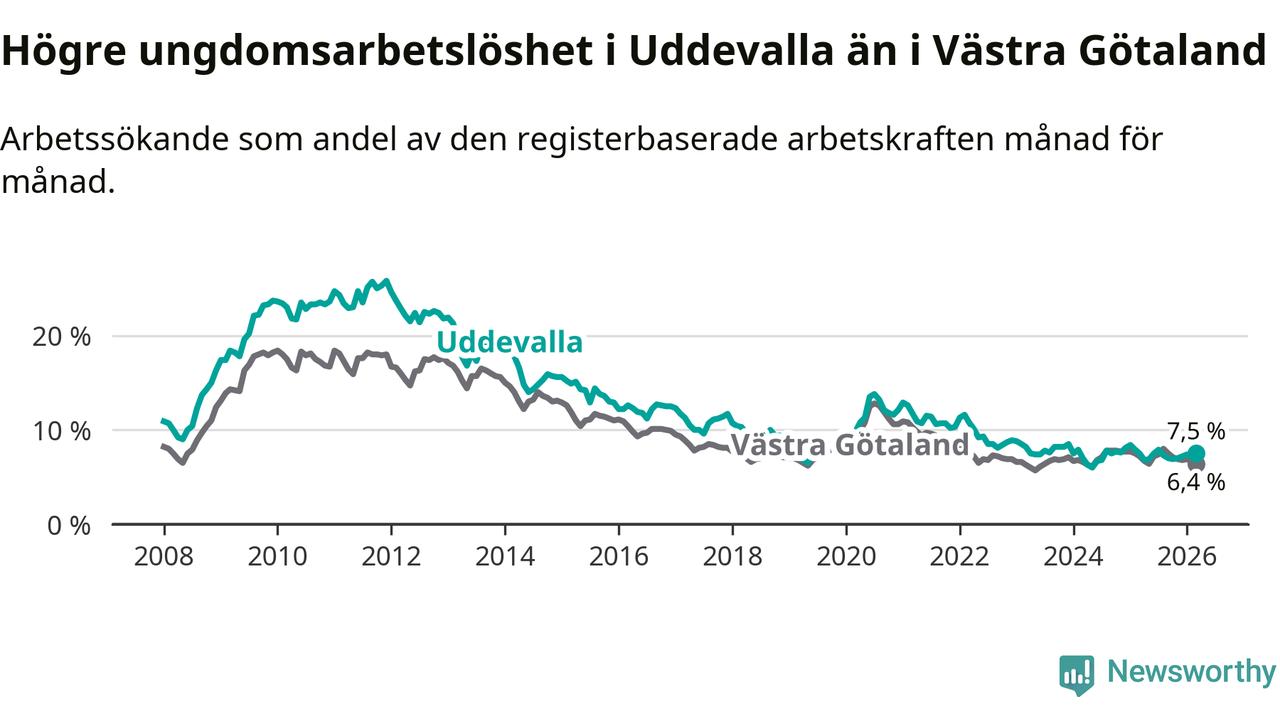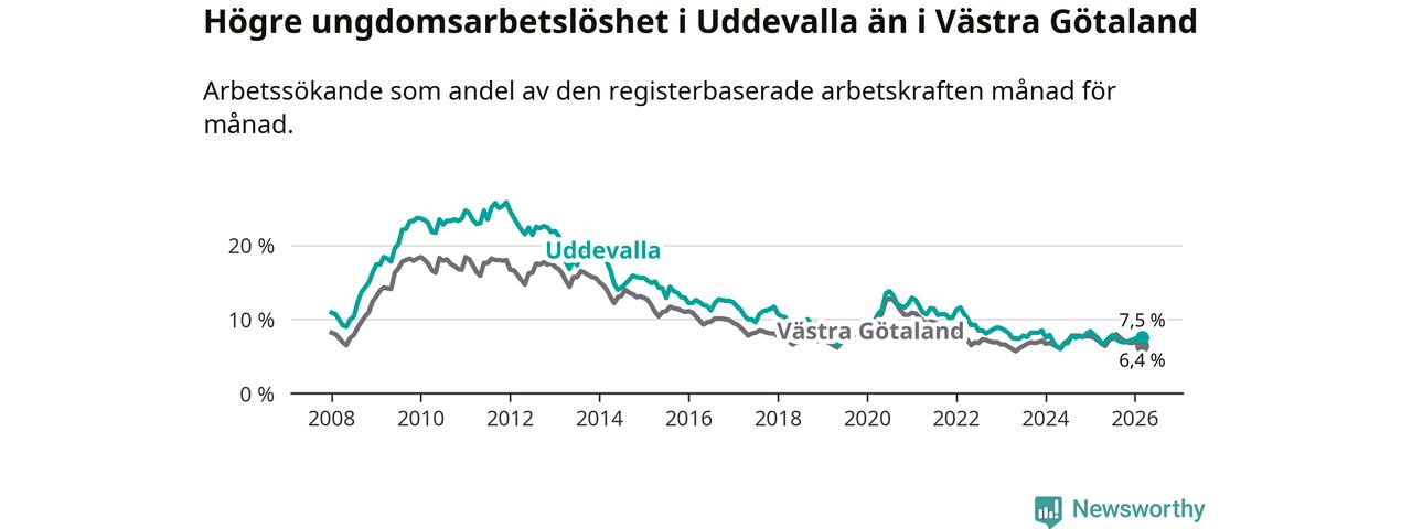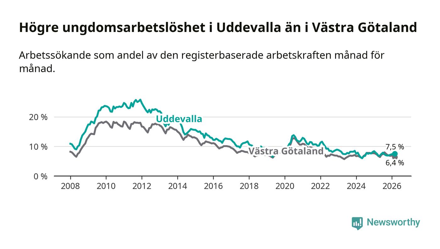 Precis som den totala arbetslösheten ligger ungdomsarbetslösheten i Uddevalla högre än i Västra Götaland som helhet. Skillnaden mellan kommunen och länet är 1,1 procentenheter.