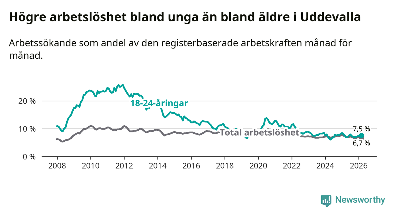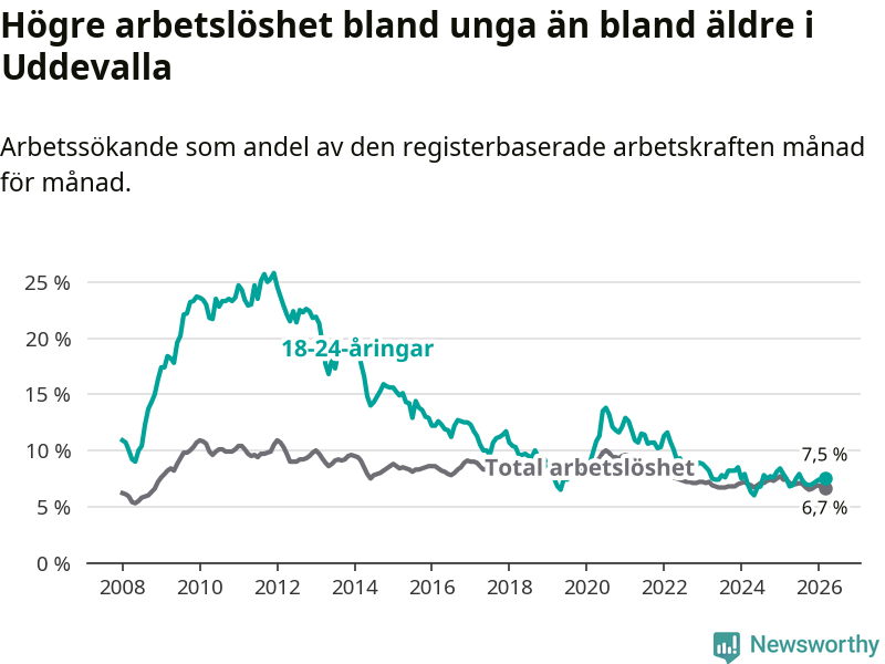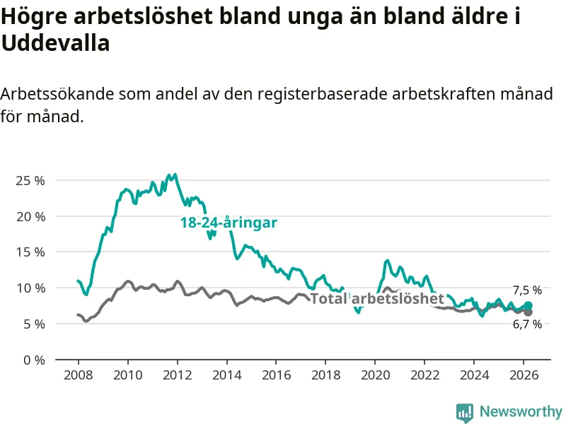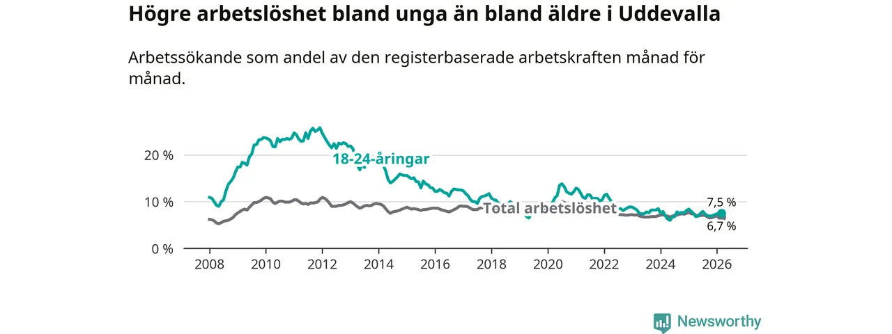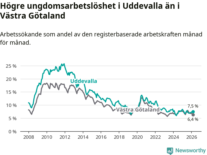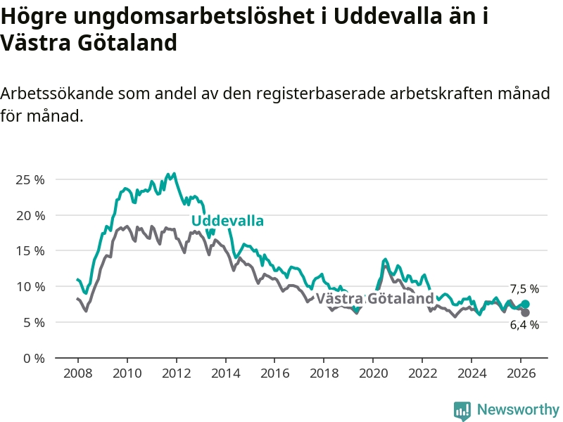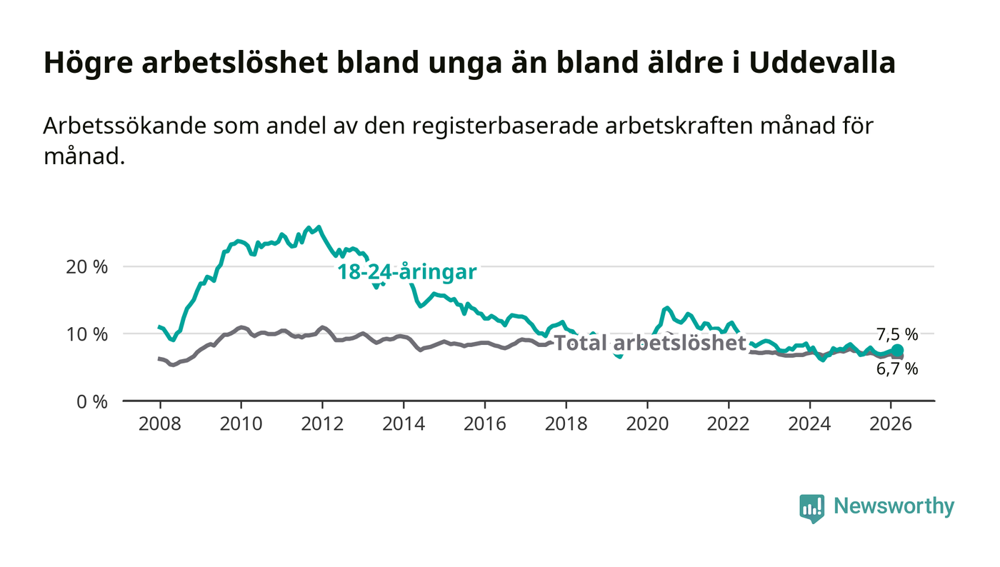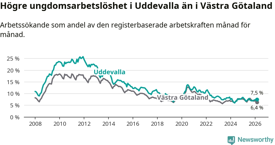Precis som den totala arbetslösheten ligger ungdomsarbetslösheten i Uddevalla högre än i Västra Götaland som helhet. Skillnaden mellan kommunen och länet är 1,1 procentenheter.