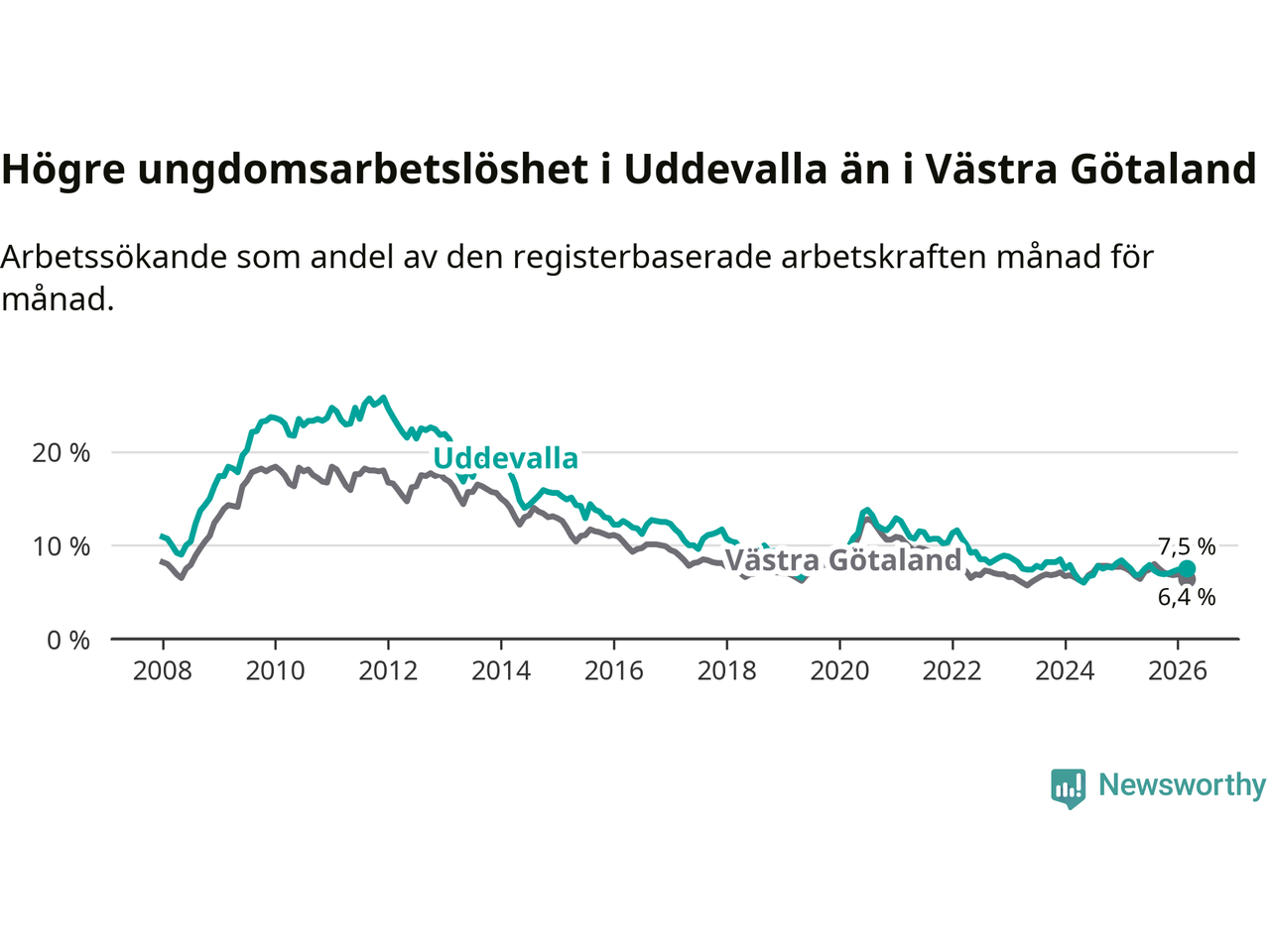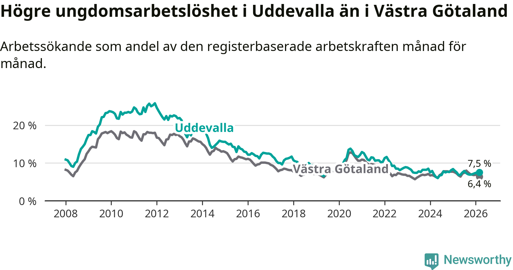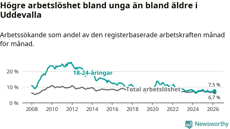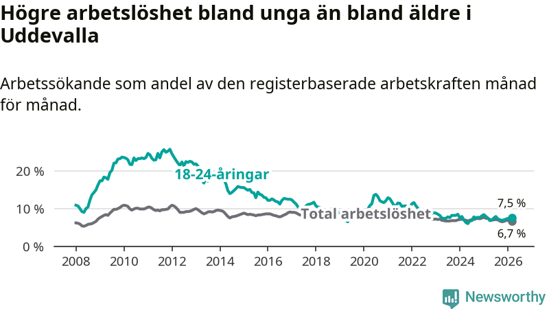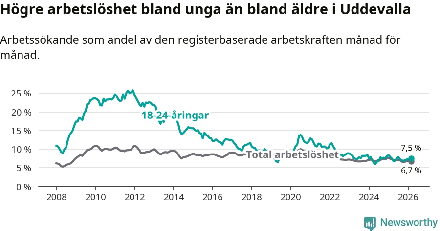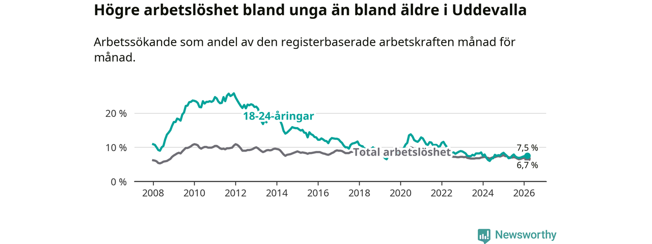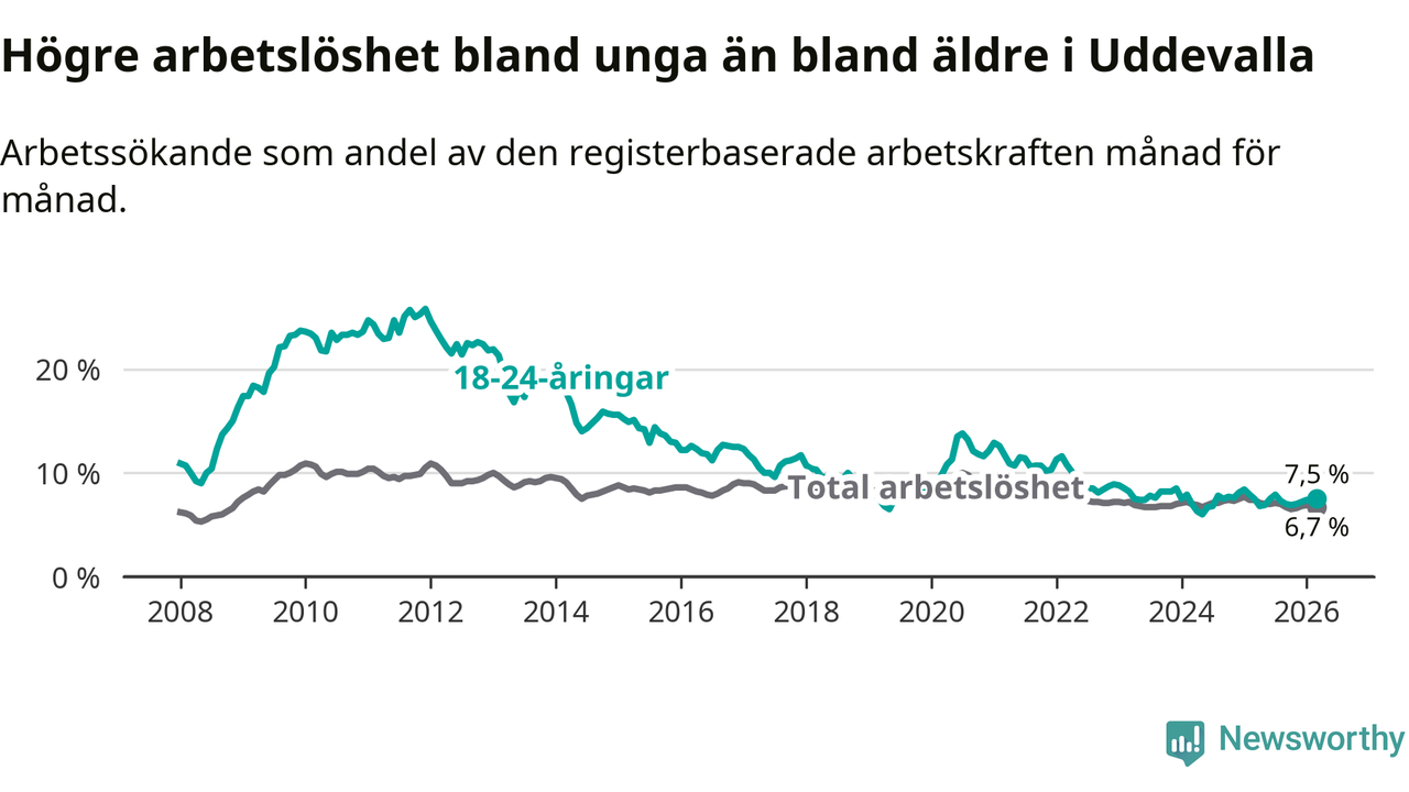Precis som den totala arbetslösheten ligger ungdomsarbetslösheten i Uddevalla högre än i Västra Götaland som helhet. Skillnaden mellan kommunen och länet är 1,1 procentenheter.
