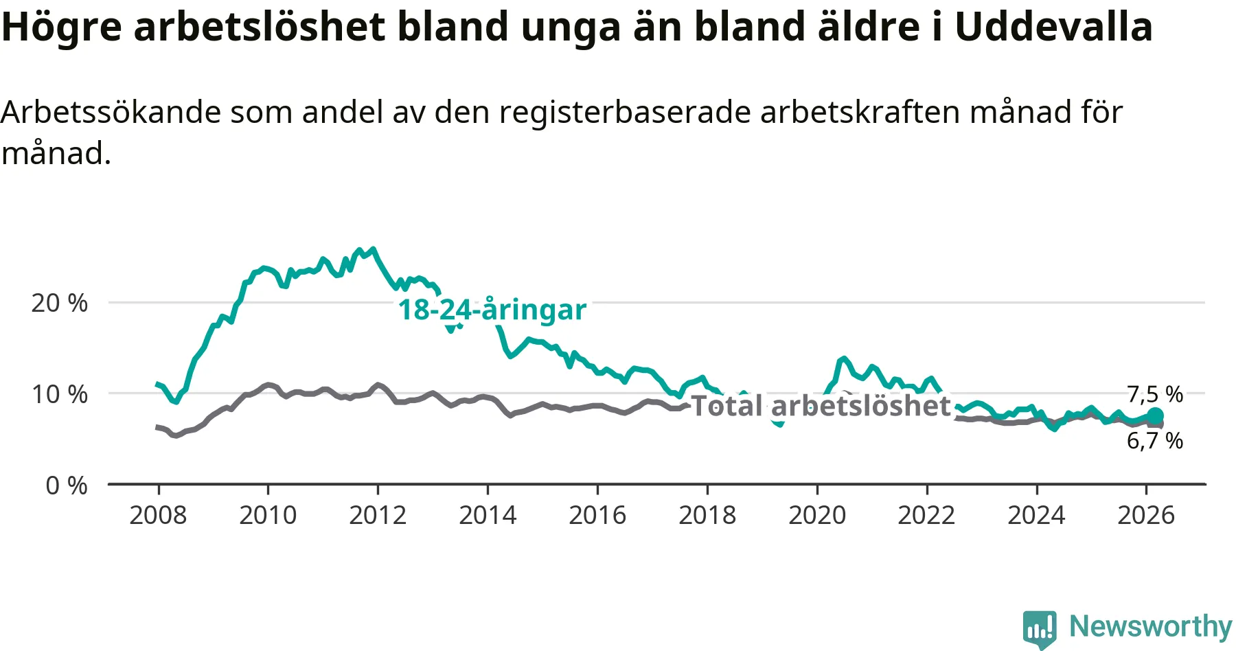 Till skillnad från den totala arbetslösheten står arbetslösheten bland unga stilla. I mars var 7,5 procent av 18–24-åringarna inskrivna som arbetssökande (motsvarande 221 personer).