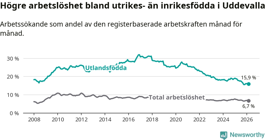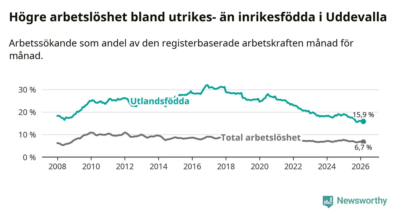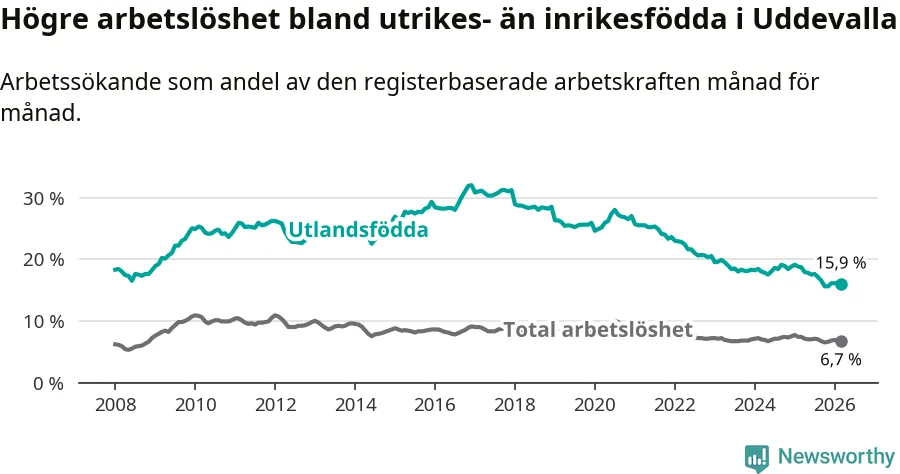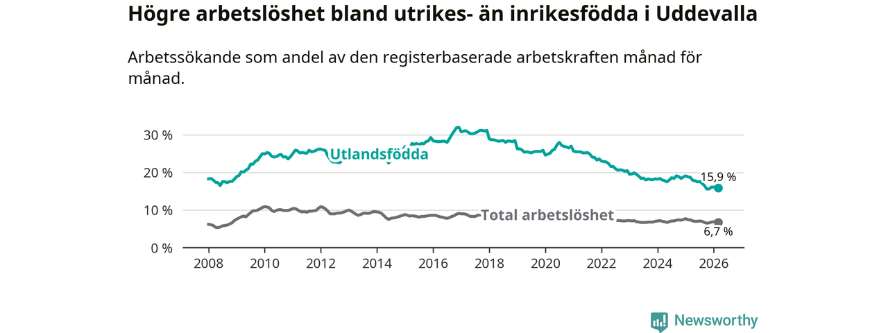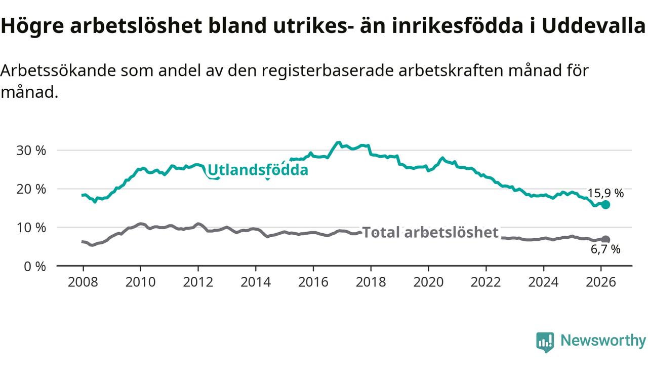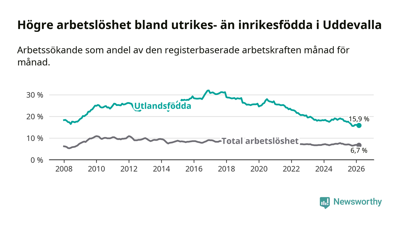 Arbetslösheten bland utlandsfödda var 15,9 procent i Uddevalla under mars månad, motsvarande 987 av 6 208 personer. Det är 2,8 procentenheter färre än vid samma tidpunkt i fjol (−164 om man räknar personer). Därmed är de utlandsföddas arbetslöshet lägre än vid samma tidpunkt i fjol för tionde månaden i följd. Sedan maj 2025 har arbetslösheten bland utlandsfödda minskat från 17,8 till 15,9 procent.