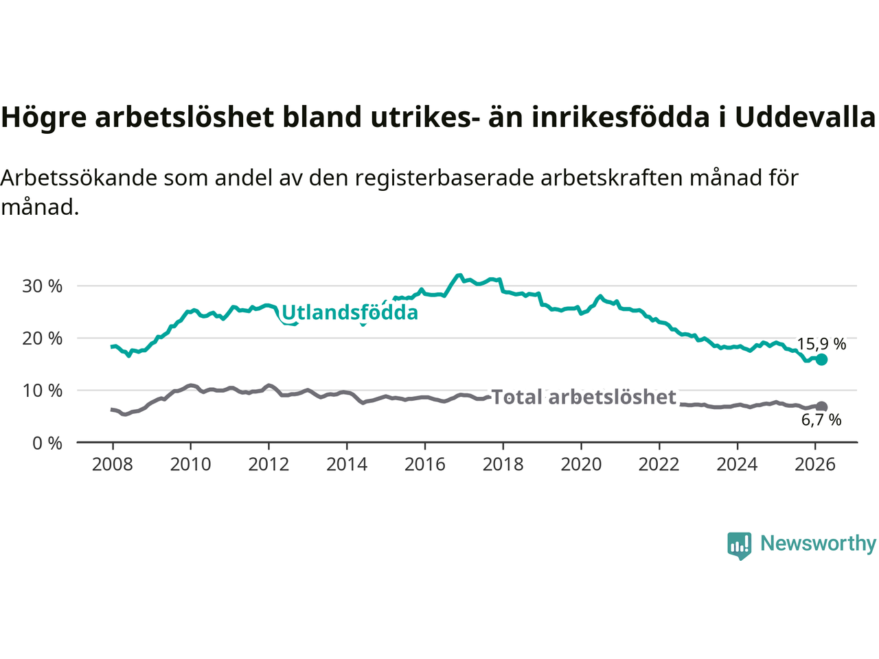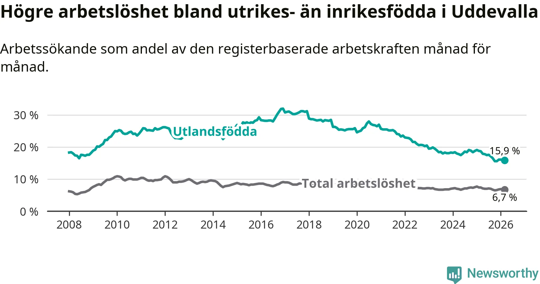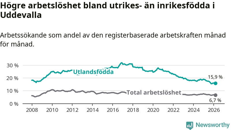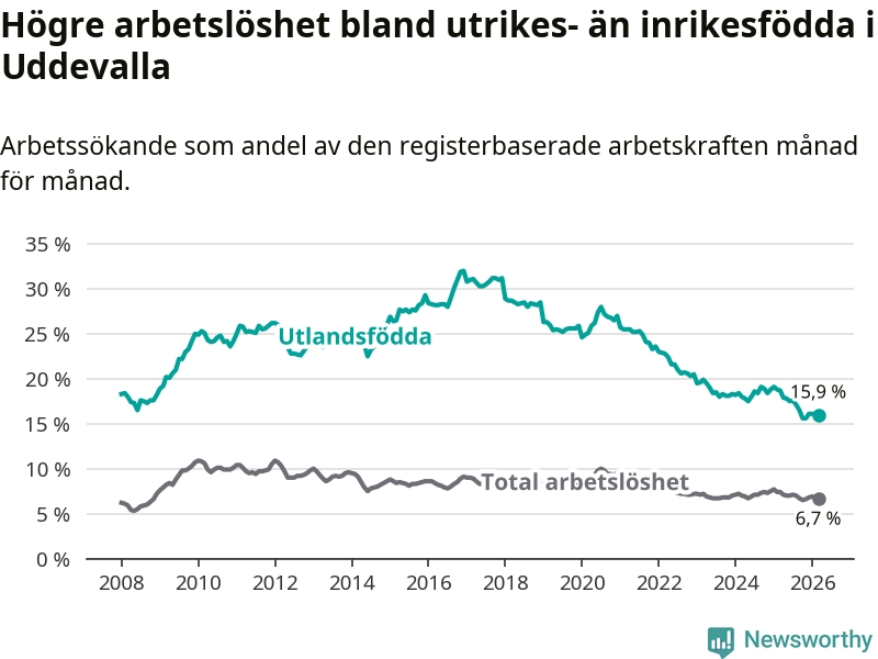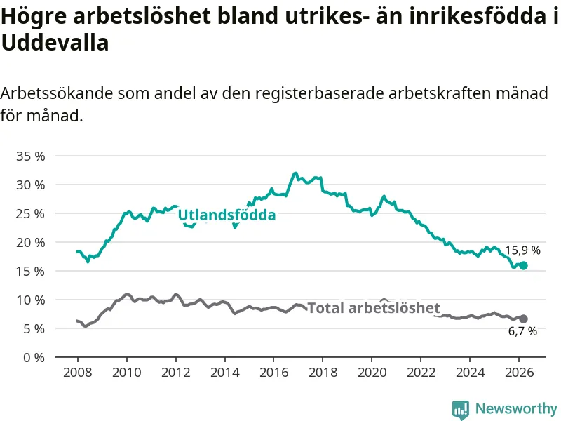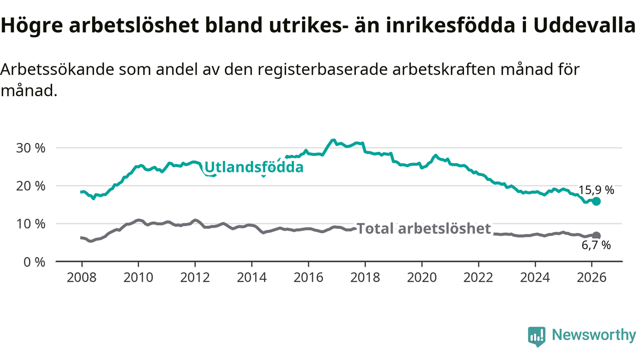 Arbetslösheten bland utlandsfödda var 15,9 procent i Uddevalla under mars månad, motsvarande 987 av 6 208 personer. Det är 2,8 procentenheter färre än vid samma tidpunkt i fjol (−164 om man räknar personer). Därmed är de utlandsföddas arbetslöshet lägre än vid samma tidpunkt i fjol för tionde månaden i följd. Sedan maj 2025 har arbetslösheten bland utlandsfödda minskat från 17,8 till 15,9 procent.