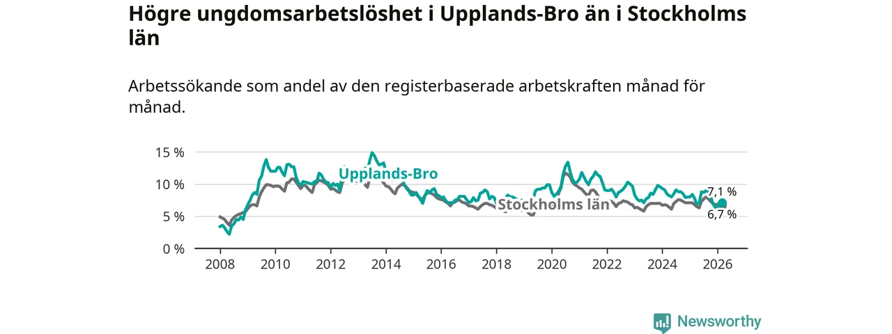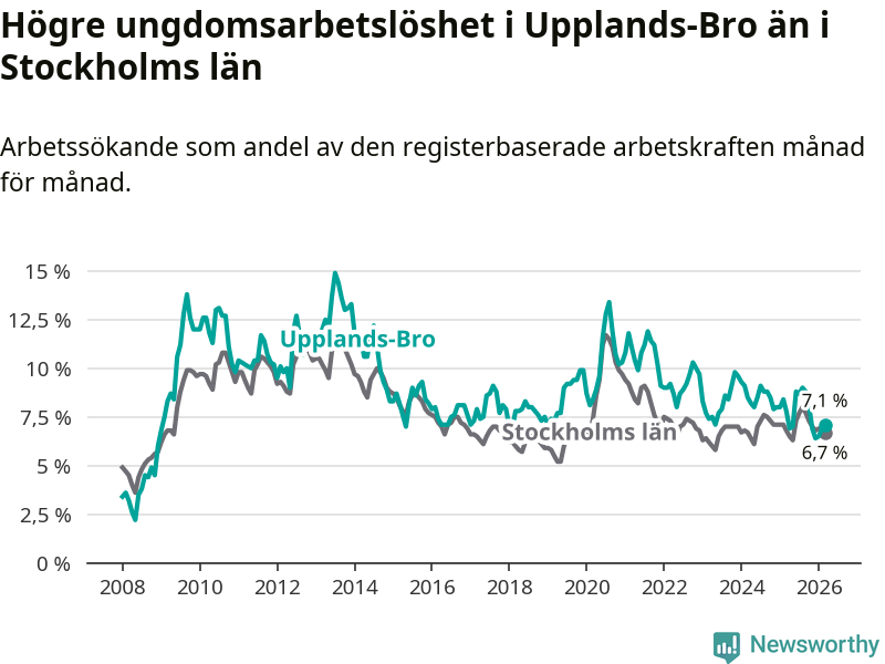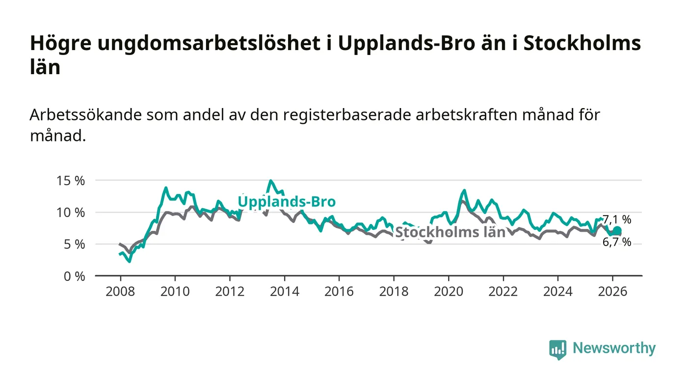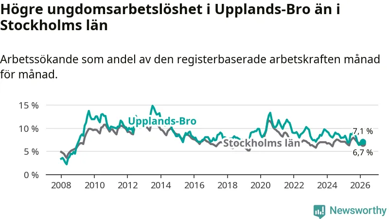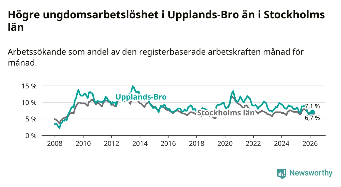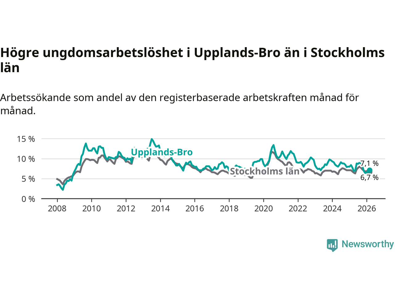 Precis som den totala arbetslösheten ligger ungdomsarbetslösheten i Upplands-Bro högre än i Stockholms län som helhet. Skillnaden mellan kommunen och länet är 0,4 procentenheter.