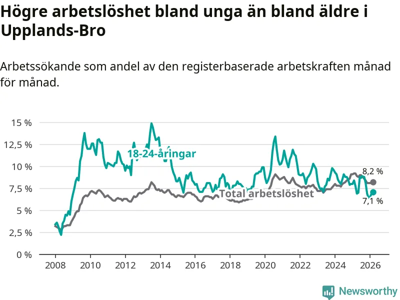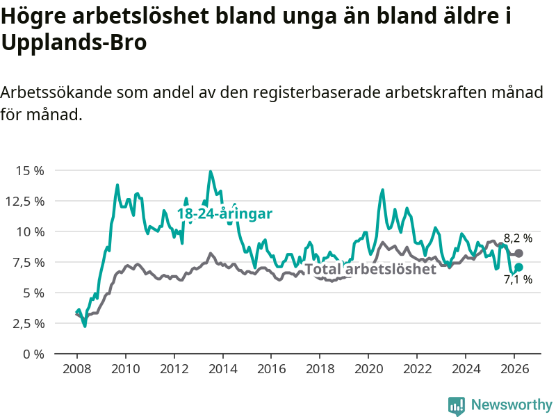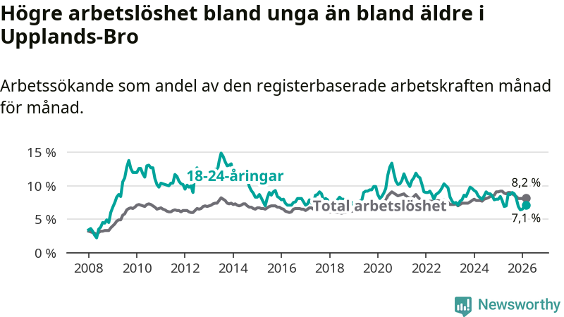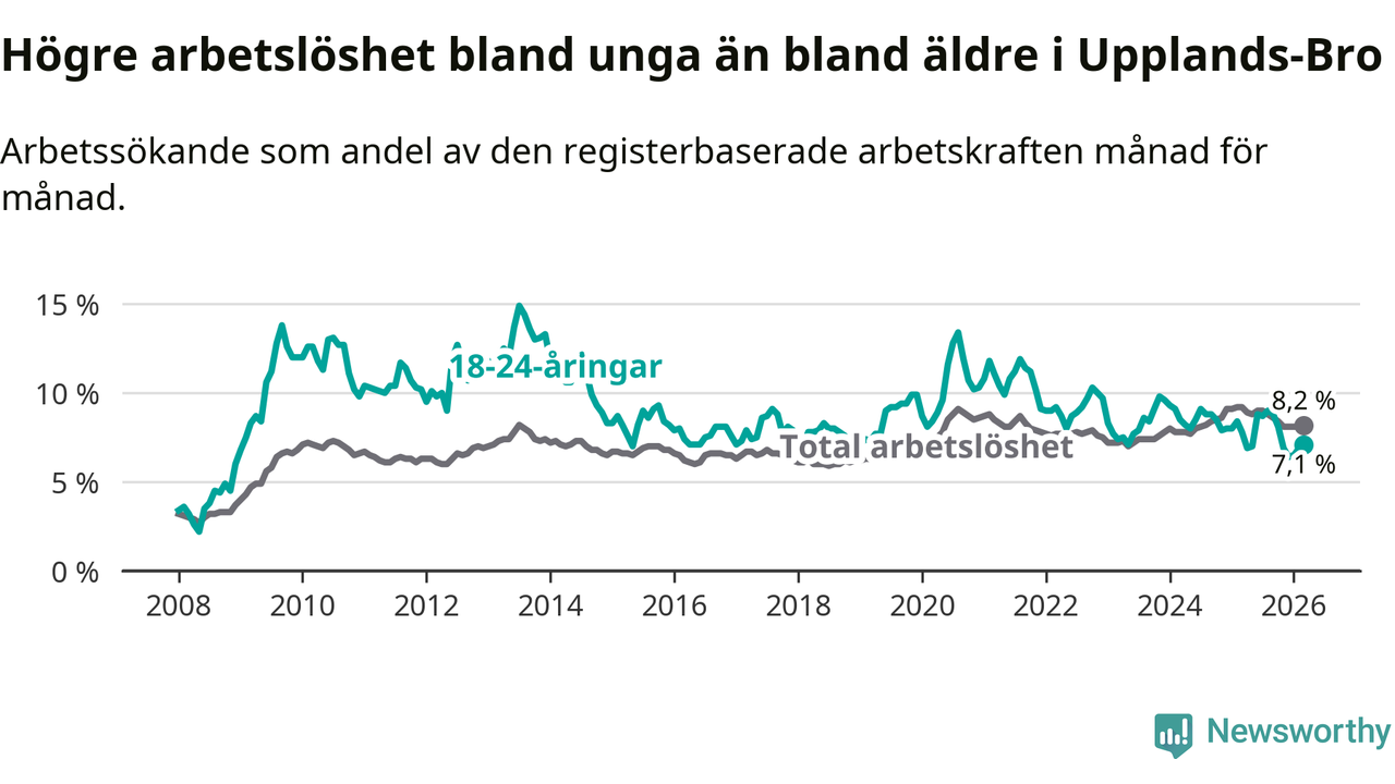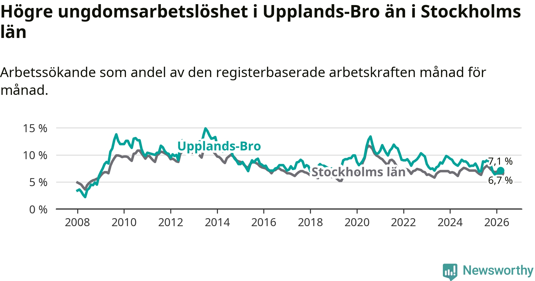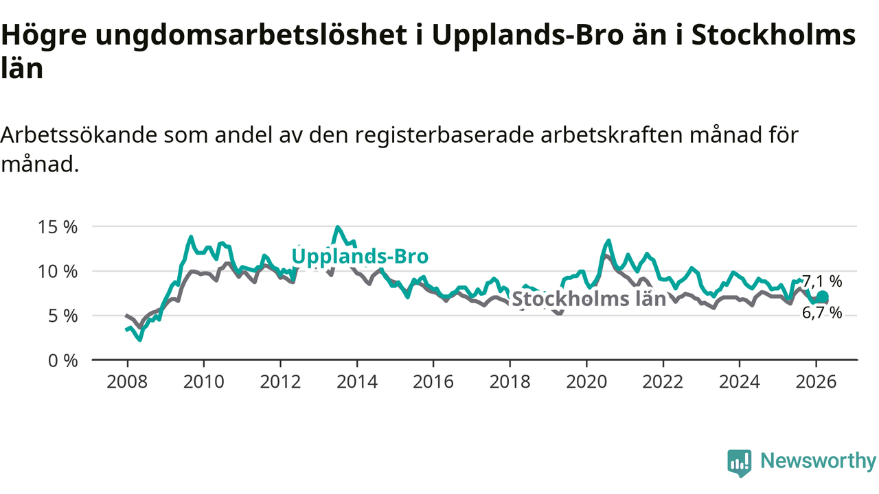 Precis som den totala arbetslösheten ligger ungdomsarbetslösheten i Upplands-Bro högre än i Stockholms län som helhet. Skillnaden mellan kommunen och länet är 0,4 procentenheter.