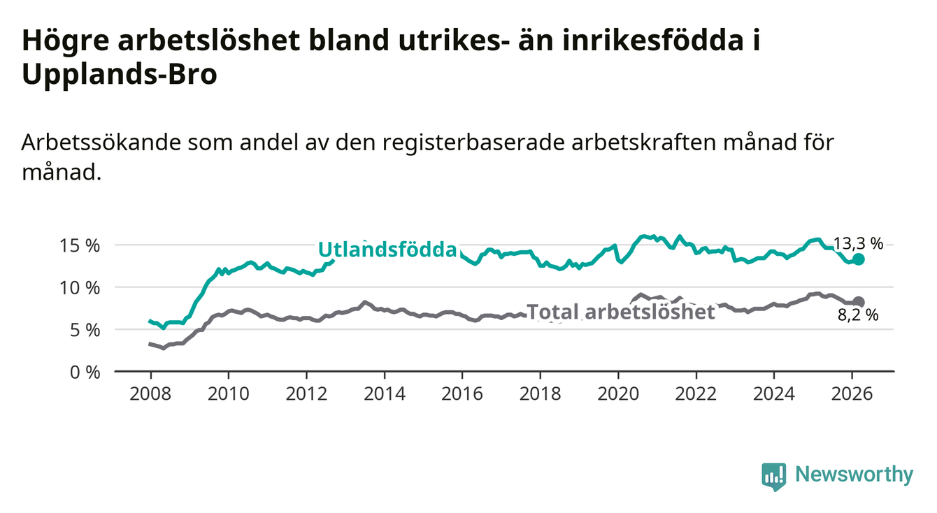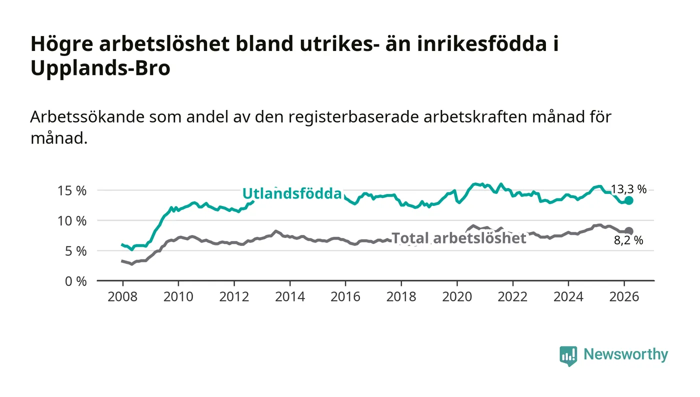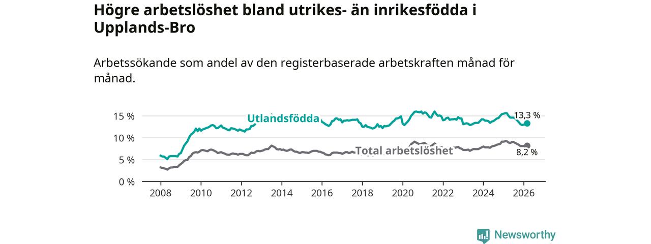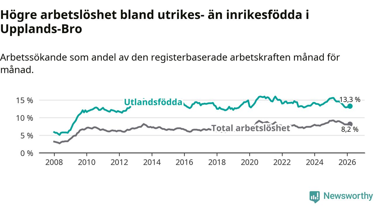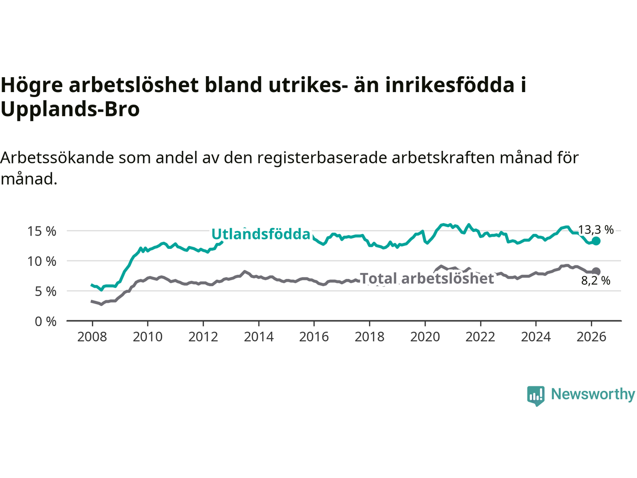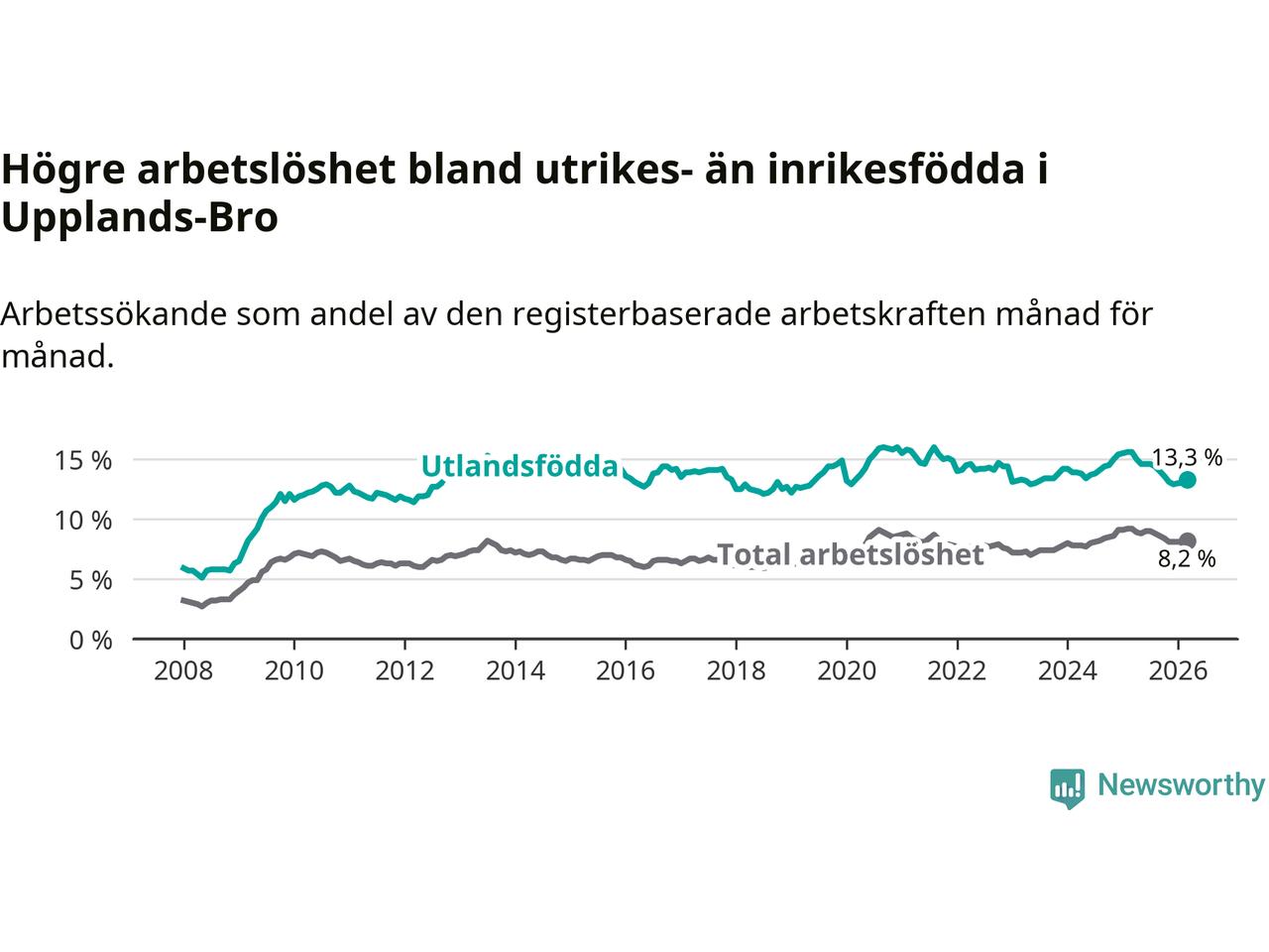 Arbetslösheten bland utlandsfödda var 13,3 procent i Upplands-Bro under mars månad, motsvarande 975 av 7 331 personer. Det är 2,3 procentenheter färre än vid samma tidpunkt i fjol (−127 om man räknar personer). Därmed är de utlandsföddas arbetslöshet lägre än vid samma tidpunkt i fjol för sjunde månaden i följd. Sedan augusti 2025 har arbetslösheten bland utlandsfödda minskat från 14,4 till 13,3 procent.