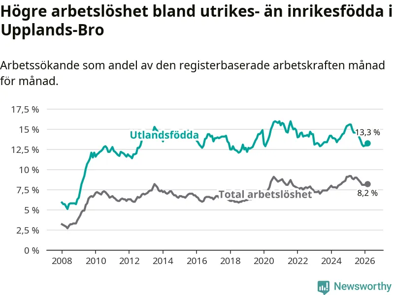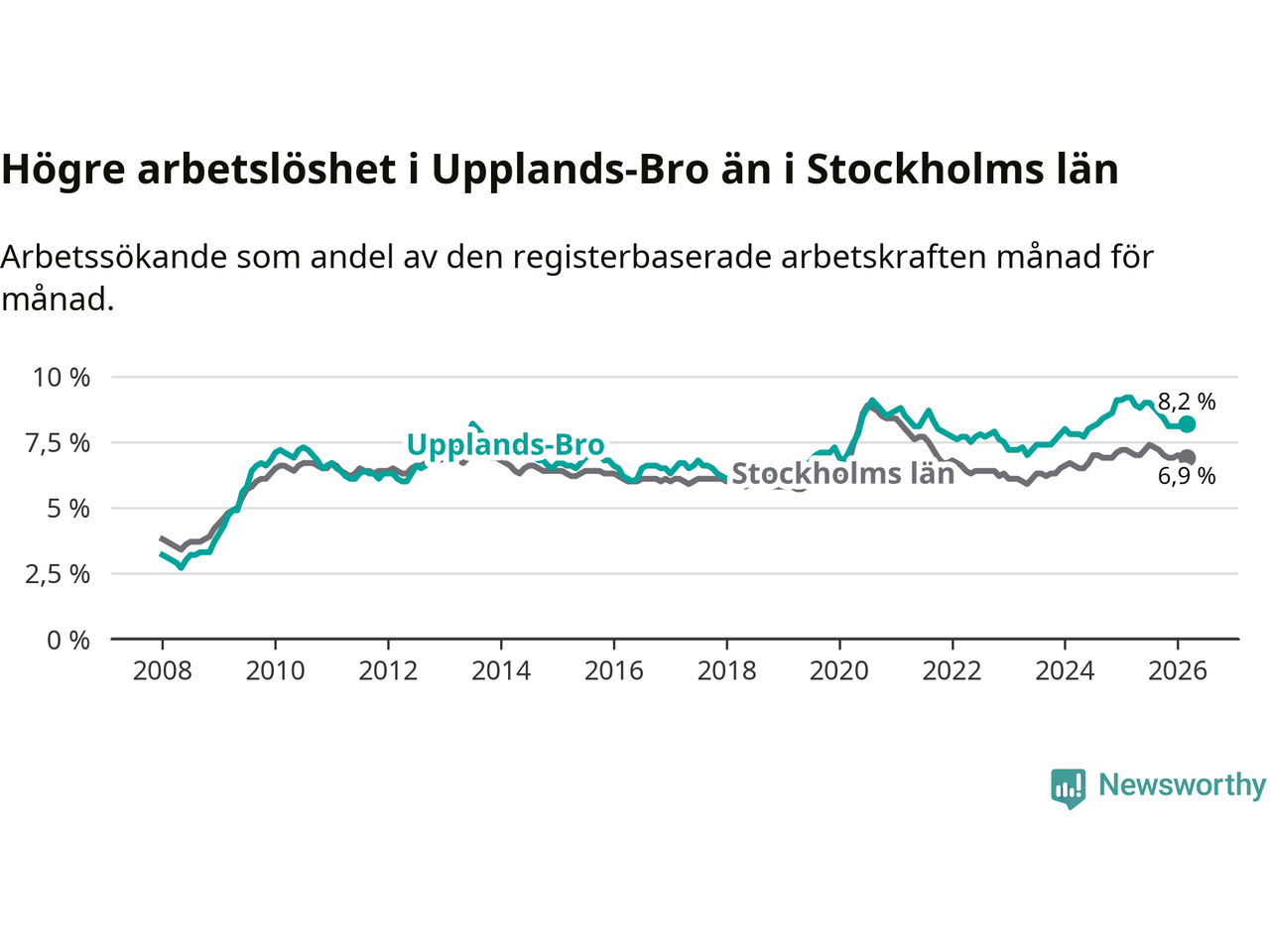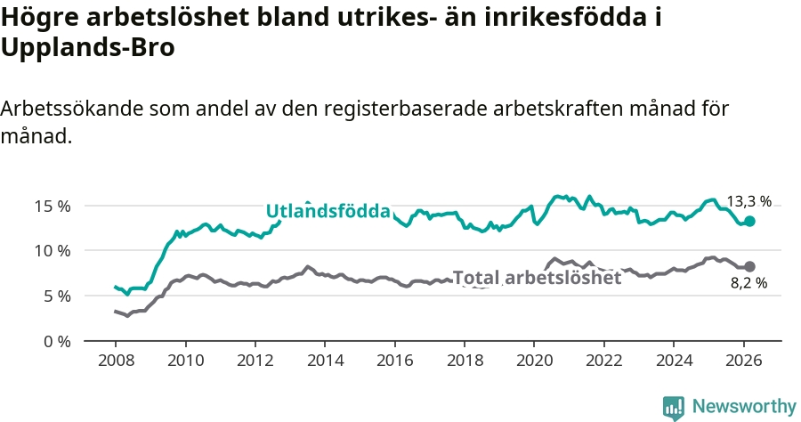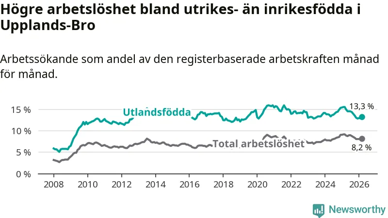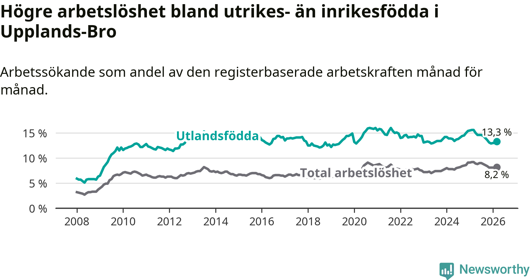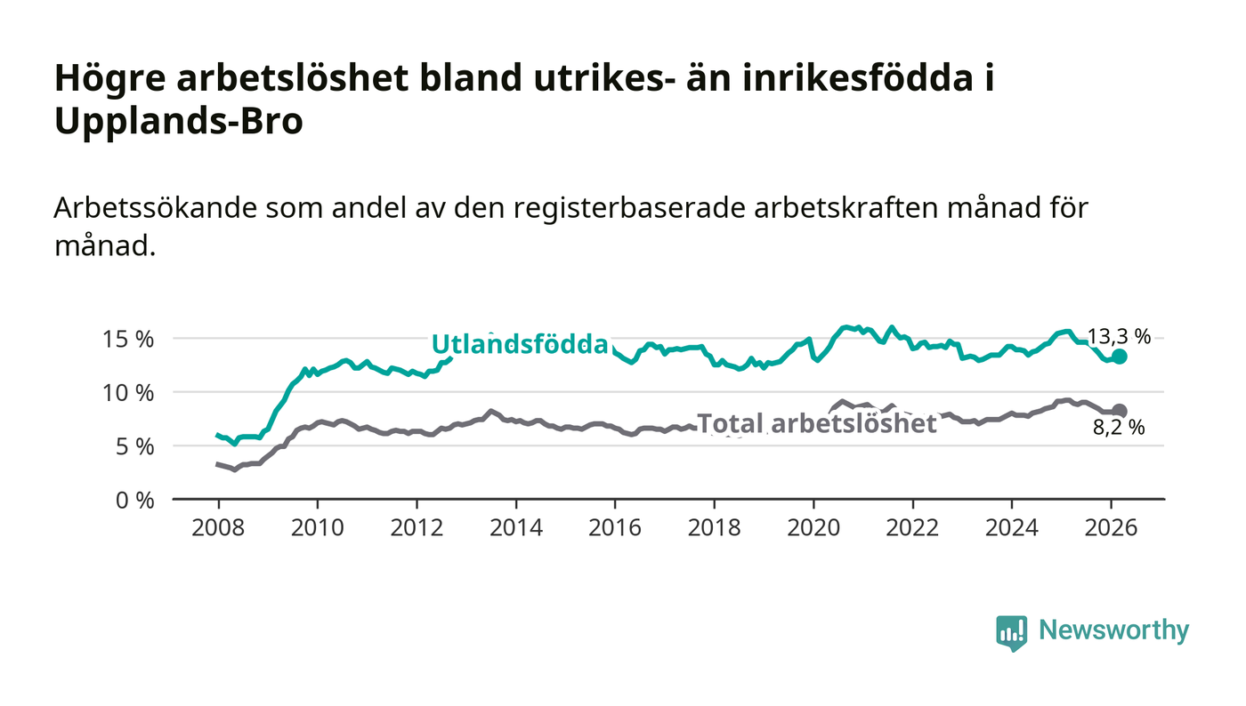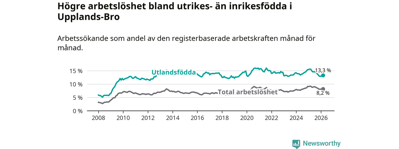 Arbetslösheten bland utlandsfödda var 13,3 procent i Upplands-Bro under mars månad, motsvarande 975 av 7 331 personer. Det är 2,3 procentenheter färre än vid samma tidpunkt i fjol (−127 om man räknar personer). Därmed är de utlandsföddas arbetslöshet lägre än vid samma tidpunkt i fjol för sjunde månaden i följd. Sedan augusti 2025 har arbetslösheten bland utlandsfödda minskat från 14,4 till 13,3 procent.