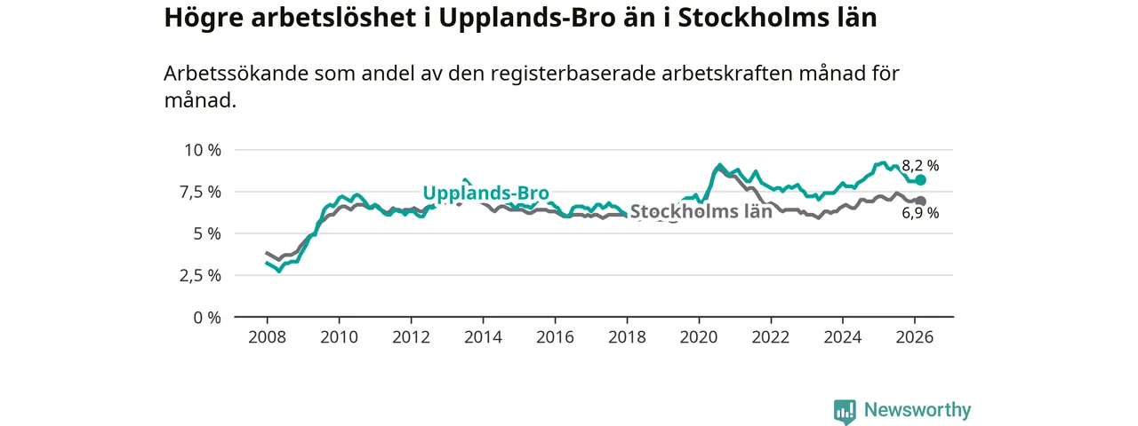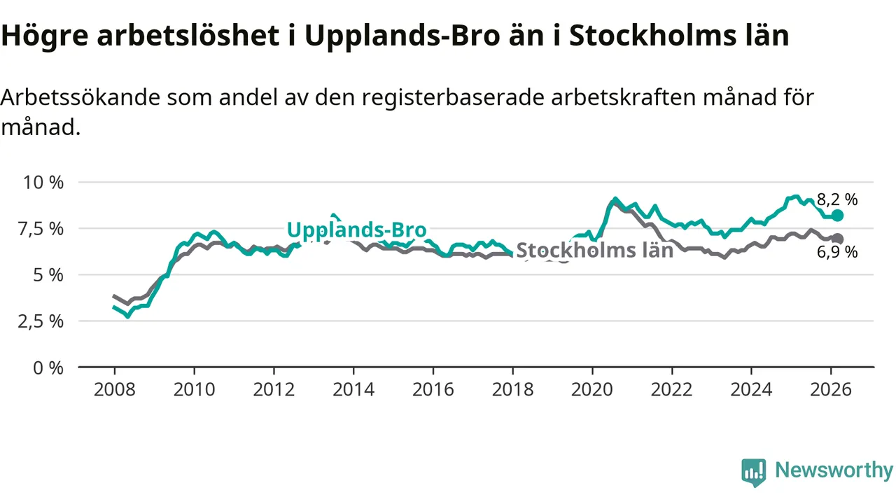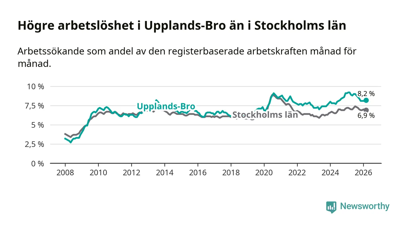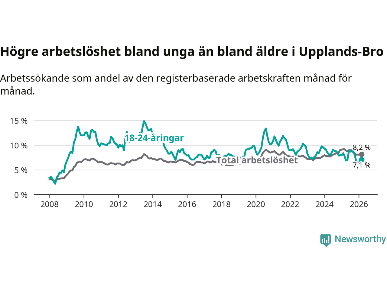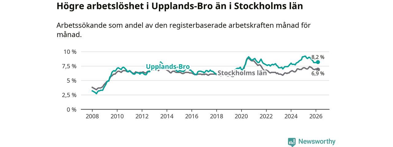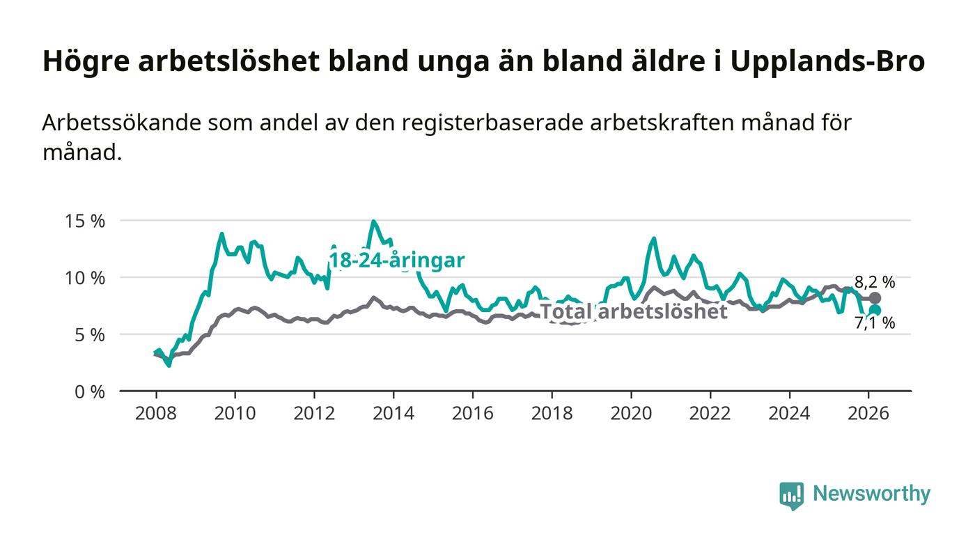 Arbetslösheten bland utlandsfödda var 13,3 procent i Upplands-Bro under mars månad, motsvarande 975 av 7 331 personer. Det är 2,3 procentenheter färre än vid samma tidpunkt i fjol (−127 om man räknar personer). Därmed är de utlandsföddas arbetslöshet lägre än vid samma tidpunkt i fjol för sjunde månaden i följd. Sedan augusti 2025 har arbetslösheten bland utlandsfödda minskat från 14,4 till 13,3 procent.