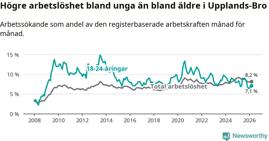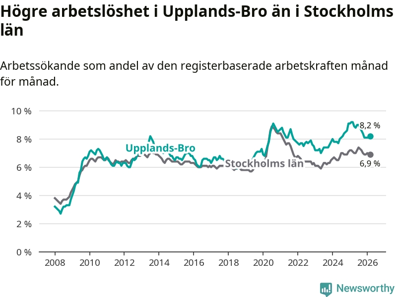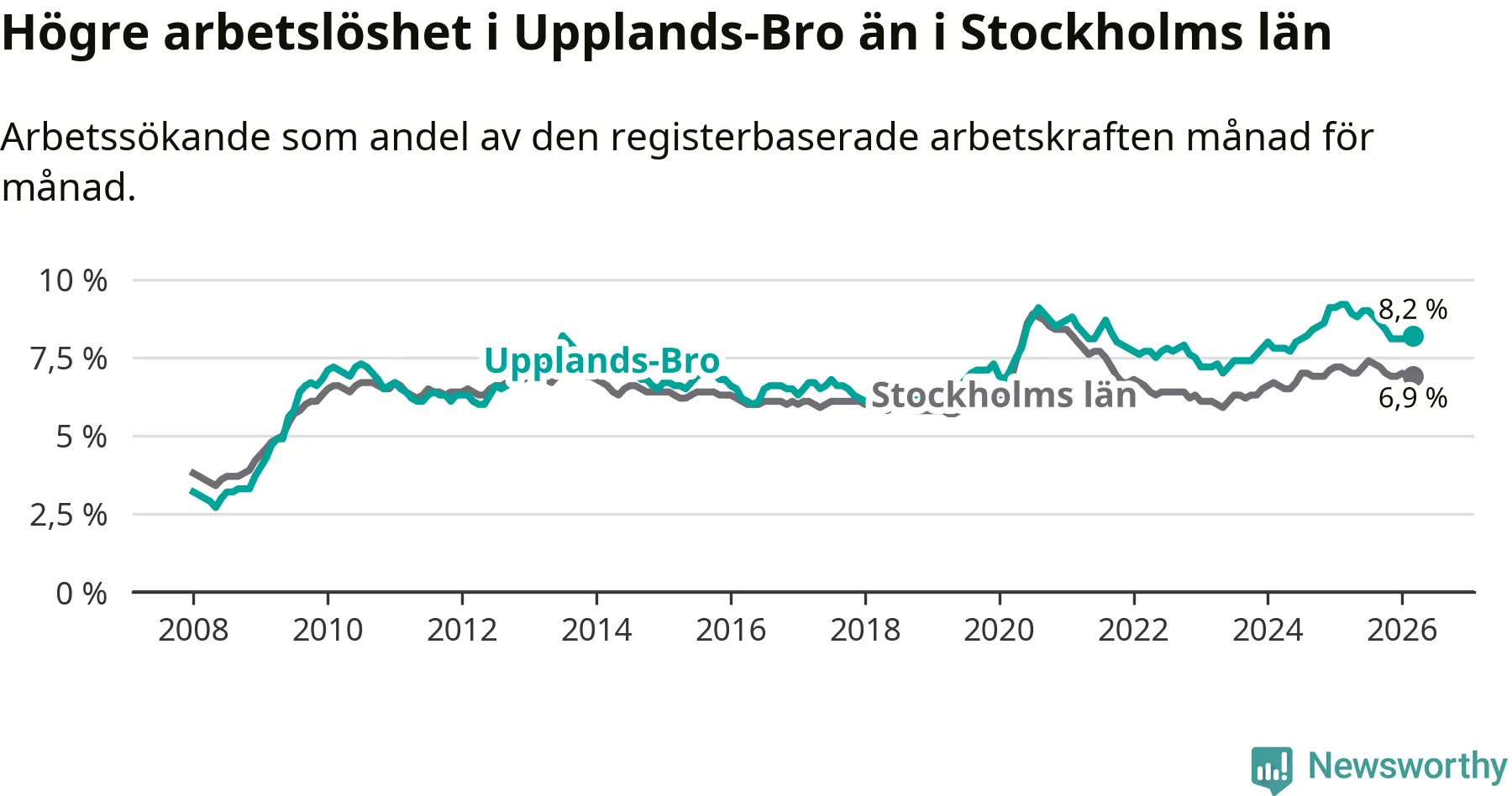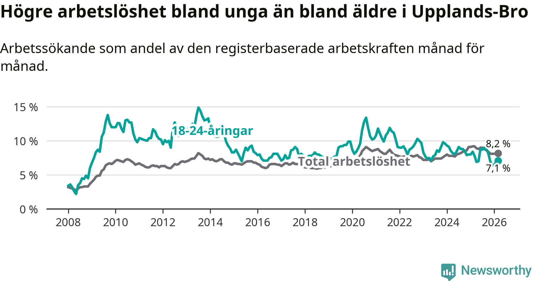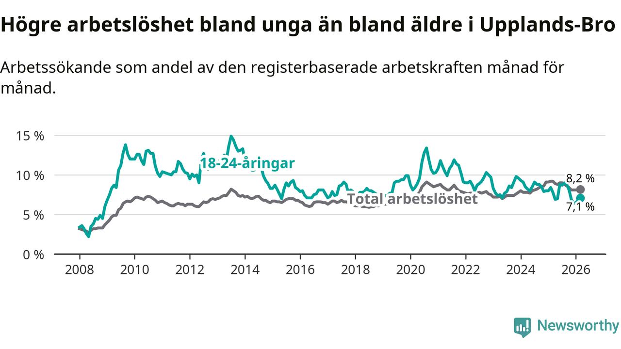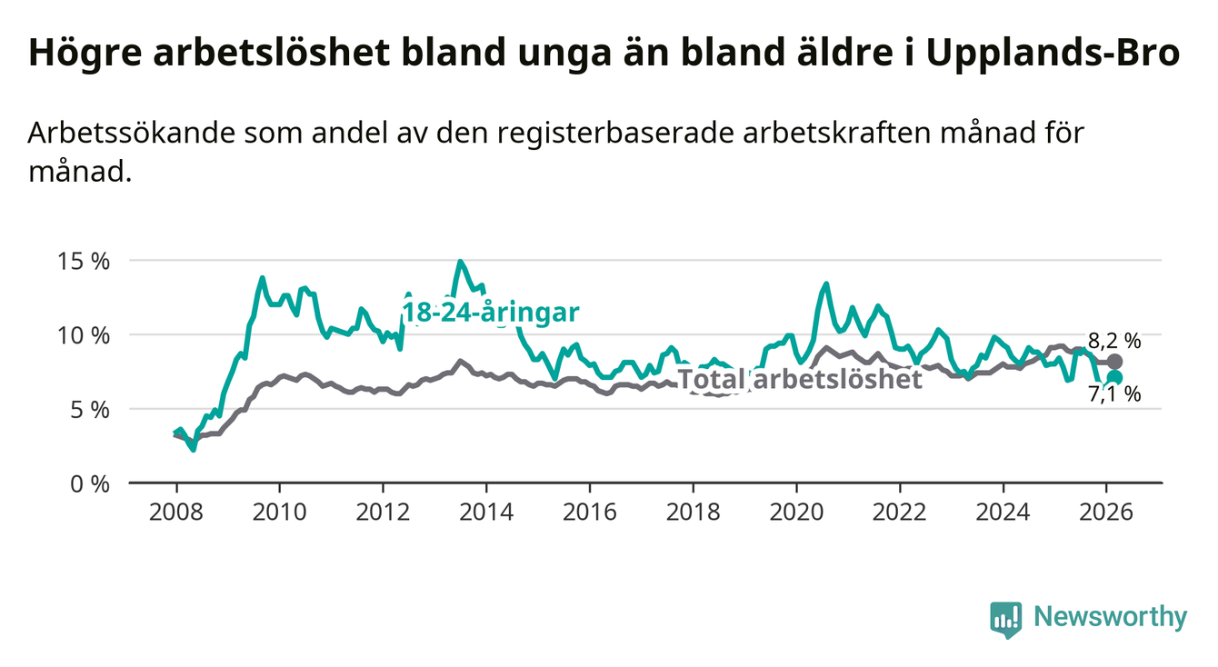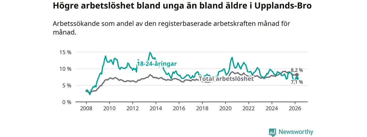 Arbetslösheten bland utlandsfödda var 13,3 procent i Upplands-Bro under mars månad, motsvarande 975 av 7 331 personer. Det är 2,3 procentenheter färre än vid samma tidpunkt i fjol (−127 om man räknar personer). Därmed är de utlandsföddas arbetslöshet lägre än vid samma tidpunkt i fjol för sjunde månaden i följd. Sedan augusti 2025 har arbetslösheten bland utlandsfödda minskat från 14,4 till 13,3 procent.