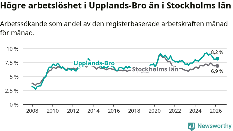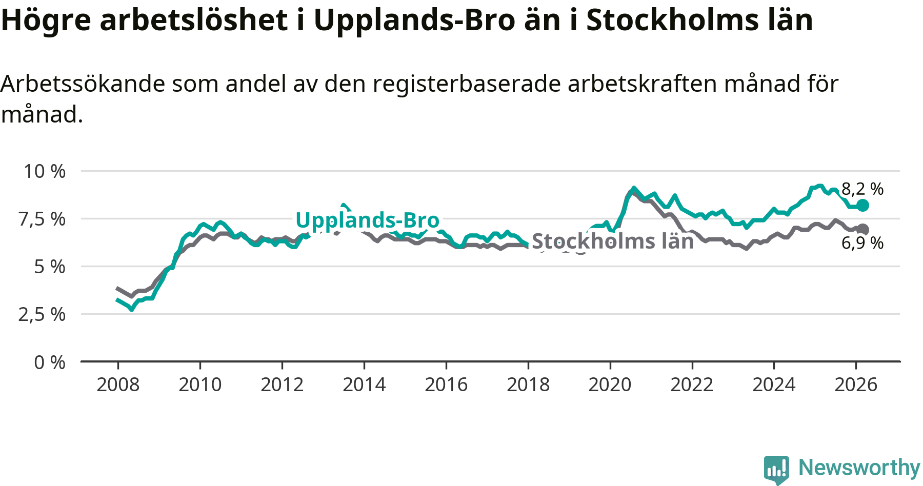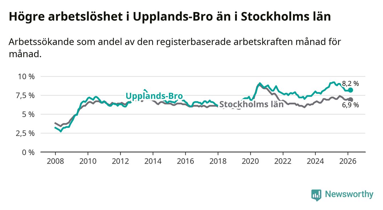 Även om arbetslösheten i Upplands-Bro alltså minskar, så ligger den fortfarande över snittet i hela Stockholms län (8,2 procent i kommunen, jämfört med 6,9 procent i hela länet). Ekerö har den lägsta arbetslösheten i länet (3,6 procent), medan Södertälje har den högsta (10,8 procent). För att Upplands-Bro skulle komma ner i samma arbetslöshetsnivå som Ekerö skulle 784 personer behöva sysselsättas.