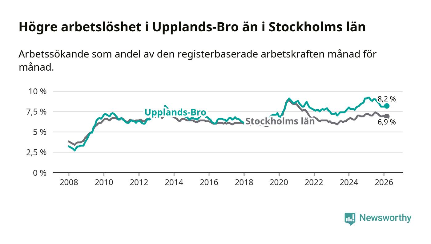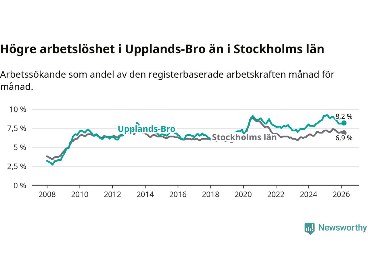 Under mars månad rapporterade Upplands-Bro kommun en total arbetslöshet på 8,2 procent. Det är en minskning jämfört med samma tidpunkt i fjol (−1,0 procentenheter). Även i Stockholms län sjunker arbetslösheten något.