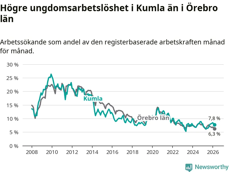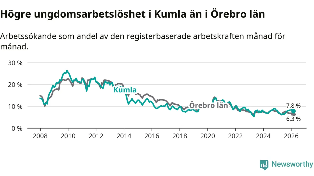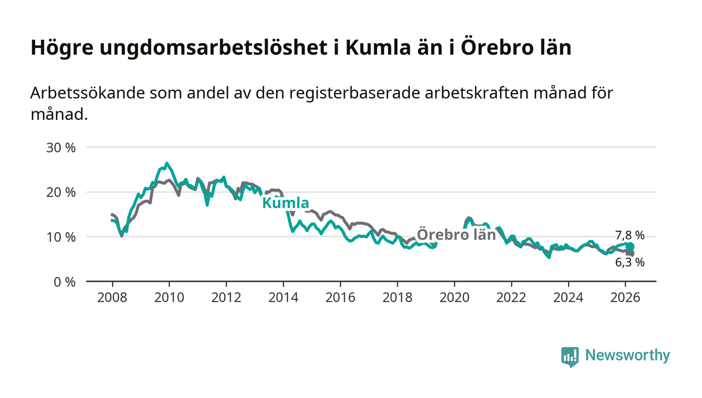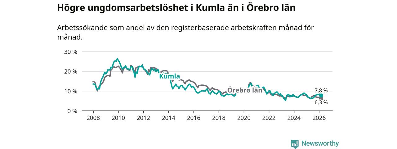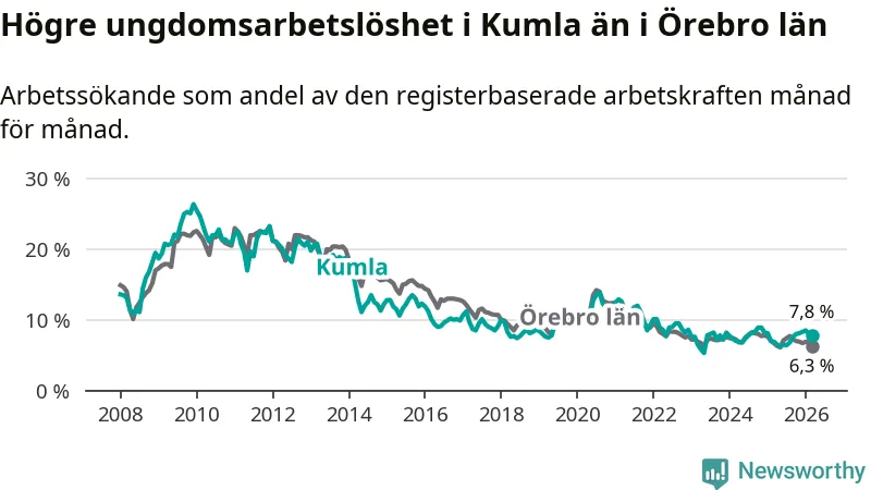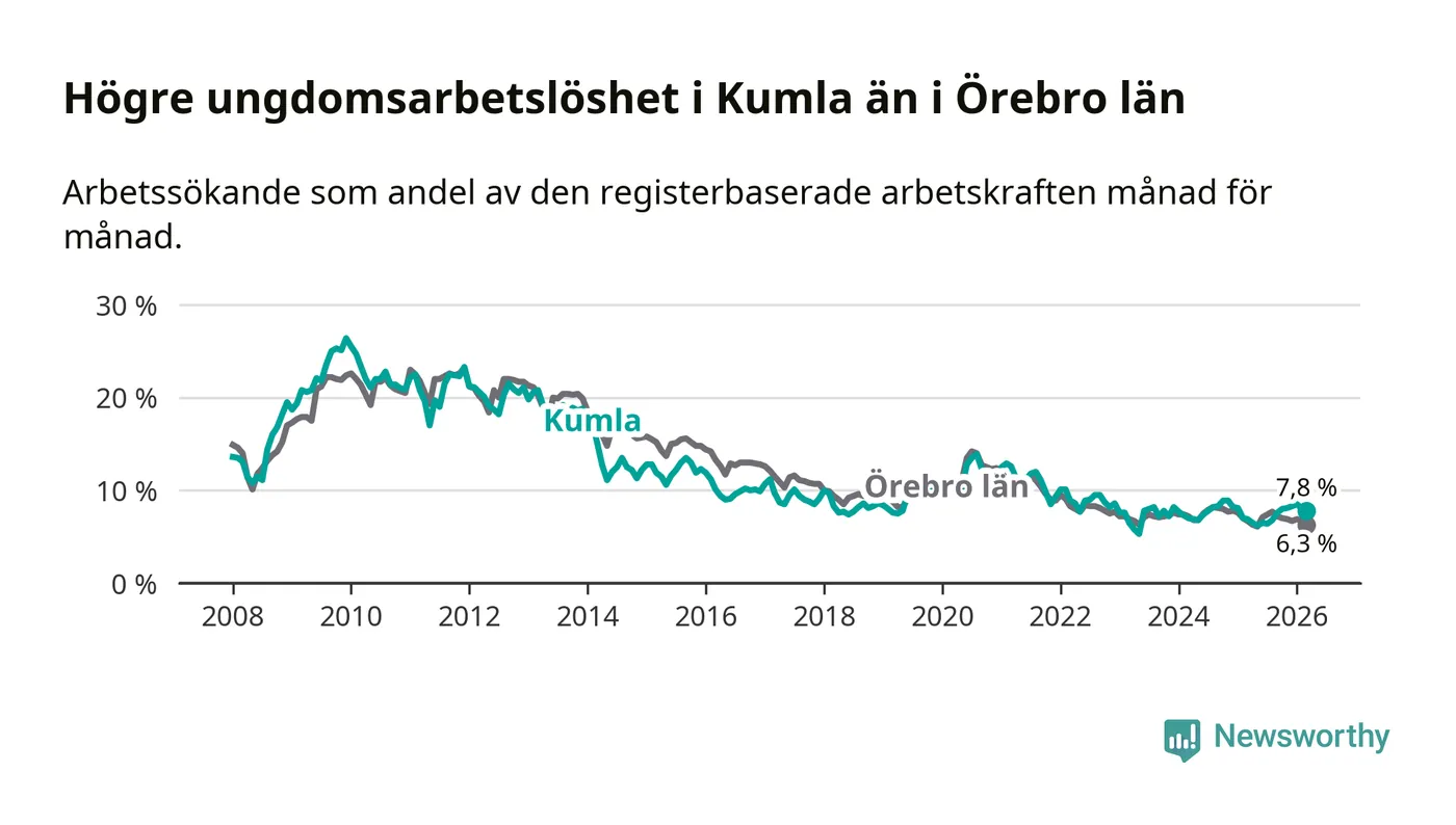 Medan Kumla har lägre total arbetslöshet än Örebro, ligger ungdomsarbetslösheten 1,5 procentenheter högre i Kumla.