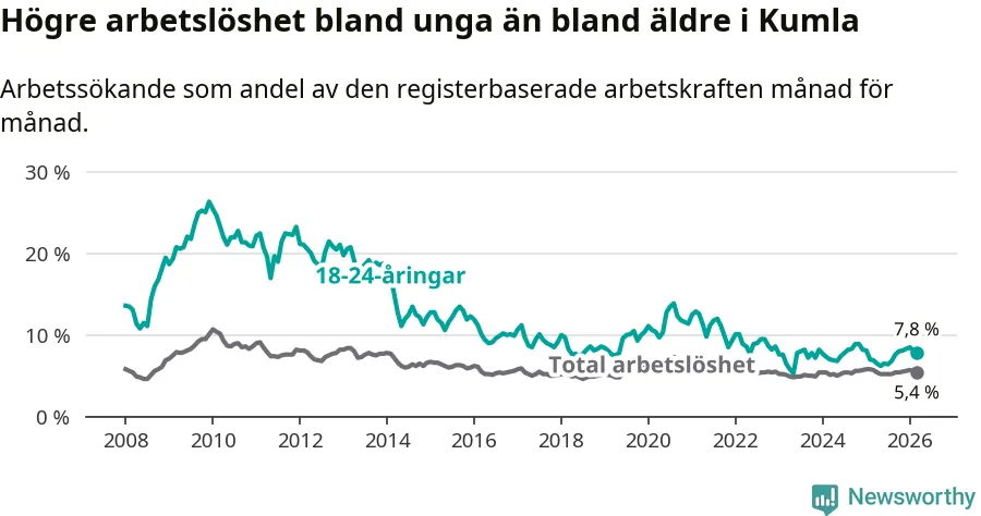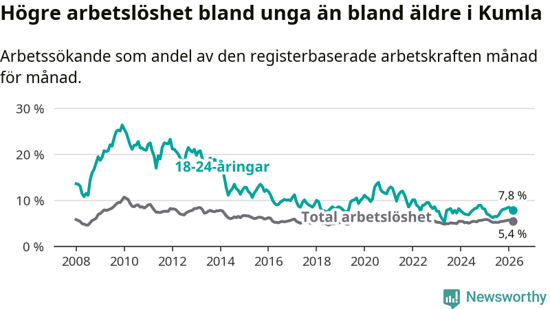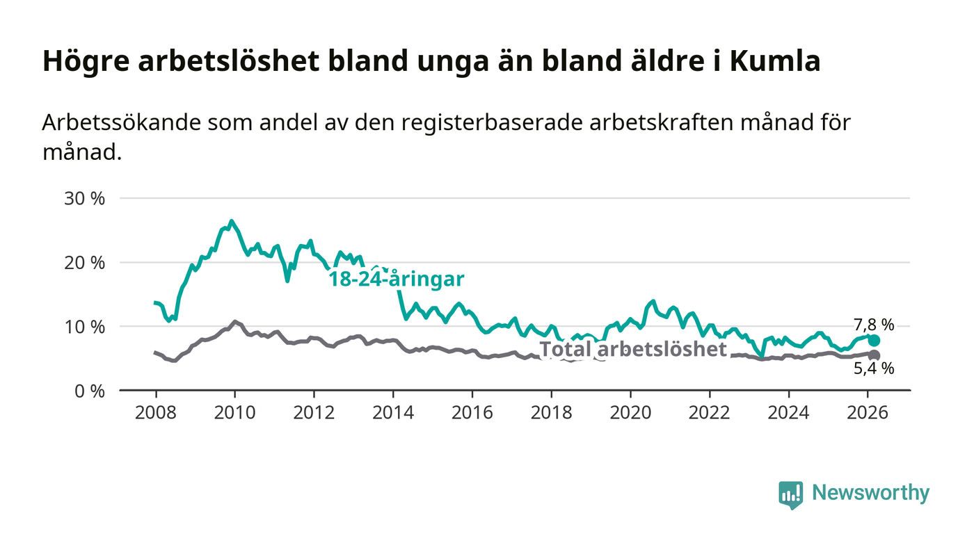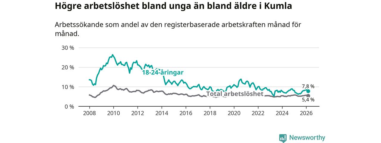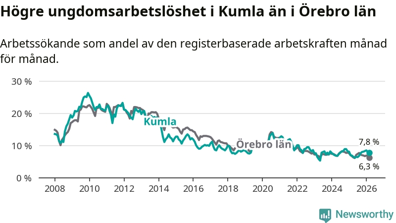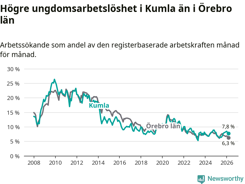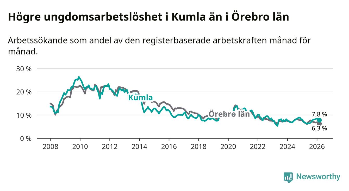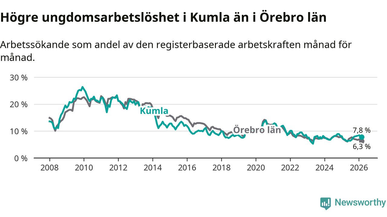 Medan Kumla har lägre total arbetslöshet än Örebro, ligger ungdomsarbetslösheten 1,5 procentenheter högre i Kumla.